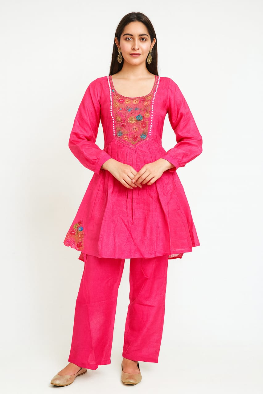 Brighten your ethnic wardrobe with this stunning fuchsia pink short kurta set. The kurta features intricate multicolor thread embroidery on the yoke, adding a touch of festive charm. Designed in a flattering short A-line silhouette, it’s paired with straight pants for a graceful yet comfortable fit. Crafted from a soft and breathable silk blend fabric, this ensemble is perfect for casual gatherings, festive occasions, or daytime