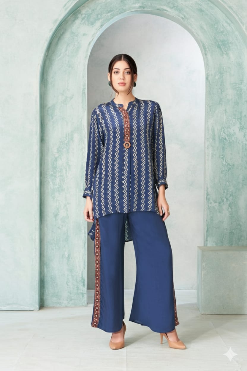A chic two-piece co-ord set featuring a long shirt-style top with side slits paired with wide-leg palazzo pants, giving it a modern yet graceful Indo-Western appeal.