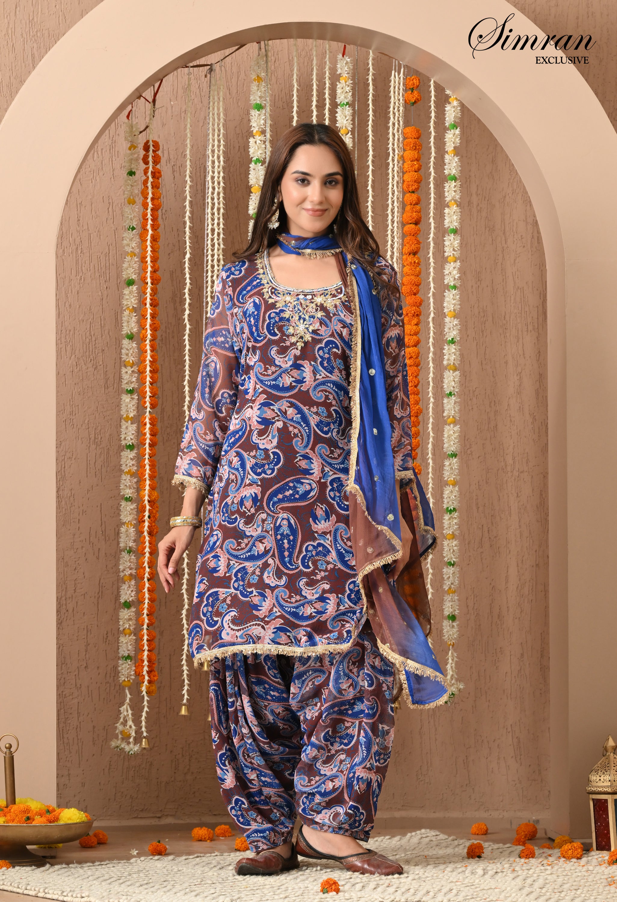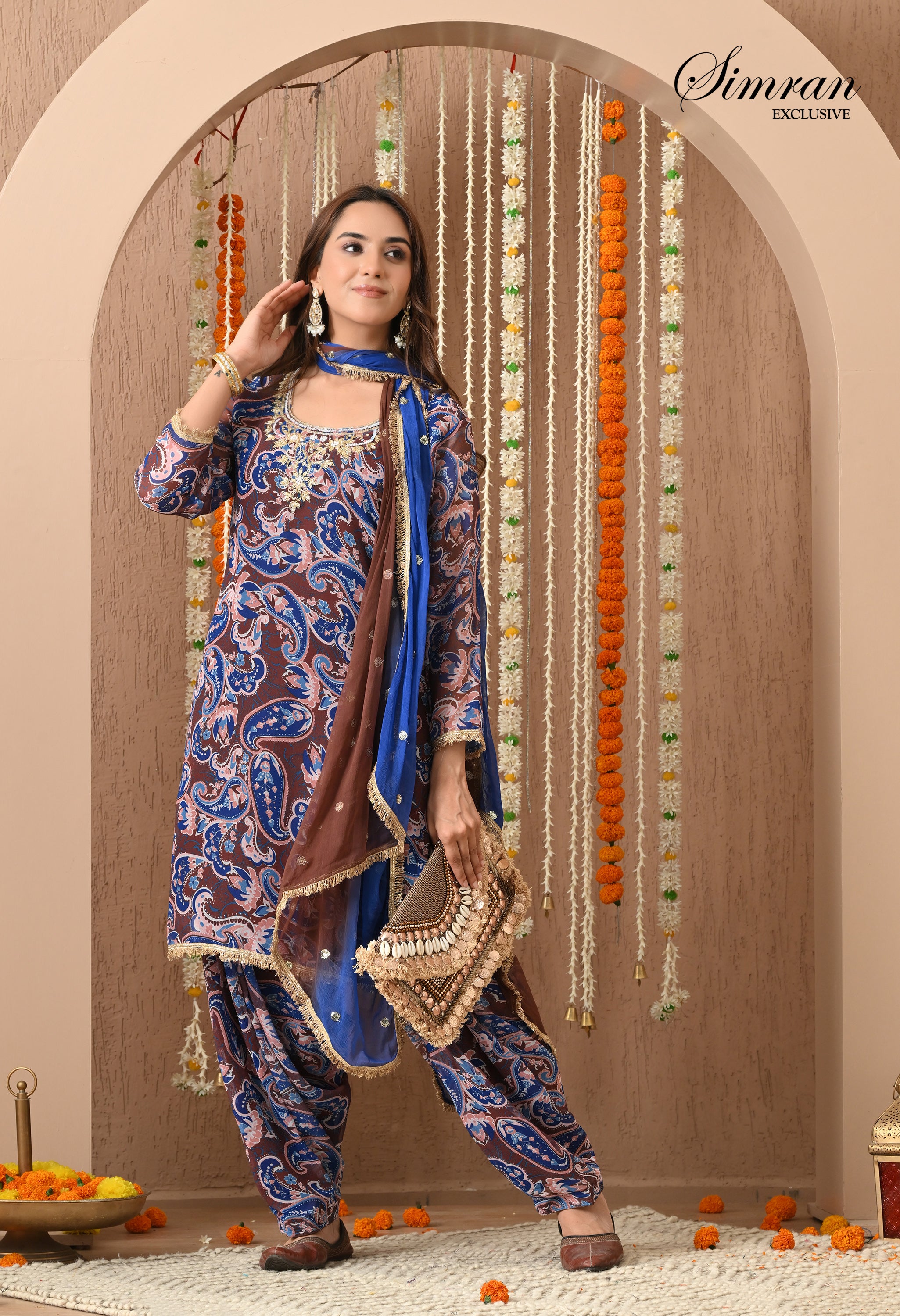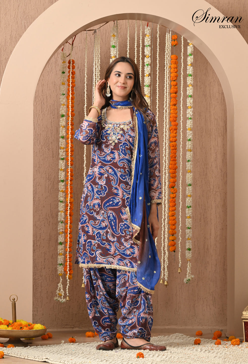 Bring a touch of tradition with this vibrant blue and brown paisley printed Patiala suit set. Paired with a matching dupatta featuring golden lace borders, it is perfect for festive occasions, cultural gatherings, and casual ethnic wear.