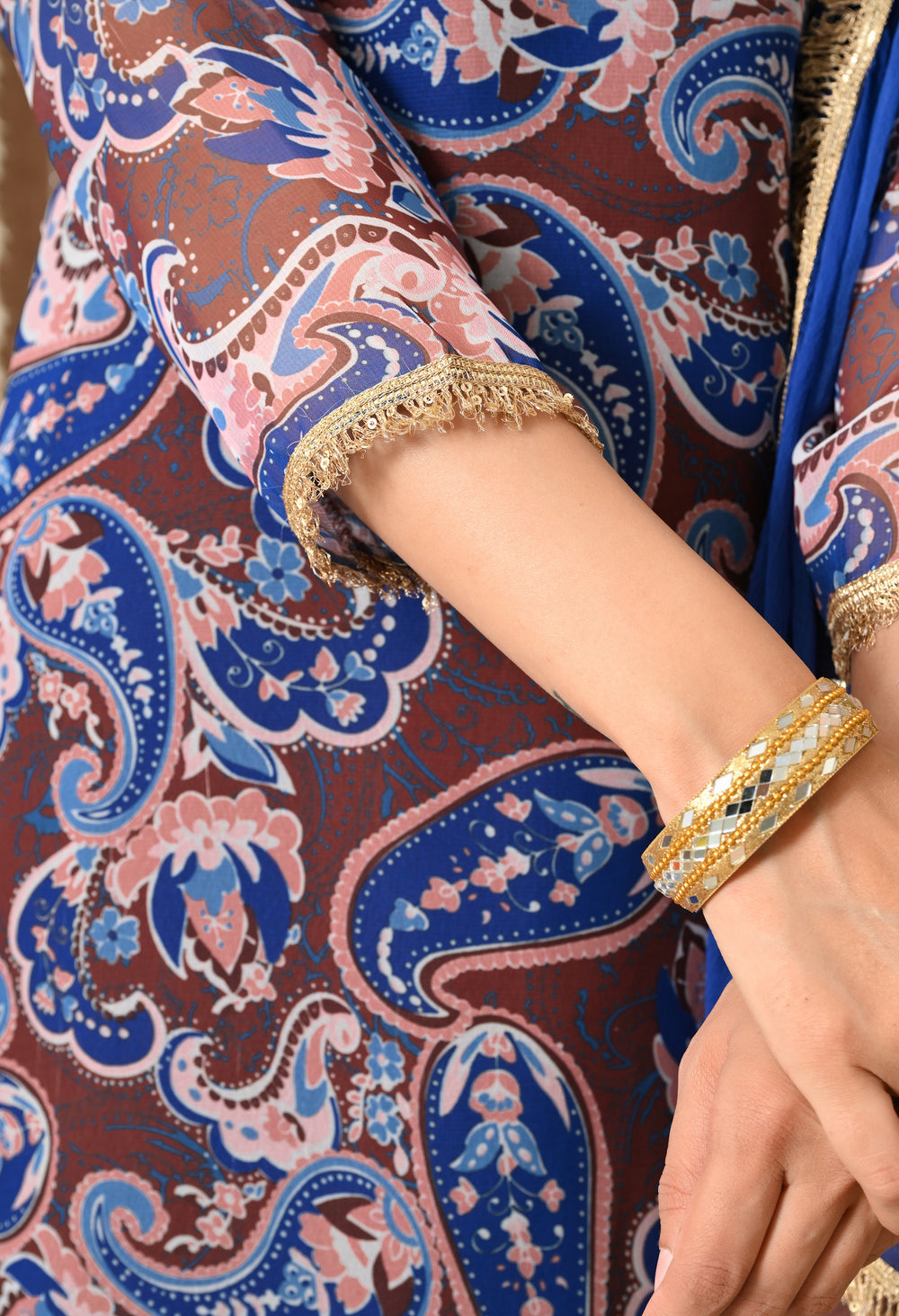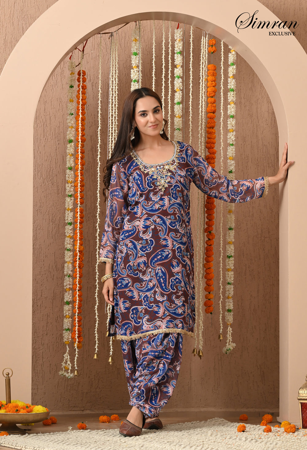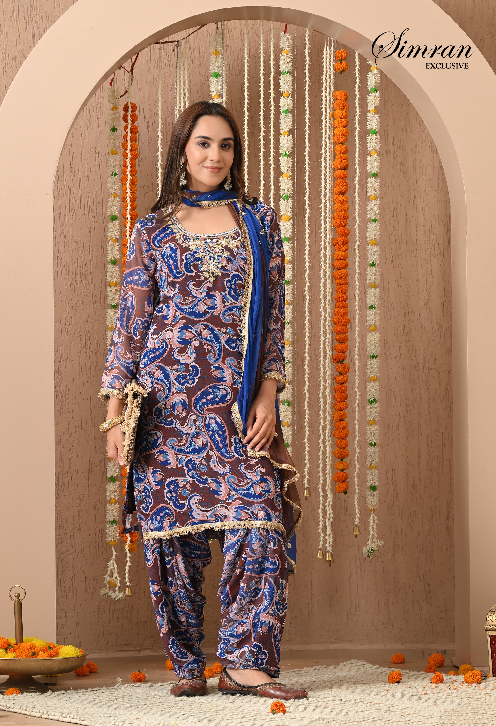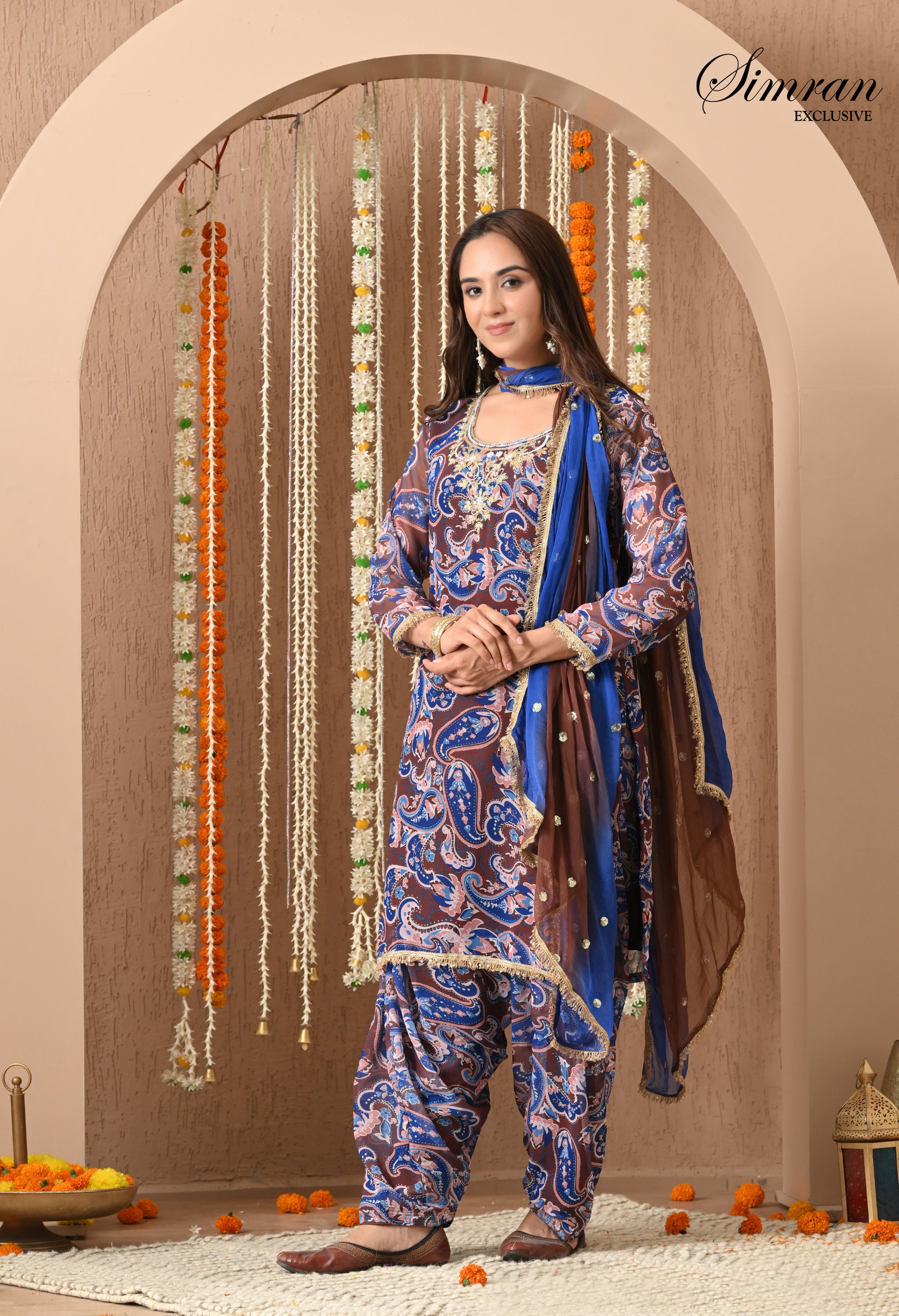 Bring a touch of tradition with this vibrant blue and brown paisley printed Patiala suit set. Paired with a matching dupatta featuring golden lace borders, it is perfect for festive occasions, cultural gatherings, and casual ethnic wear.