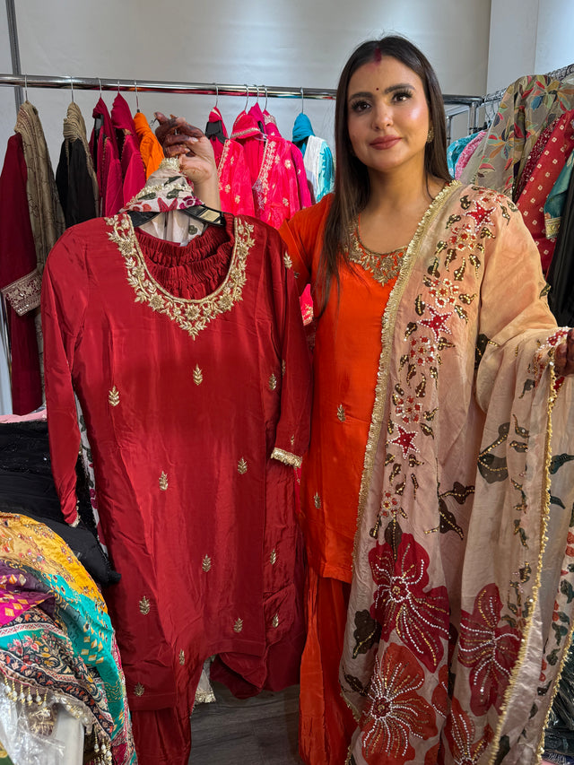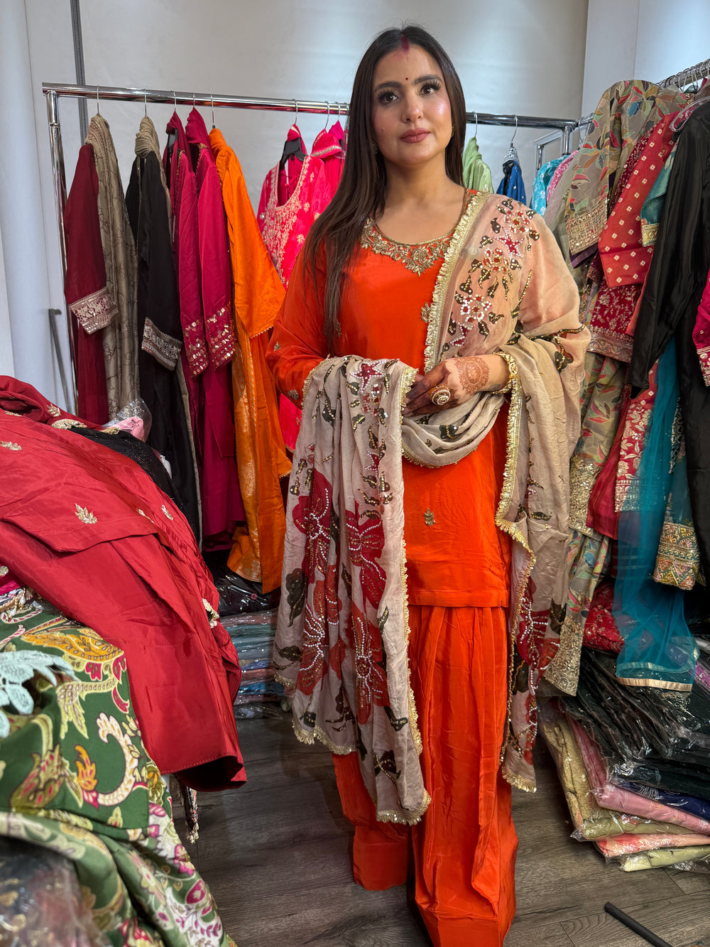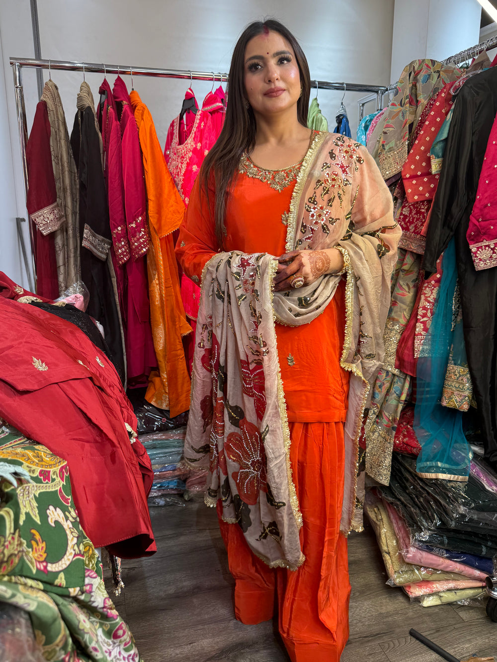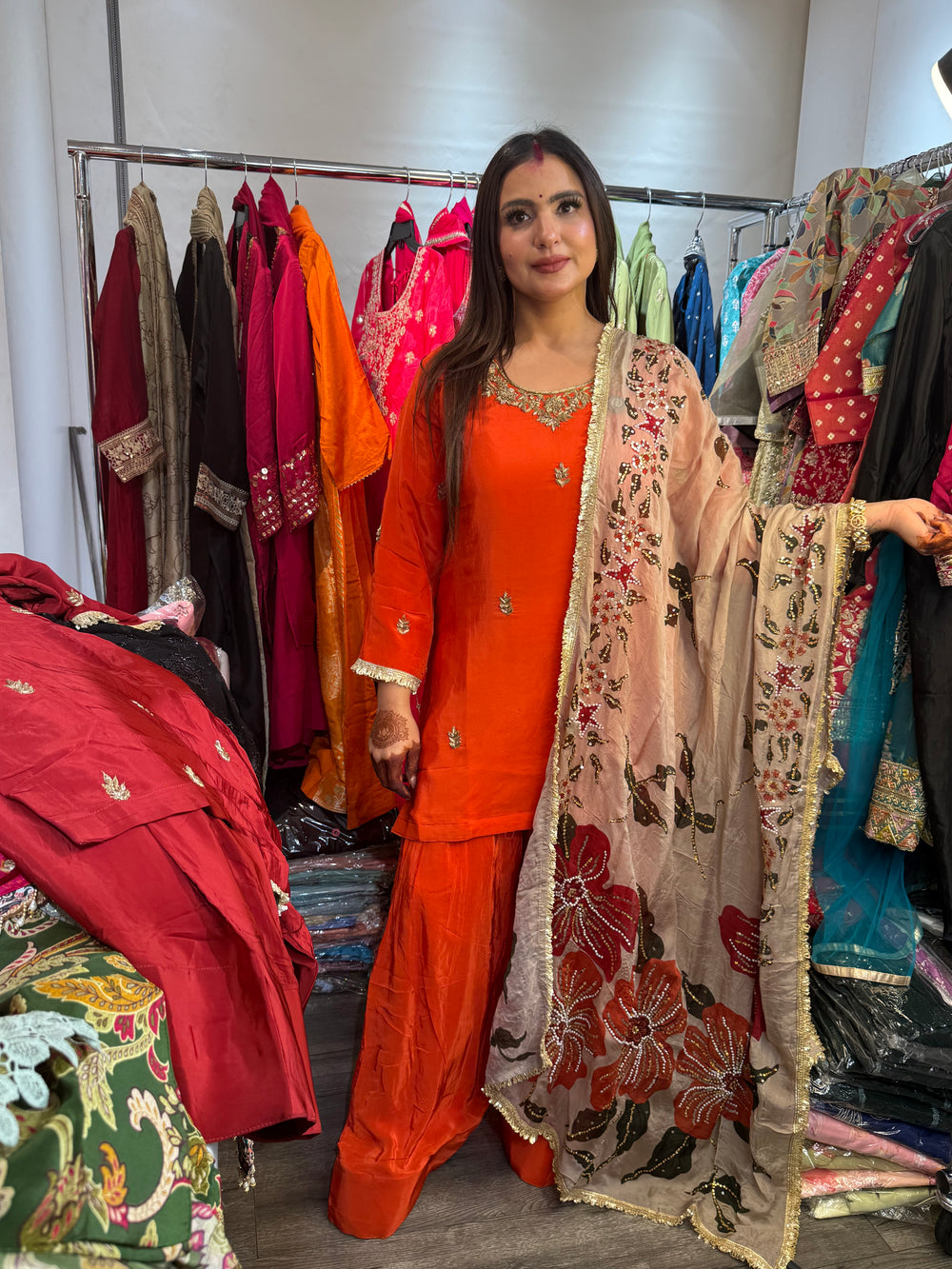 Embrace elegance with ethnic suit set, designed for festive and formal occasions. The set features a straight kurta, wide farshi salwar, and a contrasting dupatta with floral prints, making it a perfect blend of tradition and modern grace.