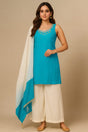 Grace your festive and casual occasions with this elegant aqua blue embroidered Farshi salwar kurta set. this ensemble perfectly balances simplicity with sophistication. Ideal for festive events, get-togethers, or daytime celebrations.