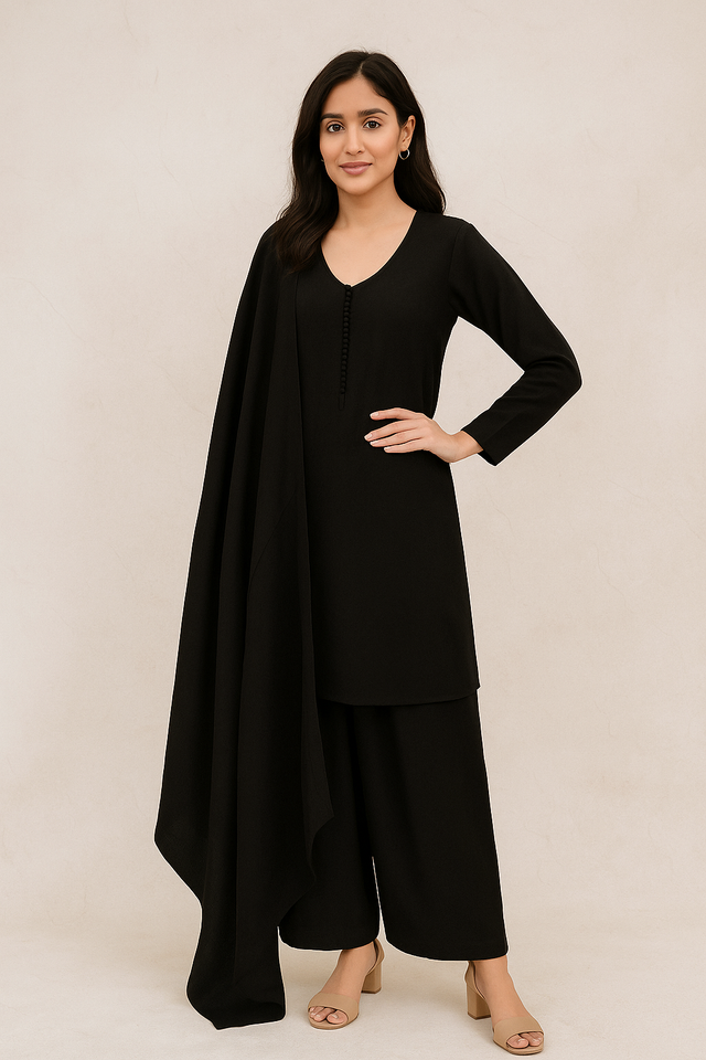 A timeless classic, this elegant Farshi salwar kurta set, embodies effortless sophistication and minimalistic charm.Perfect for both casual and semi-formal occasions, this all-black outfit offers versatility and grace in every wear.