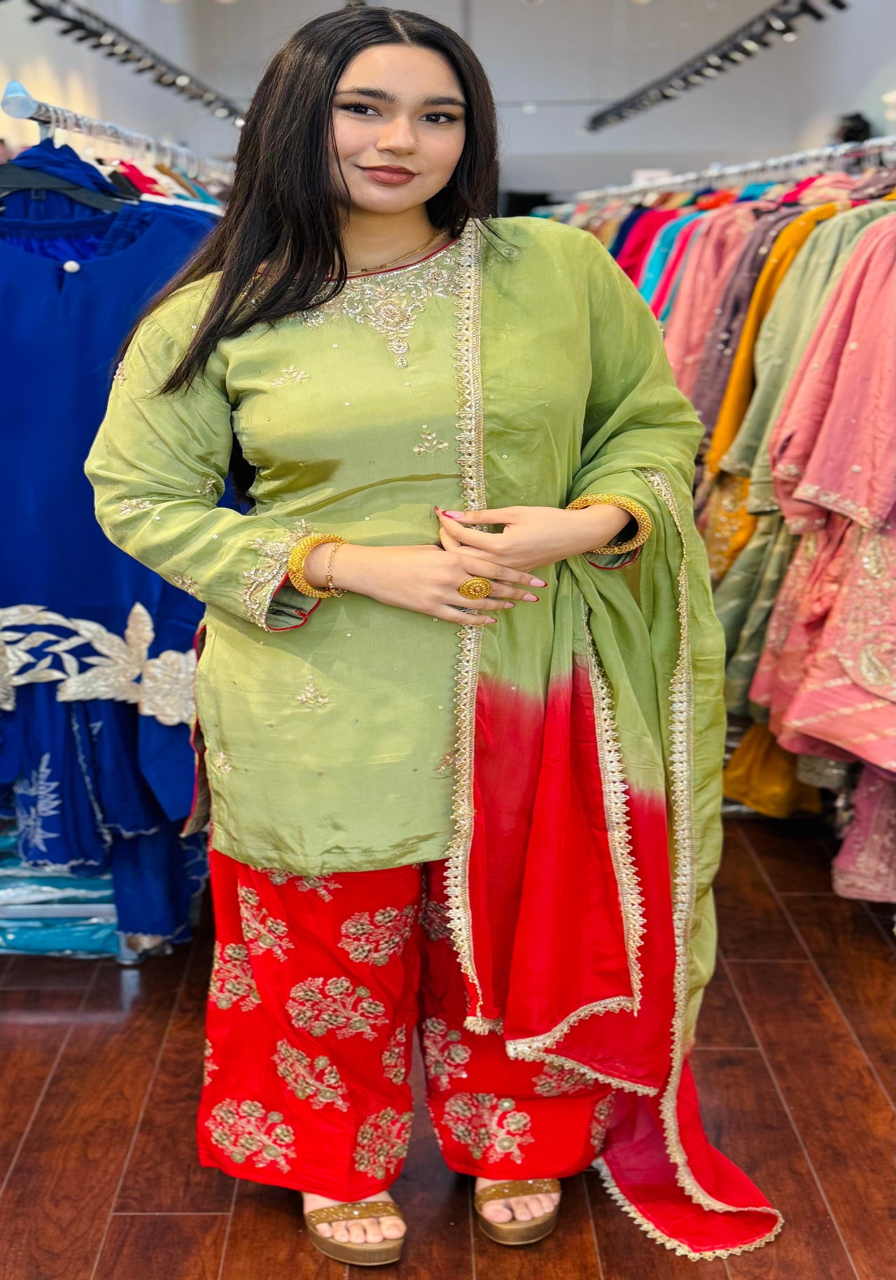 A vibrant and elegant ethnic ensemble that beautifully blends tradition with modern charm. This three-piece set is designed to bring out festive grace and comfort for any occasion.