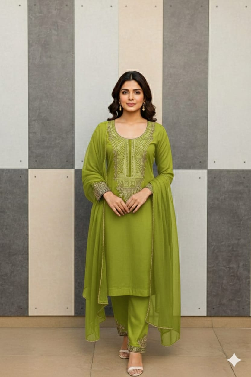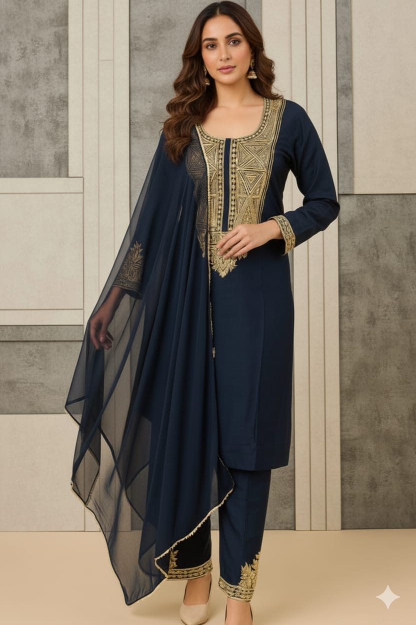 An elegant black kurta set adorned with intricate golden thread embroidery on the neckline, sleeves, and hem. The matching straight pants and dupatta add sophistication to the look — perfect for festive or semi-formal occasions.