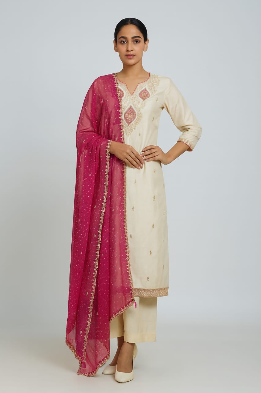 Exude grace in this elegant ivory kurta set, beautifully paired with a contrasting deep pink dupatta. The kurta features intricate thread and zari embroidery on the neckline and front panel, adding a refined festive touch. The subtle embellishments throughout the fabric elevate its charm, making it perfect for festive gatherings, formal lunches, or celebratory occasions.