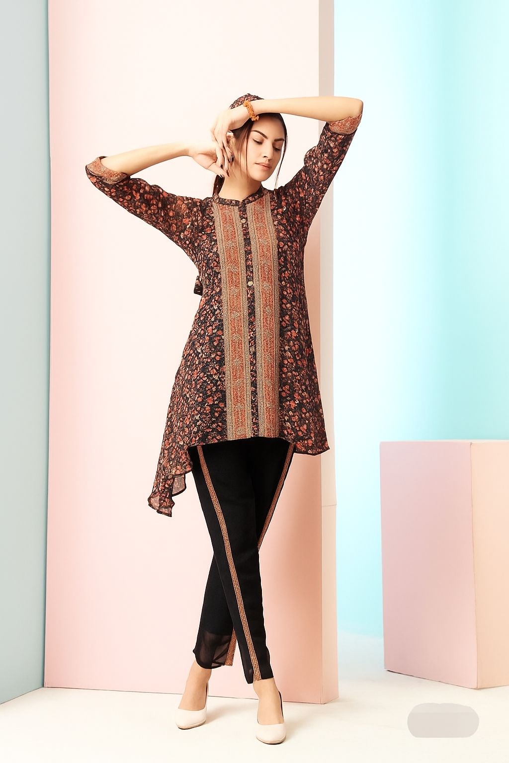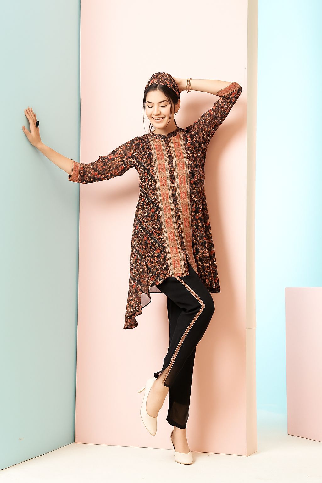 Step out in effortless style with this chic black floral printed kurta set. Designed with an asymmetrical hemline and front panel embroidery, this outfit combines contemporary fashion with ethnic charm. The breathable fabric and elegant detailing make it perfect for casual outings, festive wear, or work gatherings.