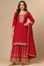 Radiate festive elegance in this crimson red embroidered sharara suit set, designed with traditional craftsmanship and contemporary charm. Perfect for festive occasions, weddings, or celebratory events, this ensemble blends grace with royal allure.