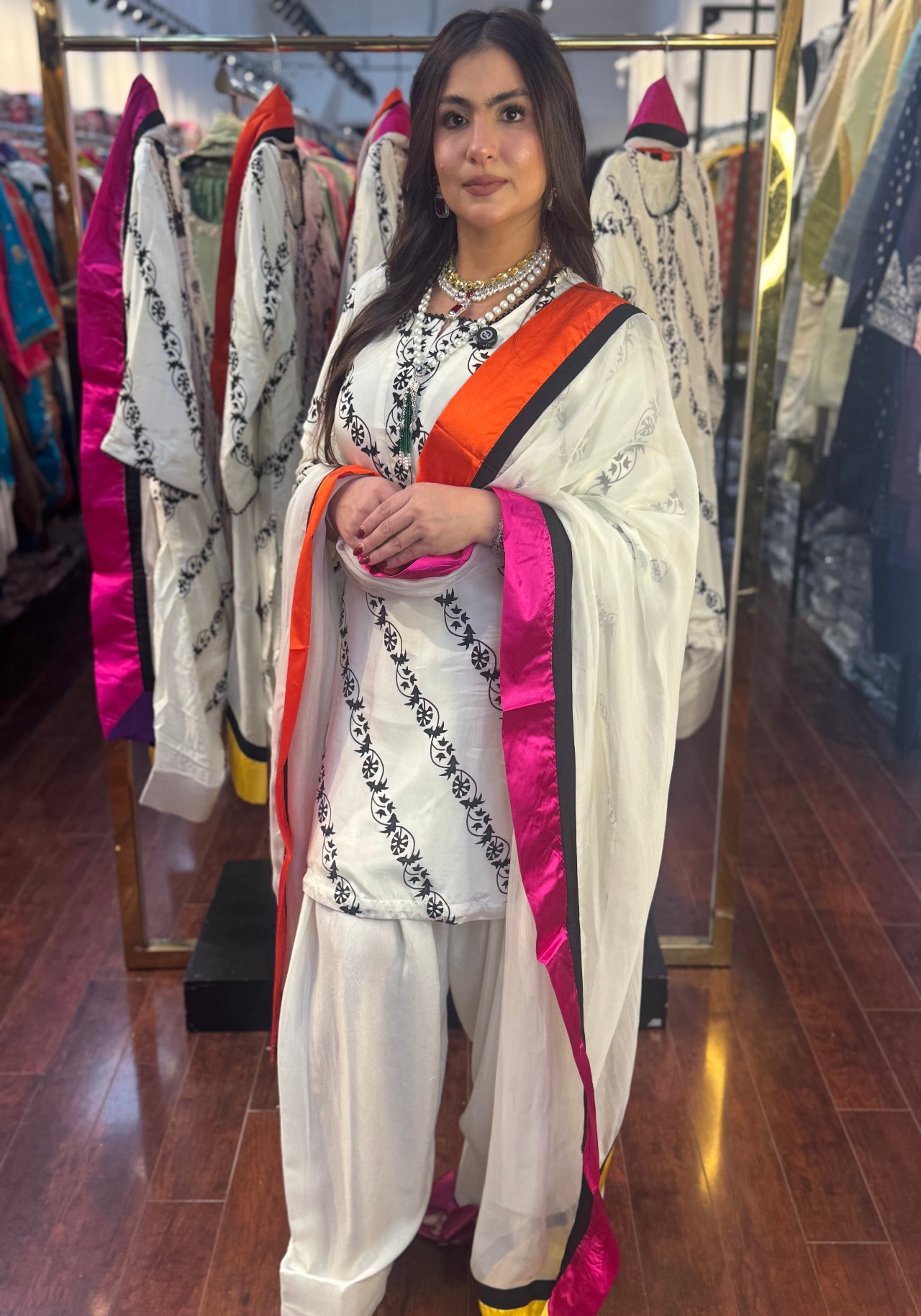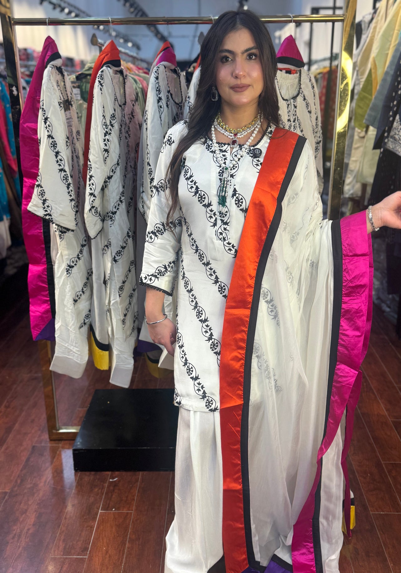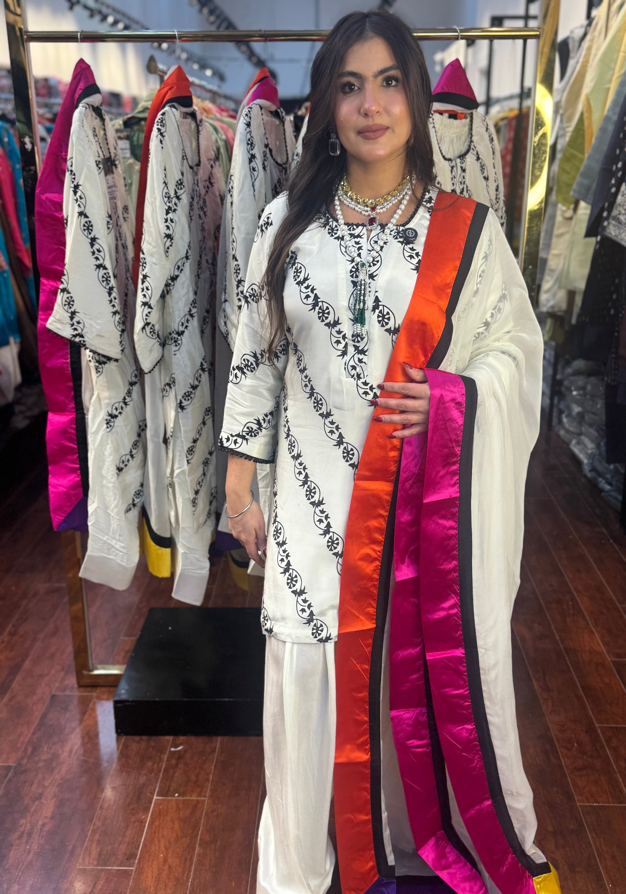 PRODUCT DETAILS:-Step out in style with this chic monochrome suit set, featuring a comfortable Farshi salwar and a vibrant contrasting dupatta. The crisp white hue combined with intricate black floral vine embroidery creates a sophisticated and contemporary look. The bold, multi-colored border on the dupatta adds a playful splash of glamour, making it perfect for day events, casual outings, and festive celebrations.