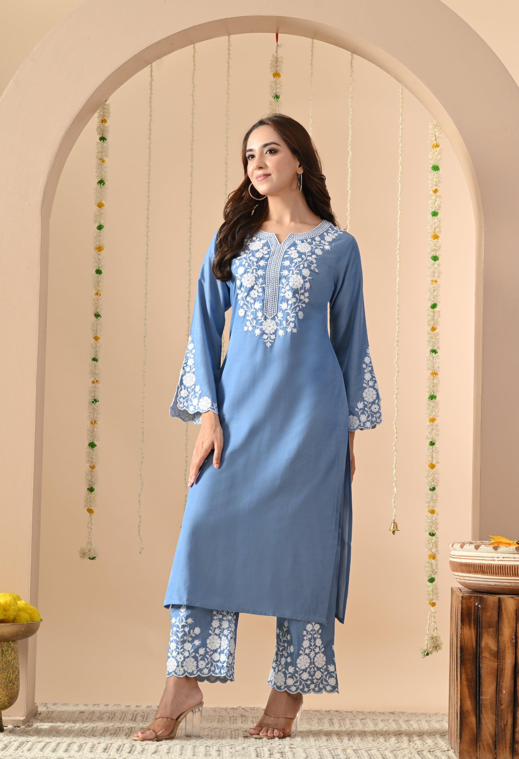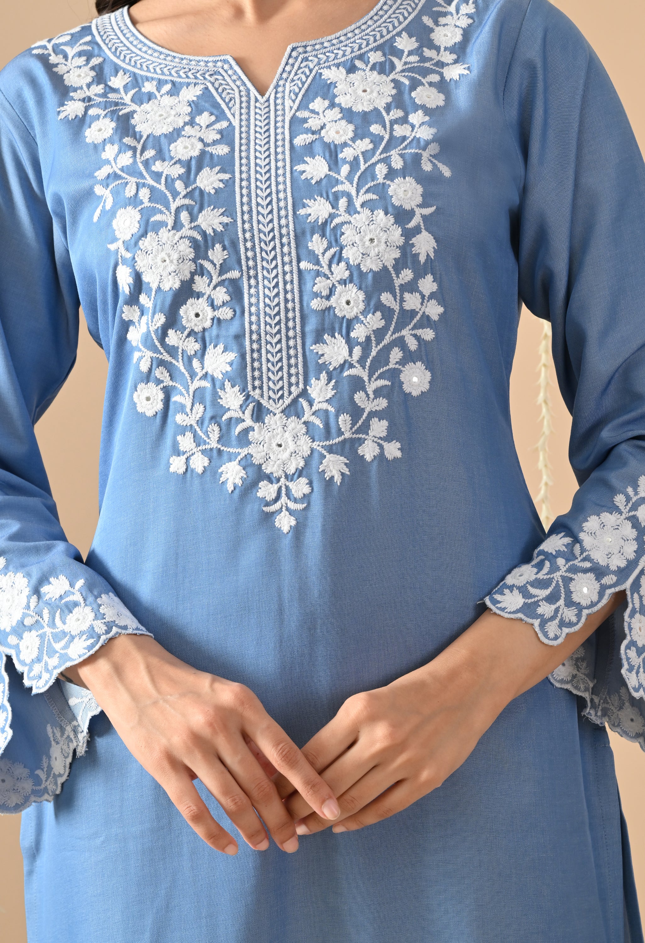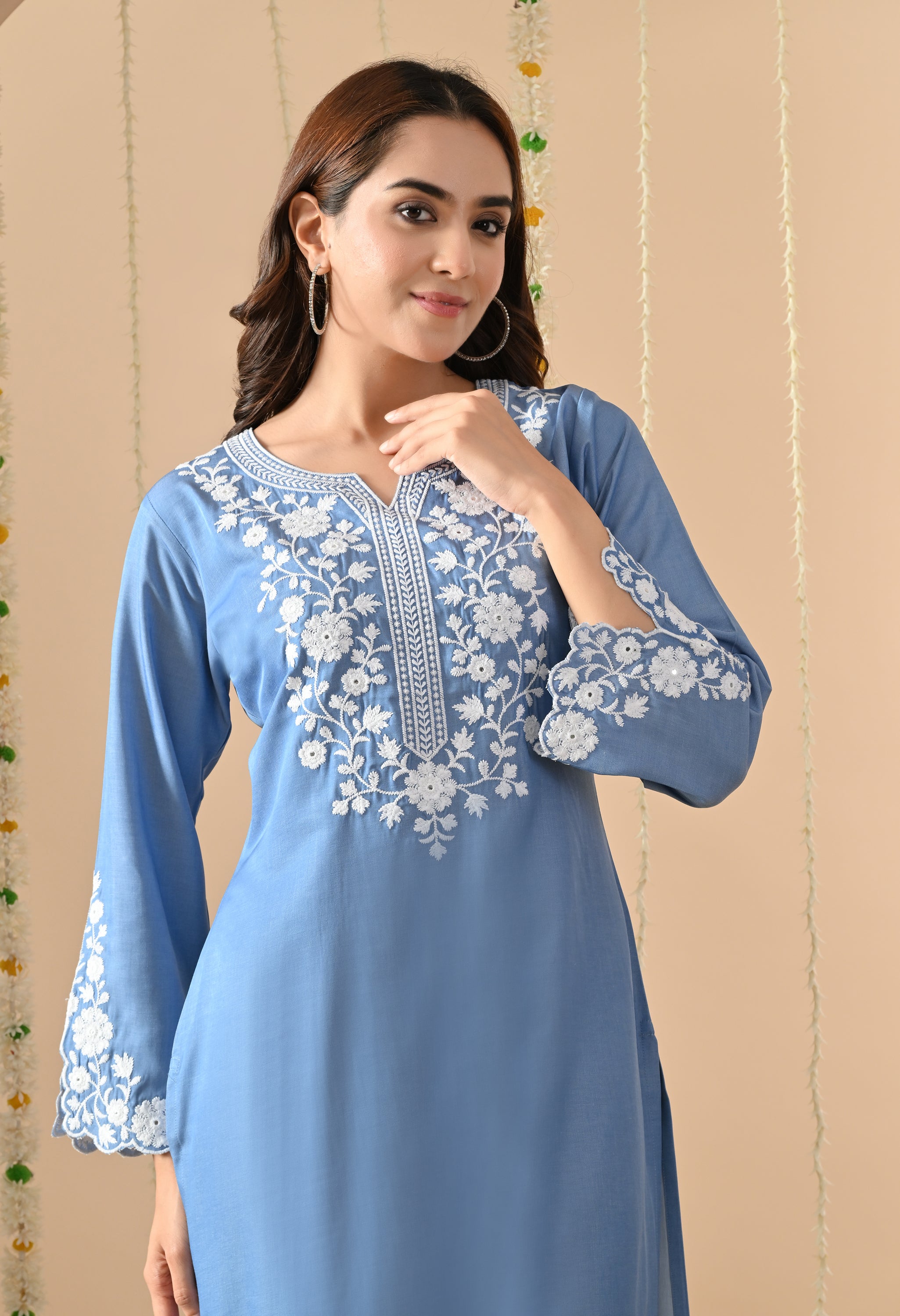 Crafted in a soothing powder blue shade, this stylish set features intricate white floral embroidery on the kurta neckline, sleeves, and hem of the matching pants.