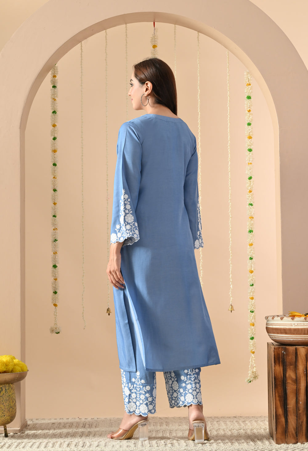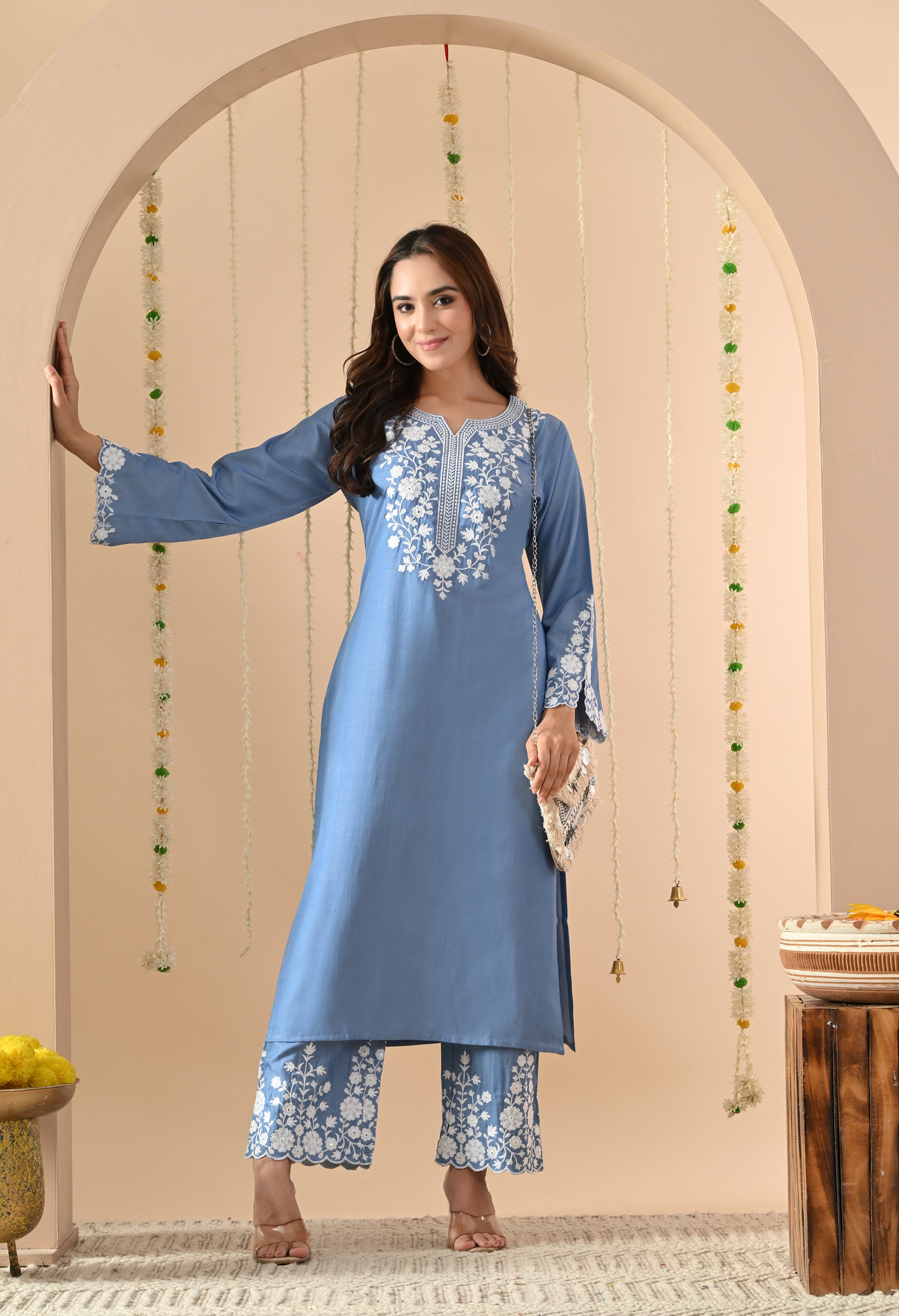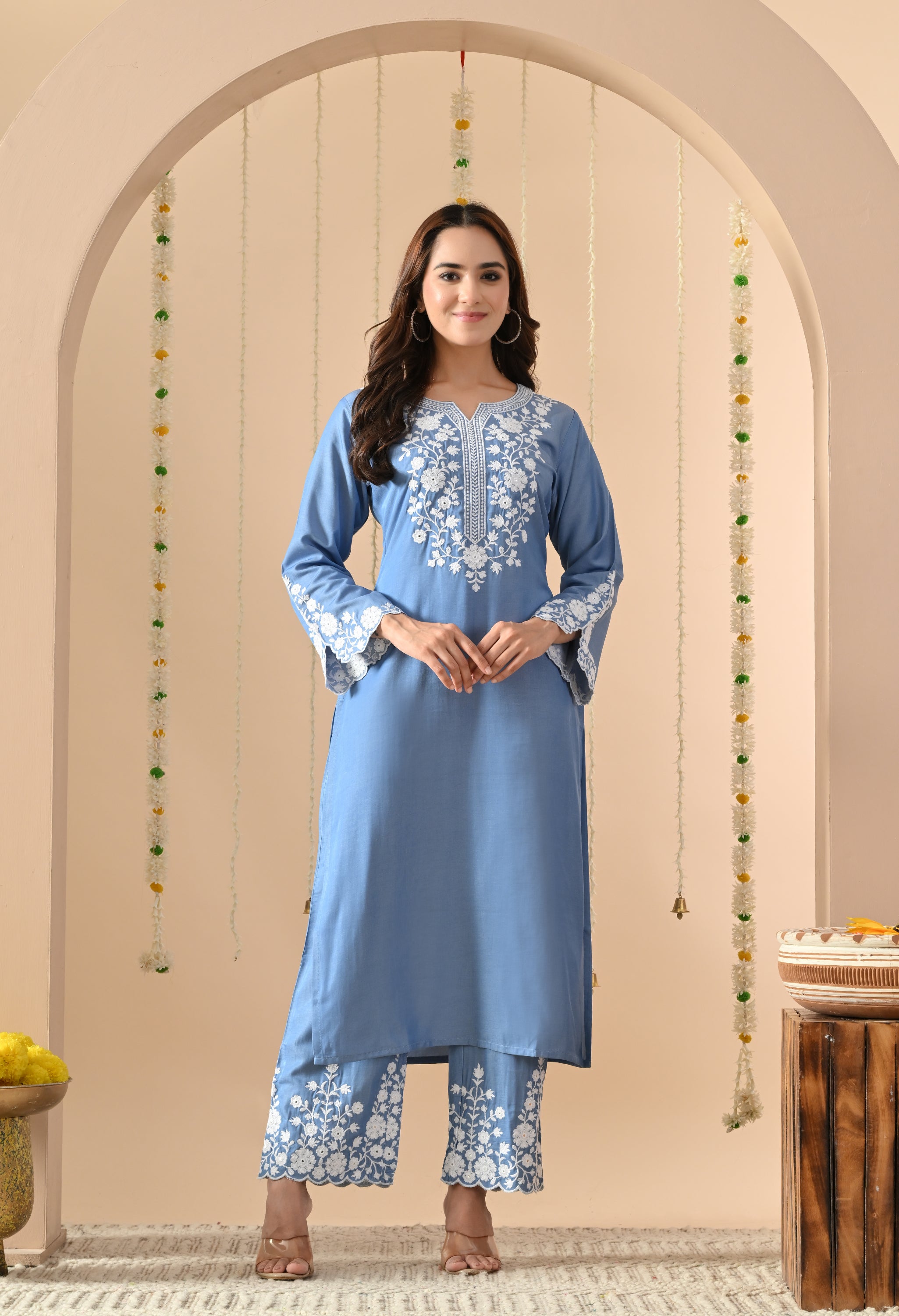 Crafted in a soothing powder blue shade, this stylish set features intricate white floral embroidery on the kurta neckline, sleeves, and hem of the matching pants.