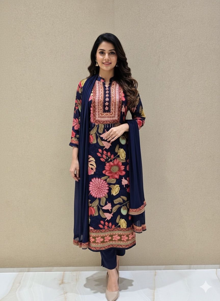 Embrace timeless elegance with this stunning navy blue floral printed kurta set. The outfit features intricate floral patterns in shades of pink, mustard, and green, beautifully highlighted with embroidered detailing on the yoke. The straight-cut silhouette offers a flattering fit, complemented by matching pants and a soft chiffon dupatta with a printed border. Perfect for festive occasions, family gatherings, or elegant day events