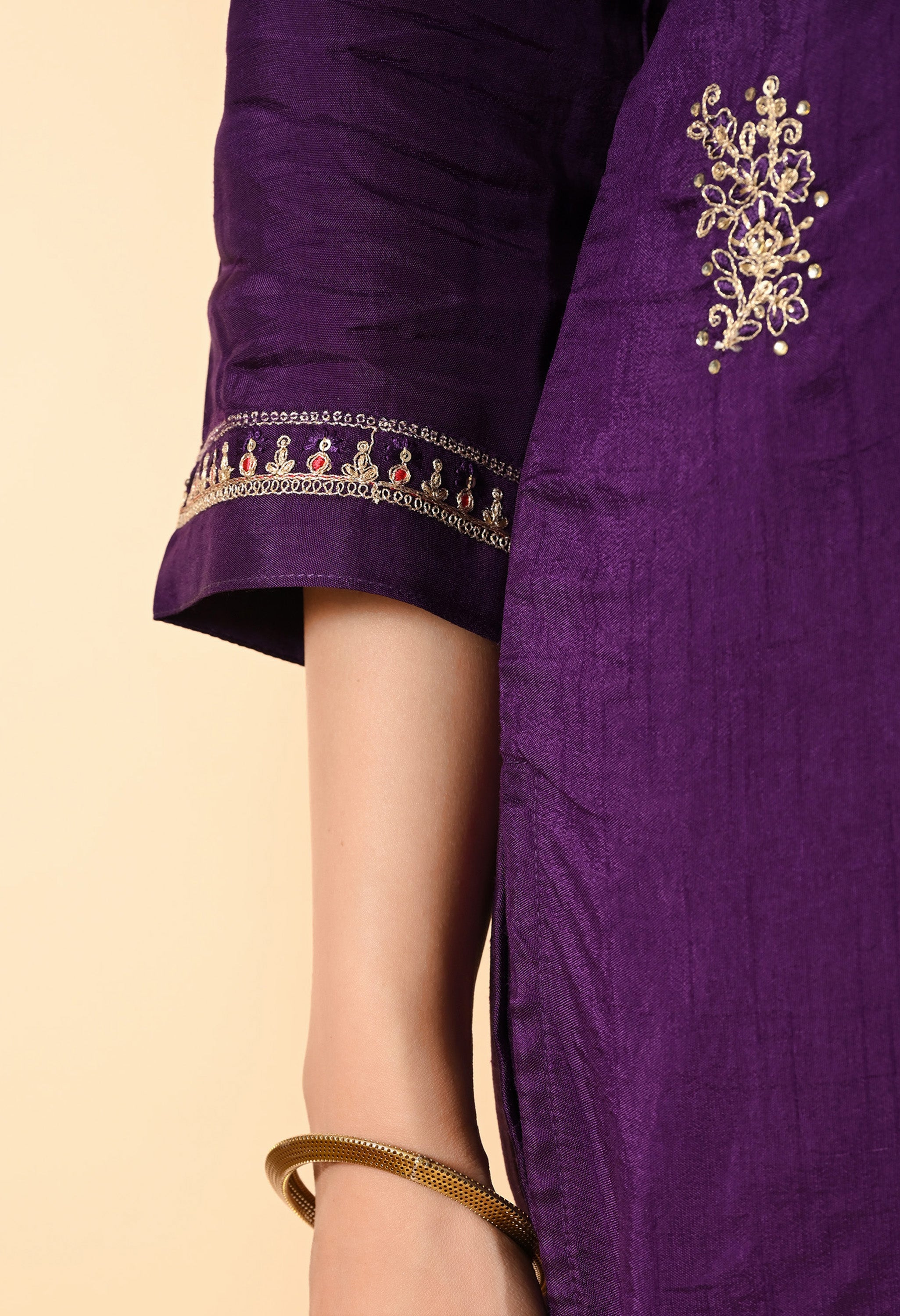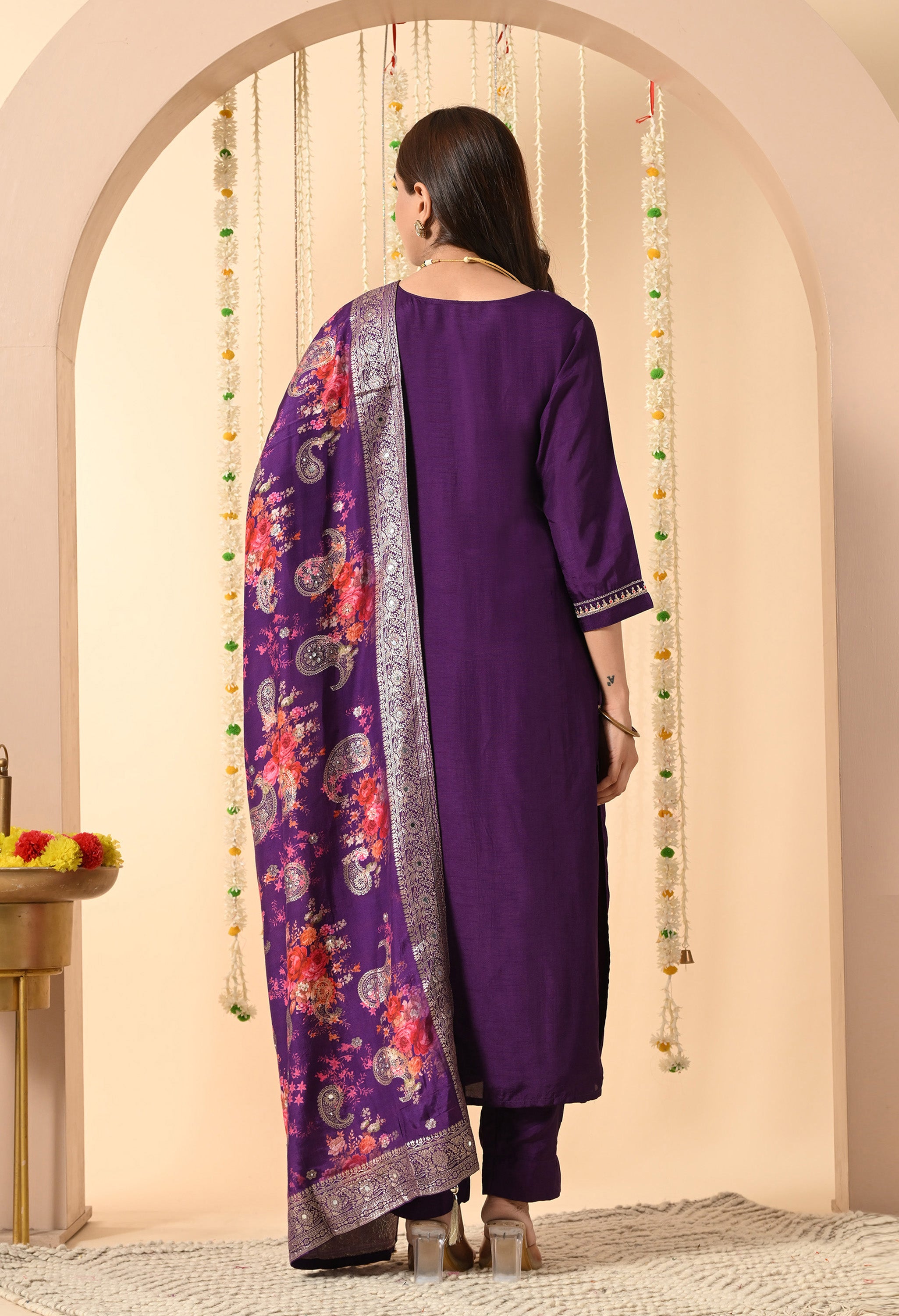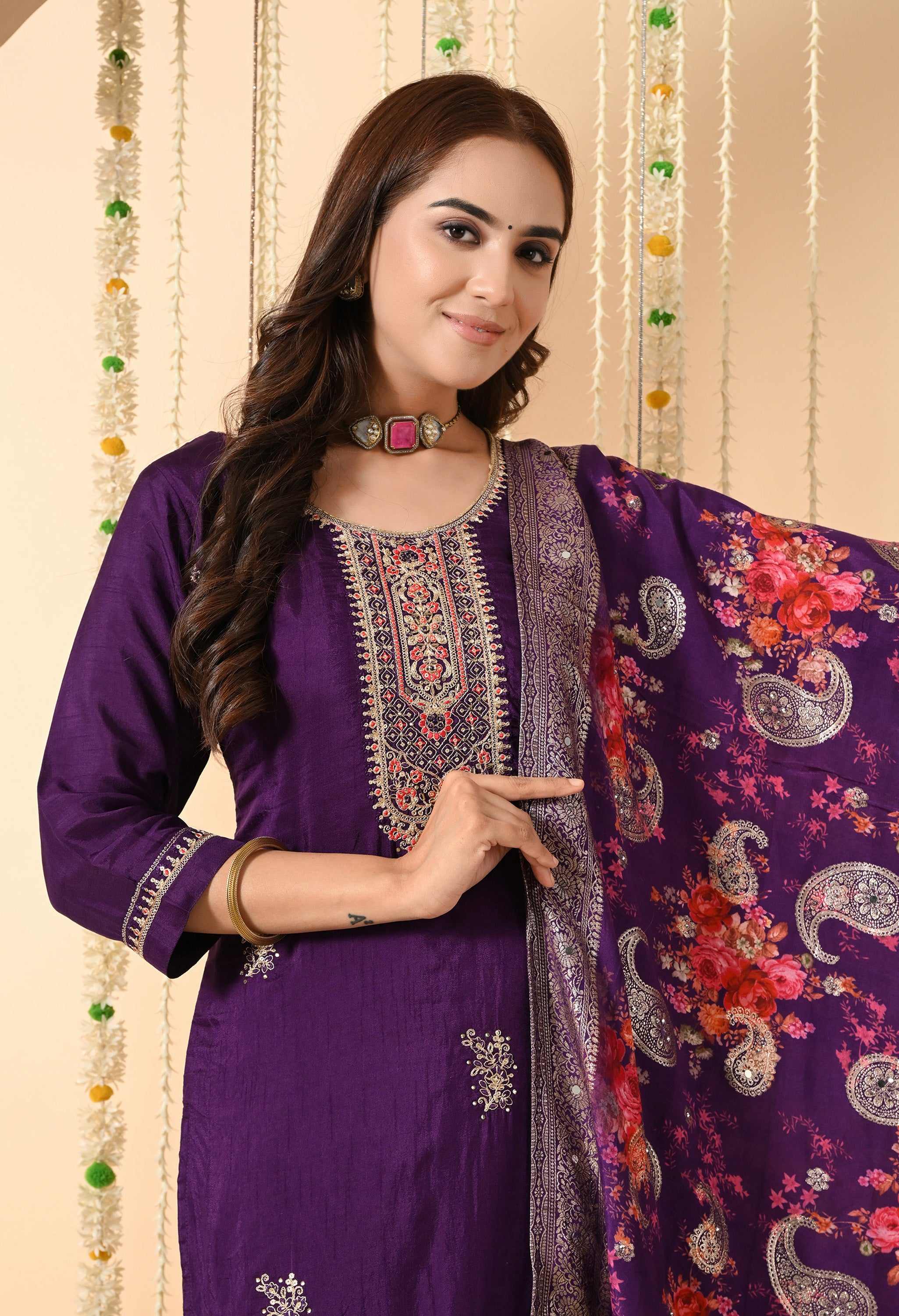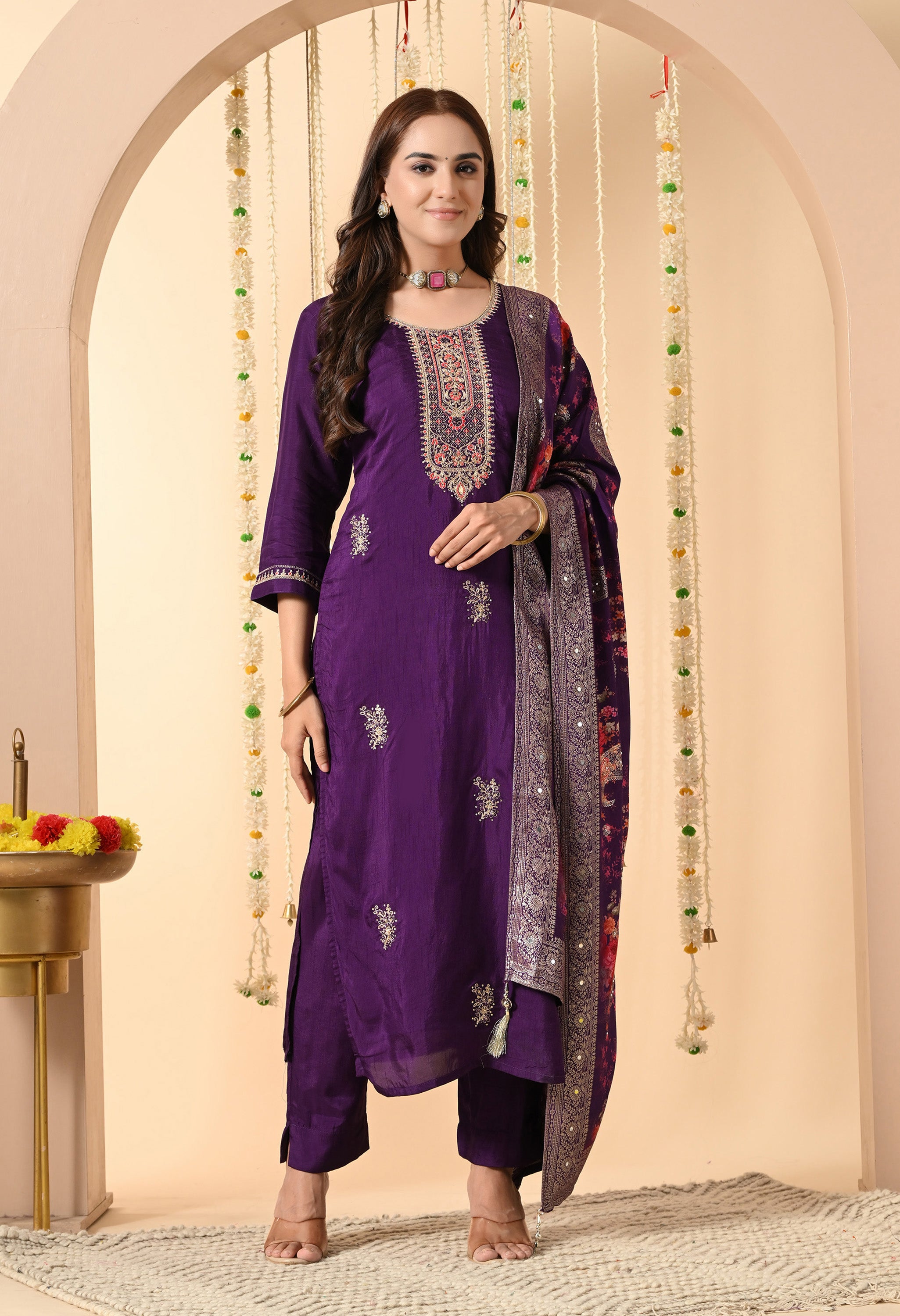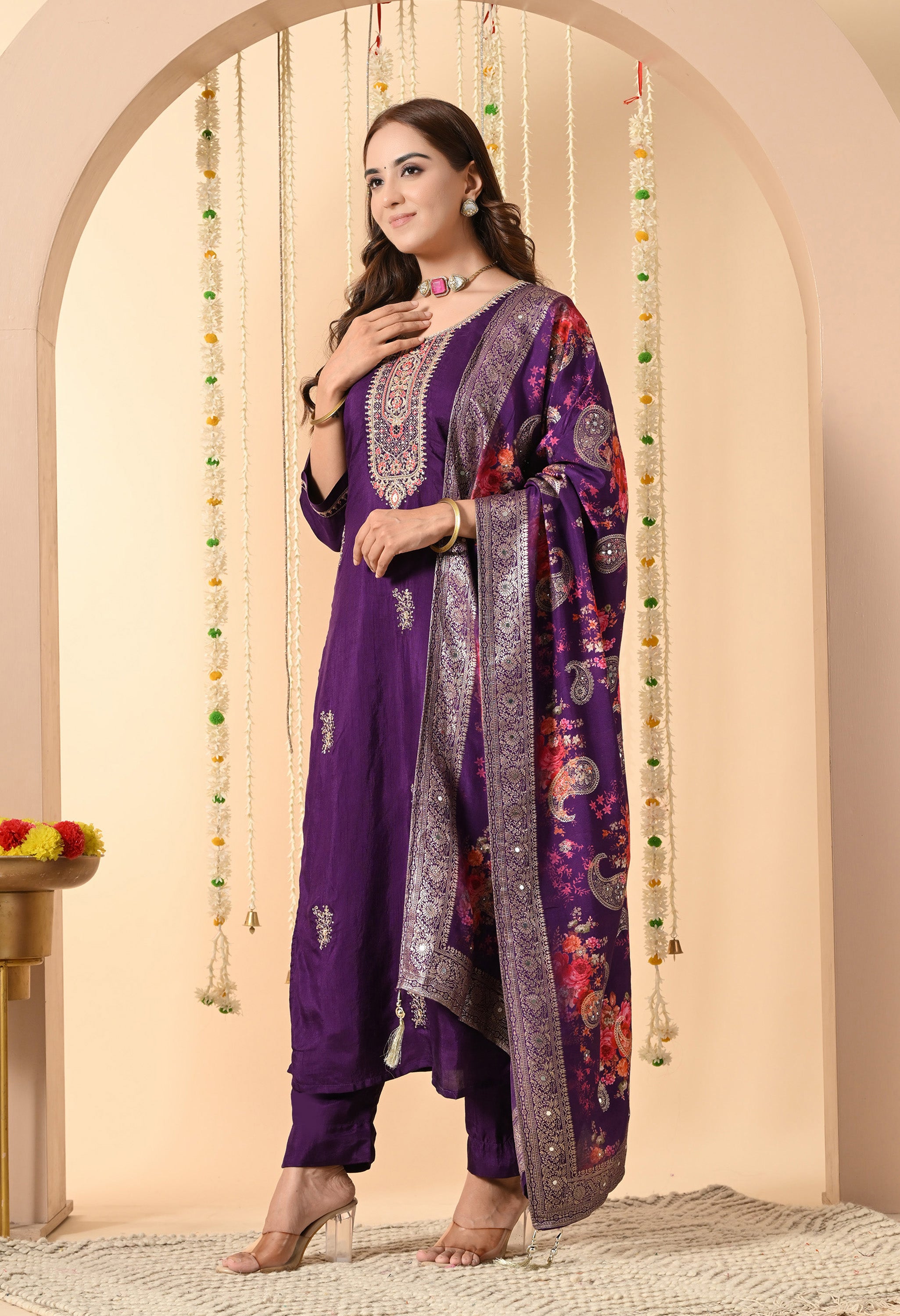 Celebrate grace with Shehnai Saaz, a stunning plum-hued suit crafted in luxurious pure Dola fabric. This elegant ensemble features intricate thread and sequin embroidery on the neckline and motifs scattered across the kurta, lending a regal charm. Paired with matching straight pants and a finely detailed printed dupatta with mirror accents and tassel finish, this outfit strikes the perfect balance between festive allure and timeless sophistication.
