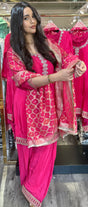 Step into timeless charm with our Patakha farshi , featuring a rich fuchsia pink kurta adorned with intricate sequin embroidery along the neckline, hem, and sleeves. The farshi salwar add a graceful flare, while the luxurious dupatta with golden lattice work completes the festive look. Perfect for weddings, festive occasions, and grand celebrations.
