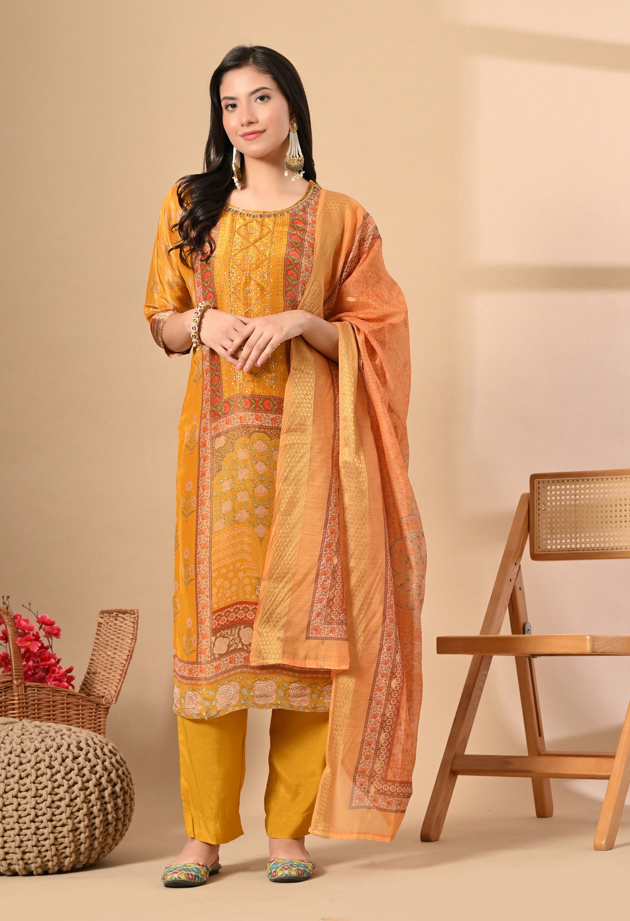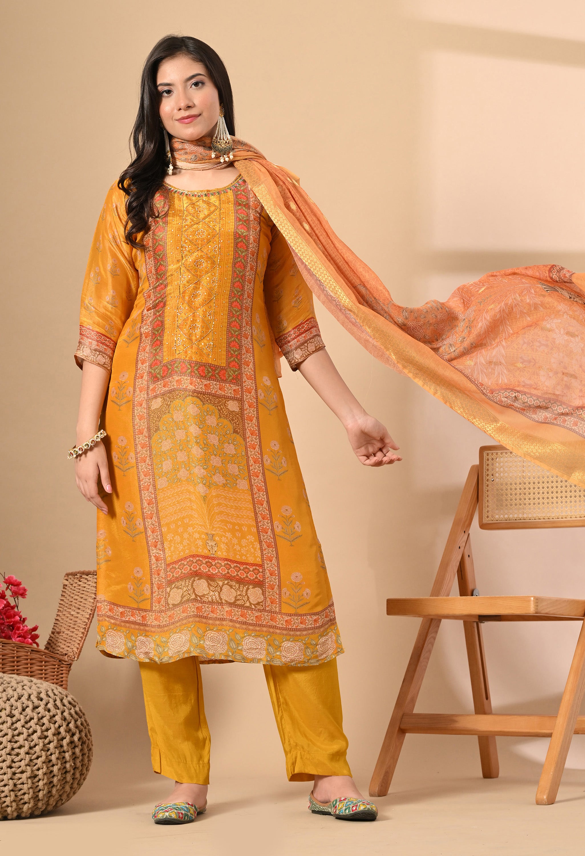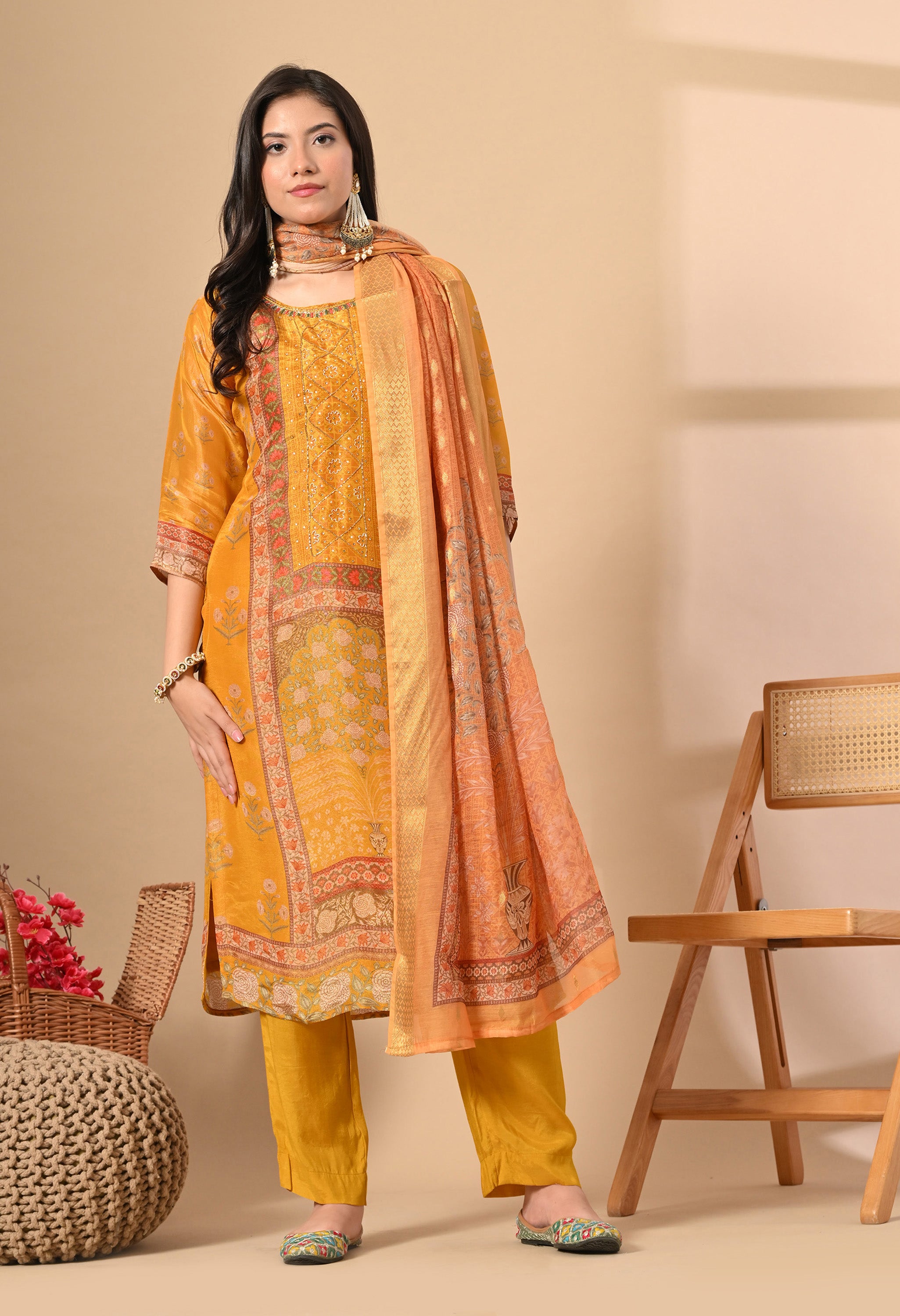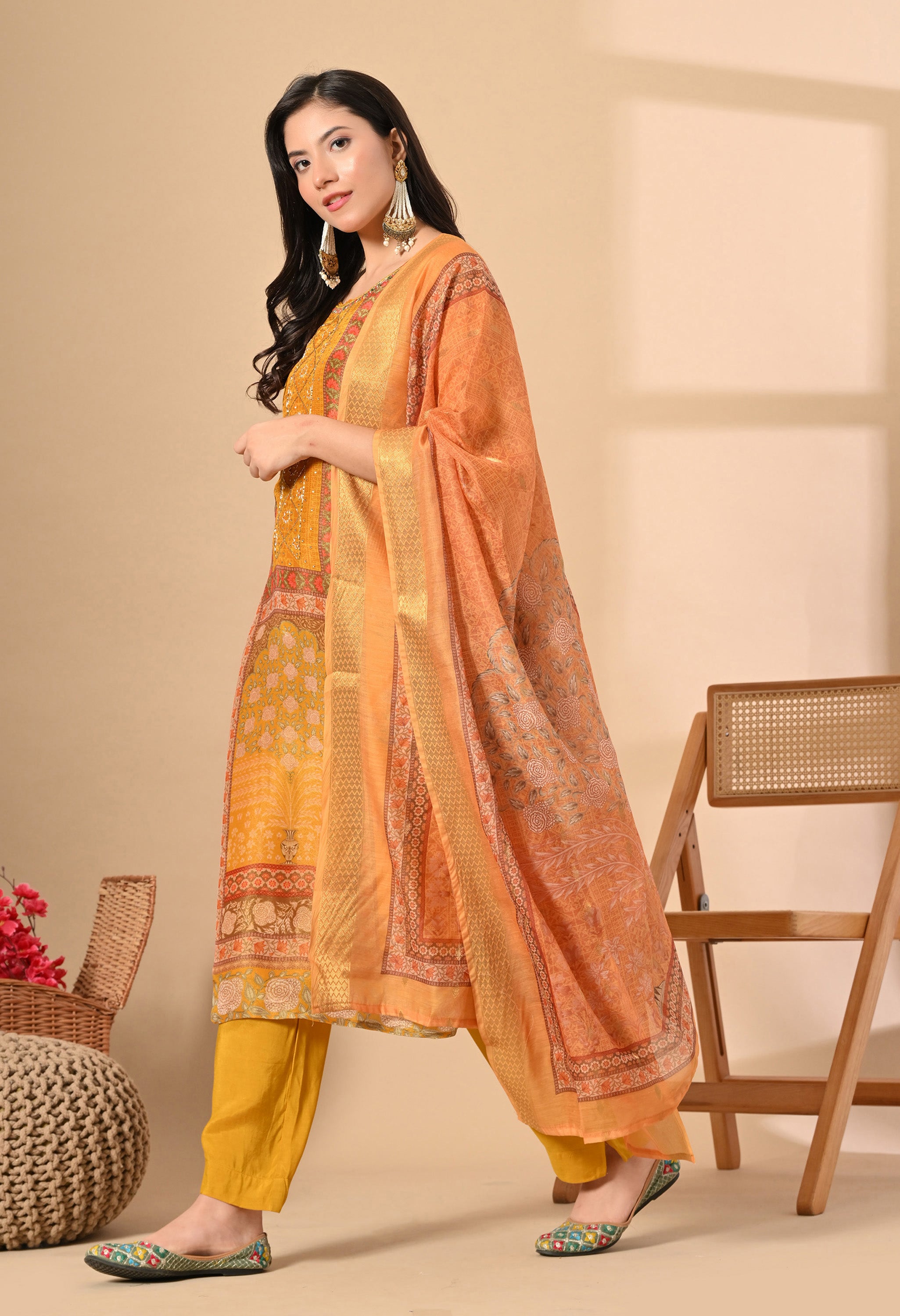 Step into timeless elegance with our Pehli Dhoop . Crafted in soft, breathable cotton, this mustard-hued ensemble features intricate traditional print detailing paired with delicate threadwork that elevates the overall design. The kurta boasts a straight-cut silhouette with a detailed yoke and floral patterns along the hemline, while the matching pants add a touch of effortless comfort. Completing the look is a beautifully woven dupatta in a warm rust-orange shade adorned with subtle motifs and border accents.