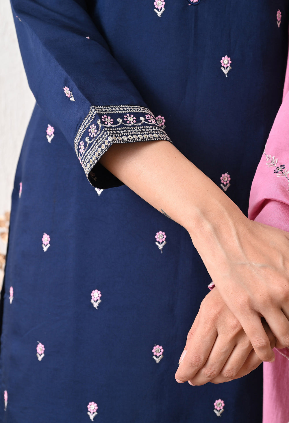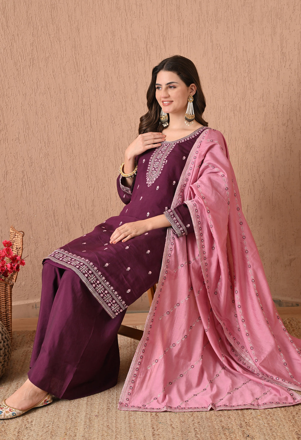Elegant and charming, the Neel Phiroza suit is a beautiful blend of classic navy and soft pink. The straight-fit kurta is delicately adorned with intricate embroidery on the neckline, sleeves, and hem, while dainty elevate its overall grace. Paired with a soft pink dupatta featuring matching threadwork and wide-leg pants, this set is ideal for festive get-togethers, family functions, or graceful daywear.