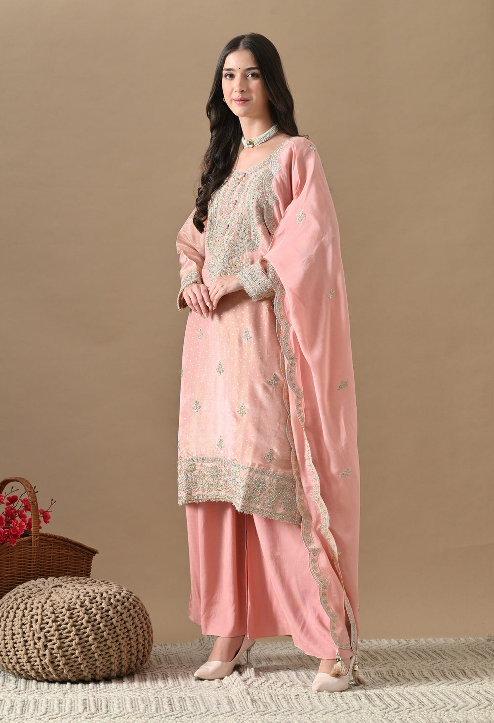 Step into elegance with our Pehraava Suit — a dreamy ensemble in blush pink. The kurta features intricate hand embroidery with delicate sequin and beadwork, highlighted with a scalloped border for a regal touch. Complemented by flowy palazzo and a sheer dupatta embroidered with soft motifs and scallop detailing, this set radiates timeless grace.