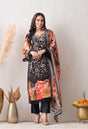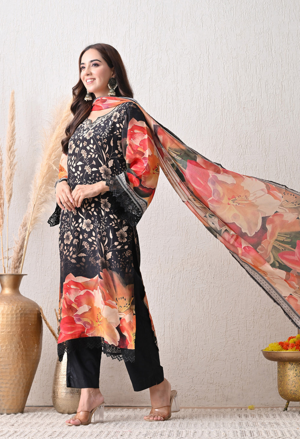 Elevate your ethnic wardrobe with the phool printed designed with a striking black base enhanced by vibrant floral prints. The kurta features intricate detailing, paired with straight-fit trousers and a multicolor floral dupatta that adds a refreshing pop of color. A perfect blend of modern charm and traditional grace, this suit is ideal for festive gatherings, casual outings, or evening wear.