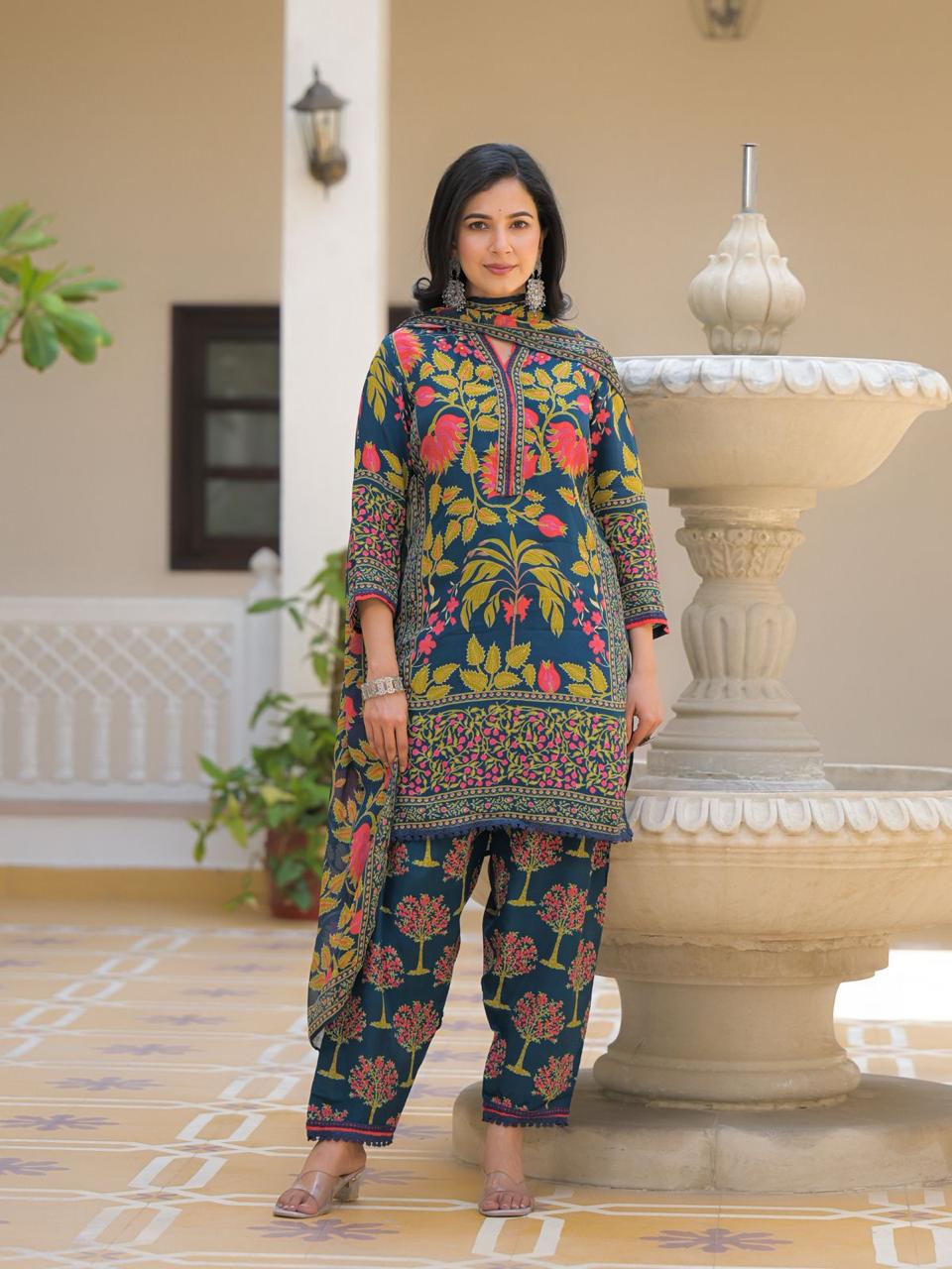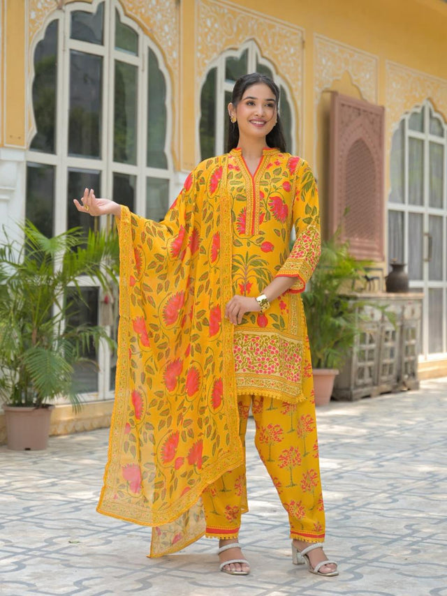 Bring a burst of brightness to your festive wardrobe with this vibrant yellow suit set. The straight-cut kurta is adorned with multicolored floral and leafy prints, highlighted with intricate embroidered yoke and sleeve borders.