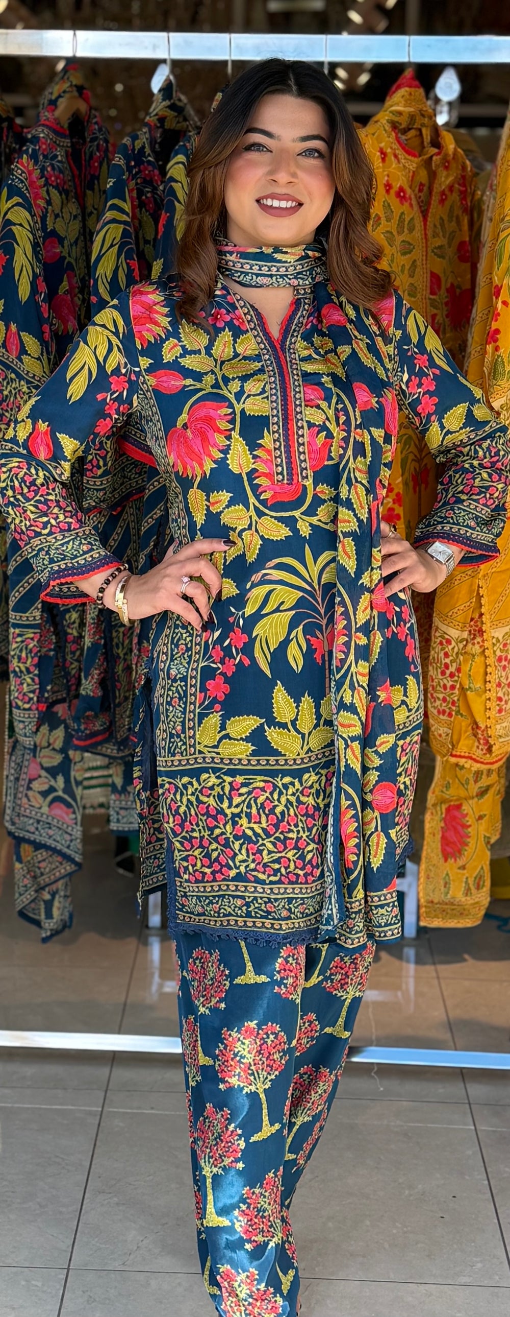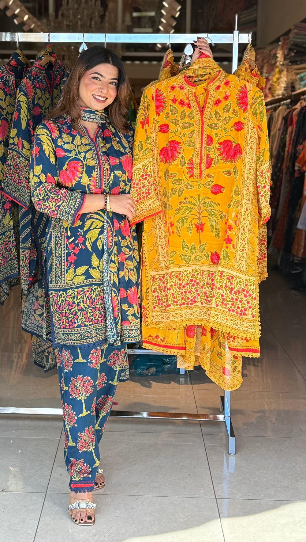 Bring a burst of brightness to your festive wardrobe with this vibrant yellow suit set. The straight-cut kurta is adorned with multicolored floral and leafy prints, highlighted with intricate embroidered yoke and sleeve borders.