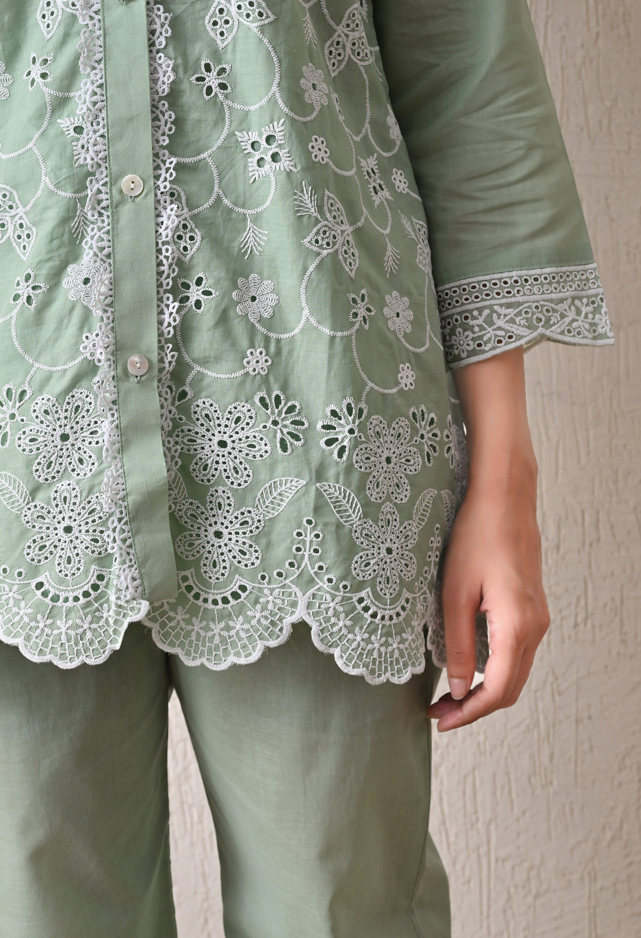 Color: Pista Green base with White Embroidery
