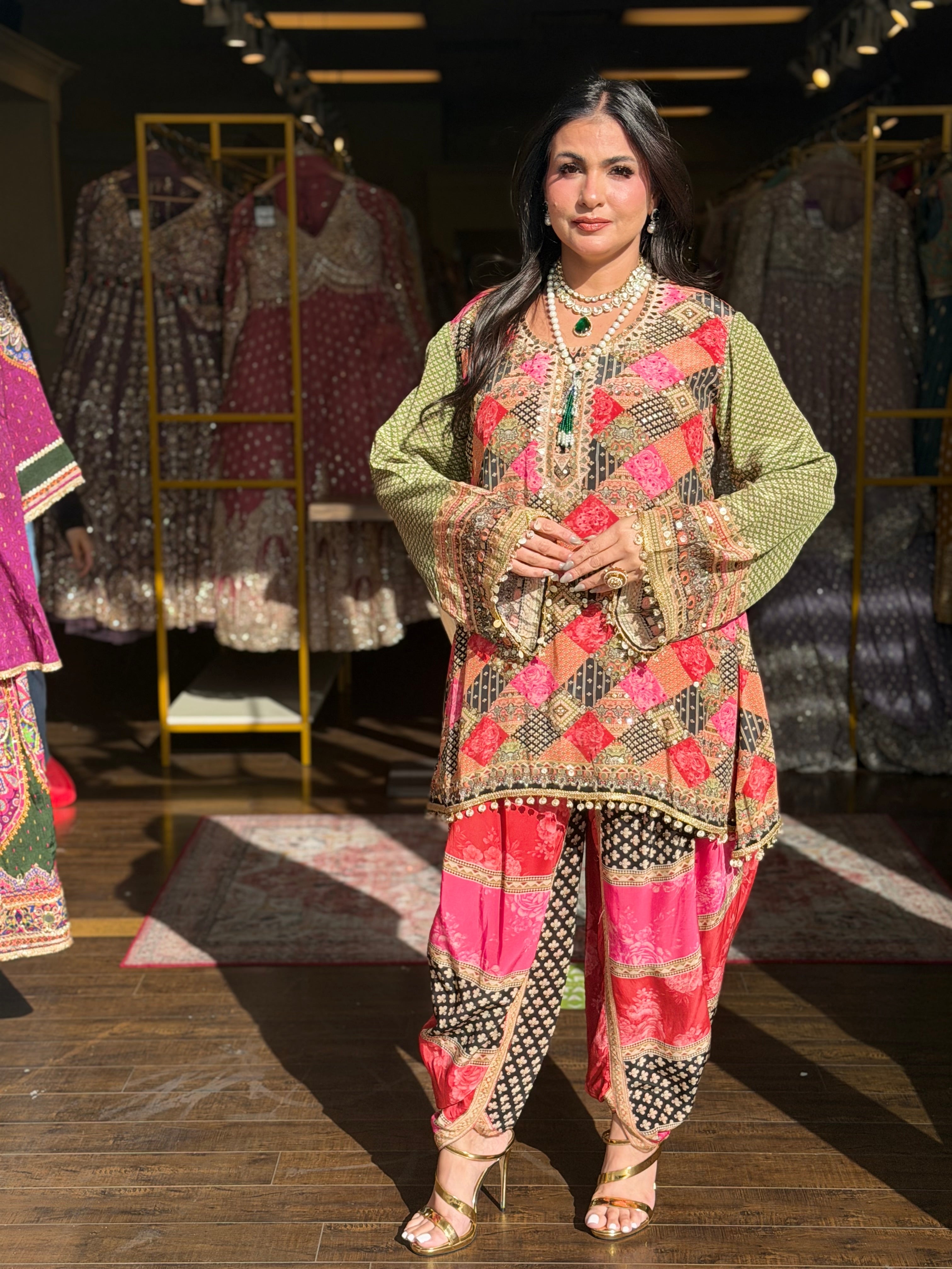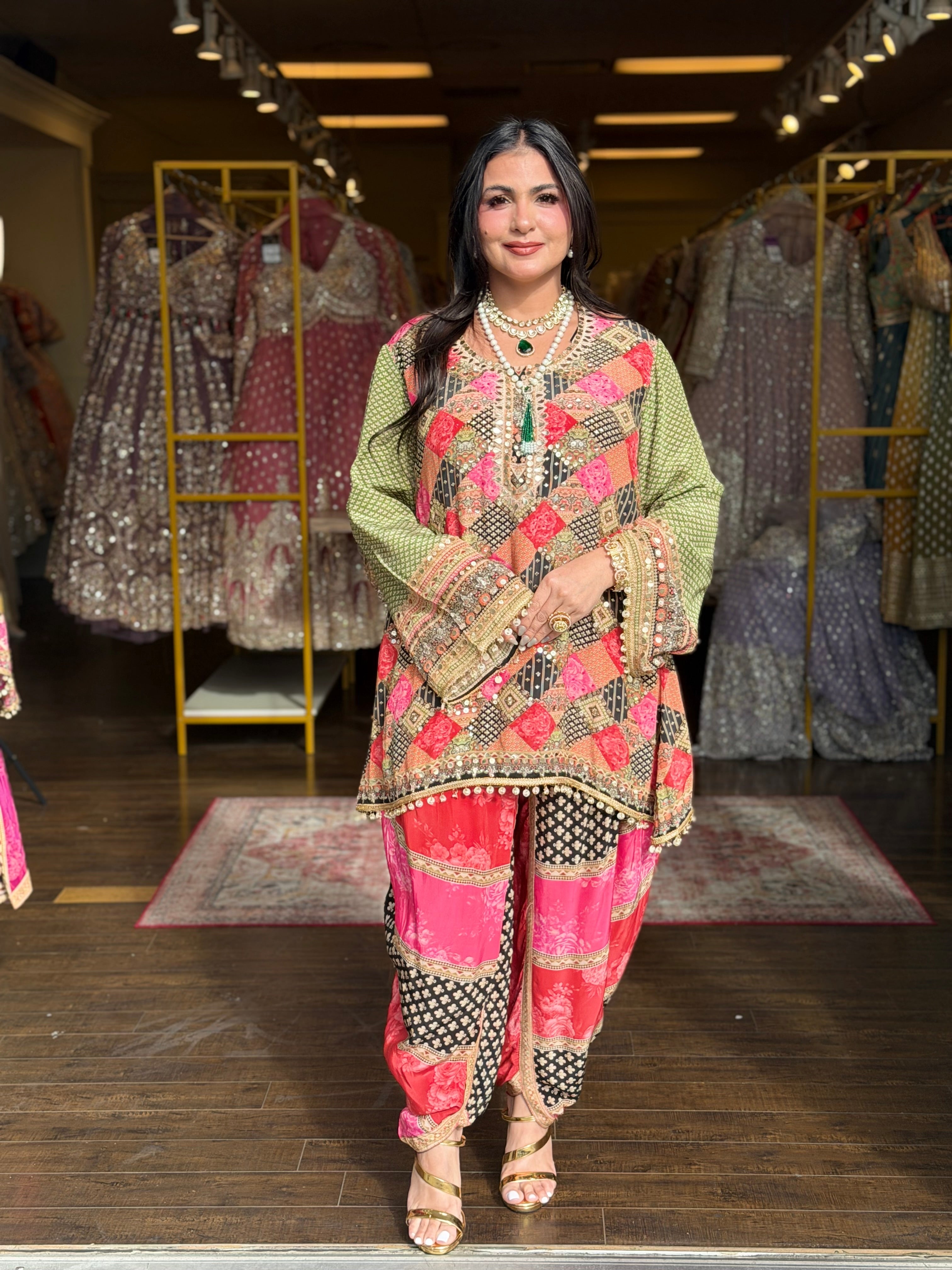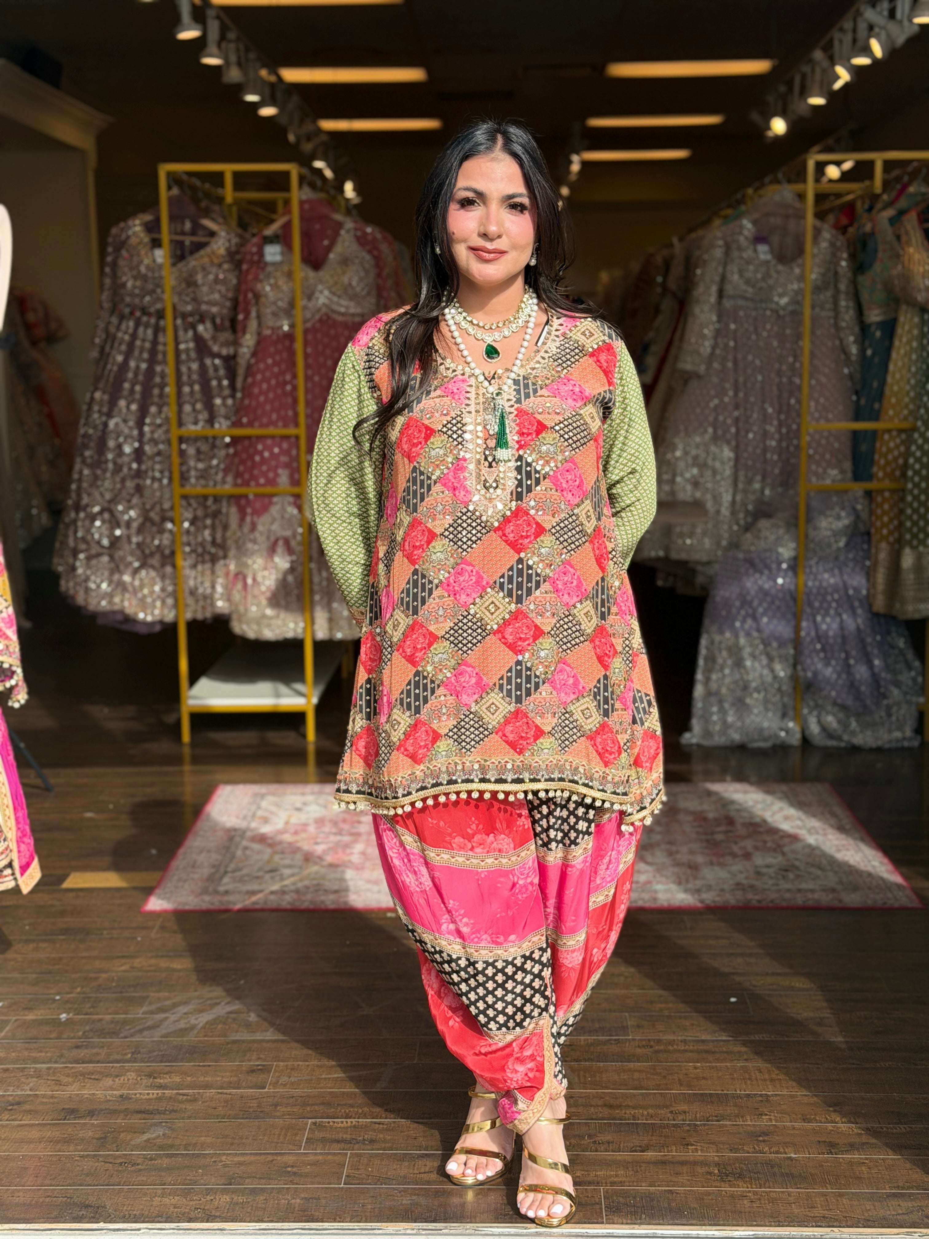 The top showcases a statement embroidered neckline with tassel detailing, paired with relaxed dhoti-style bottoms that add a chic and fashion-forward edge. The unique mix of prints and colors makes it a perfect choice for festive events, day parties, and stylish outings.