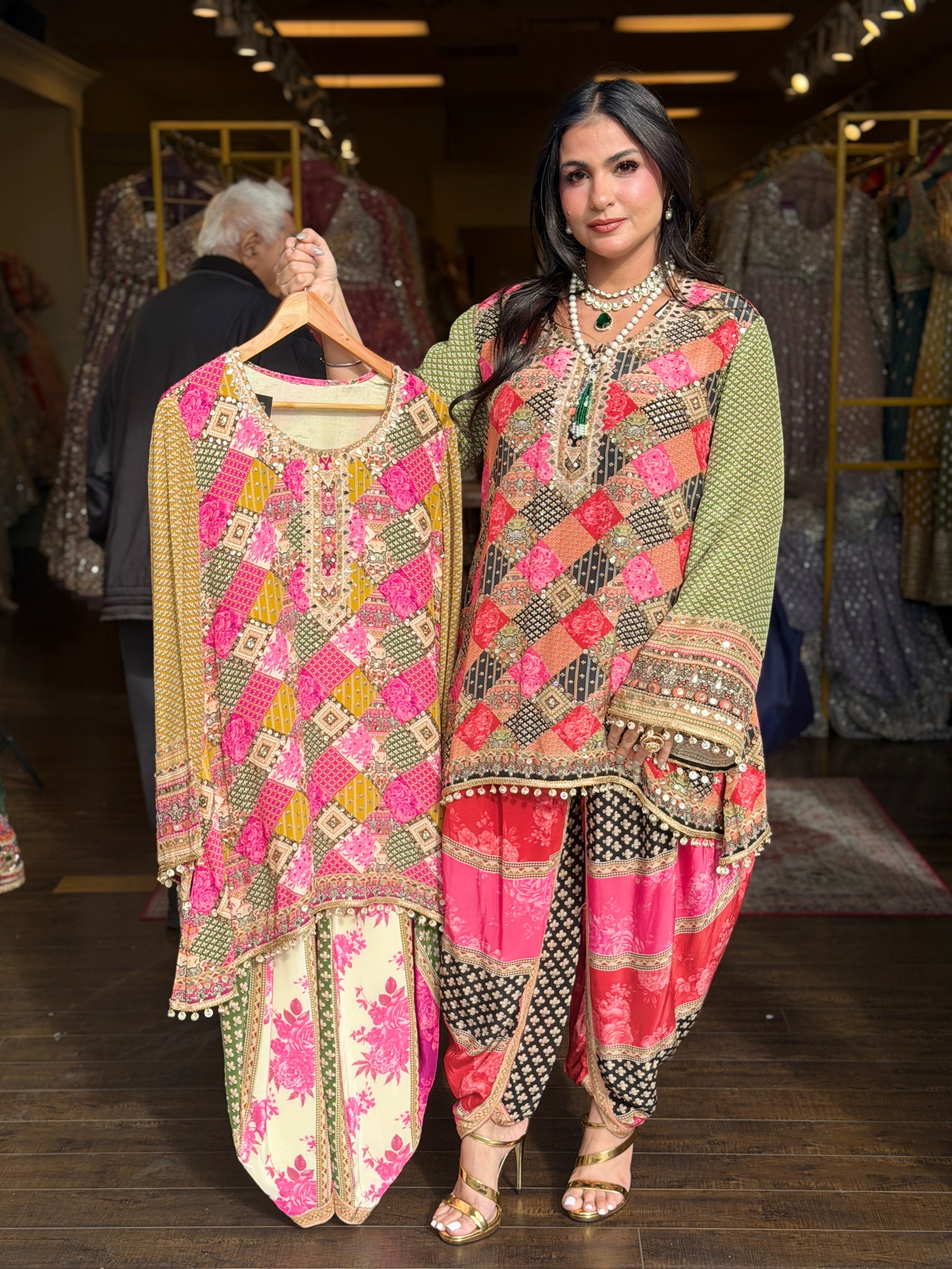 Step into contemporary elegance with this Indo-western printed co-ord set, designed for the modern woman who loves a fusion look. Featuring bold patchwork-inspired prints with a stylish silhouette, this outfit blends traditional artistry with a trendy western vibe.