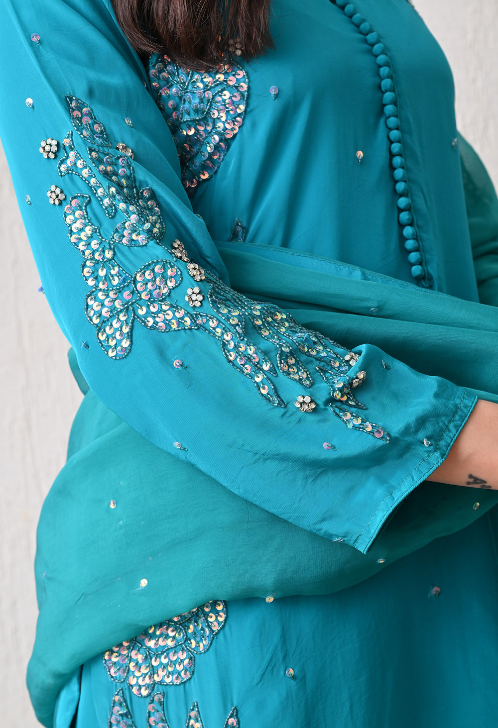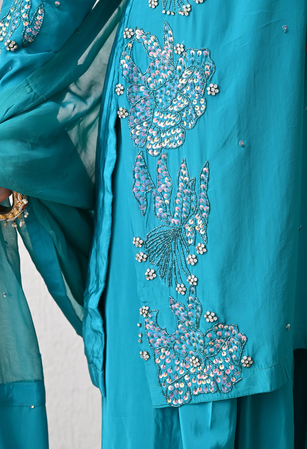 Step into timeless grace with our ROOHANI Farshi Salwar Suit, crafted in a rich teal shade that radiates sophistication. The kurta is adorned with delicate embroidery on the neckline and sleeves, enhanced with tiny sequins for a subtle shimmer.