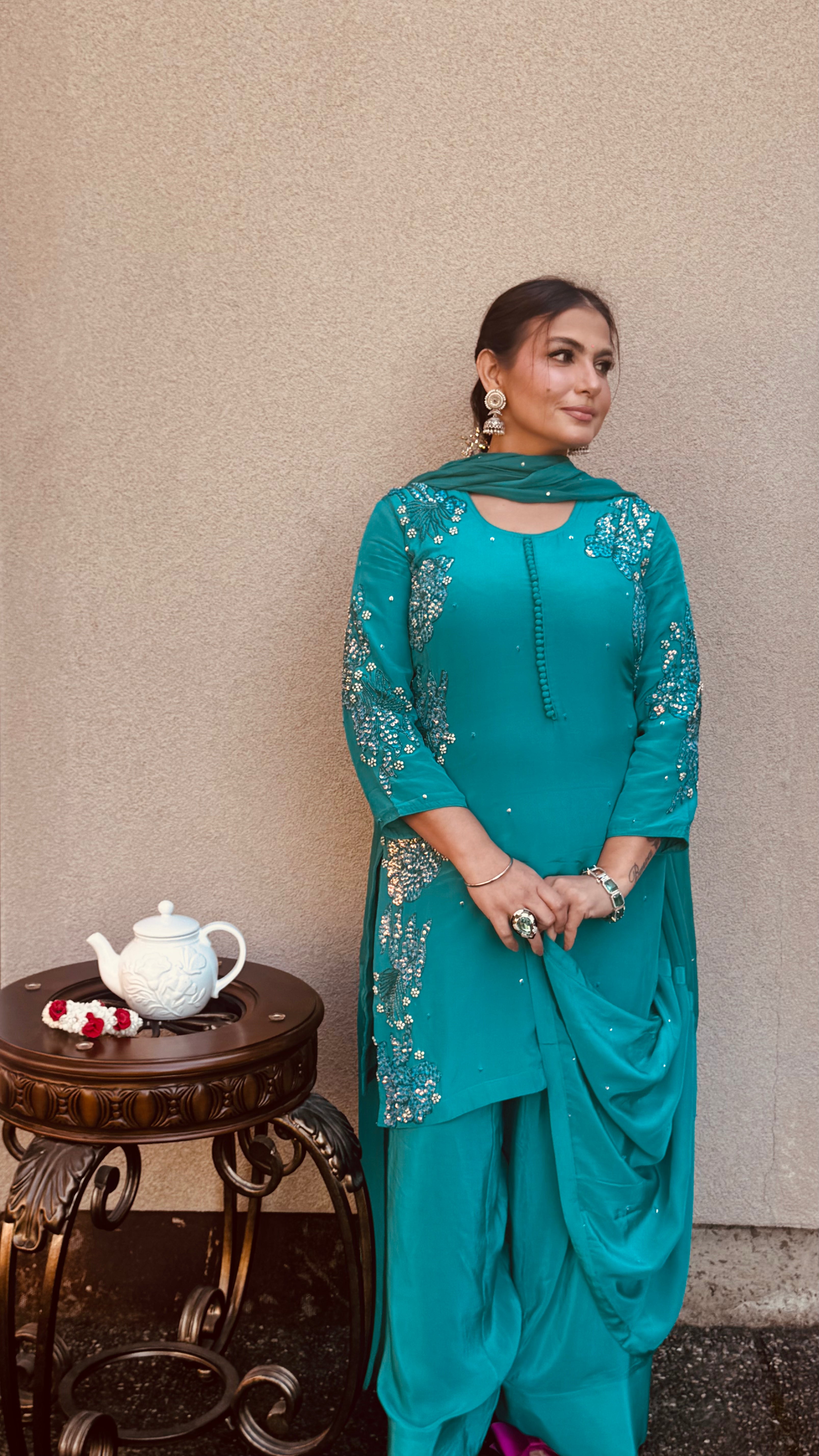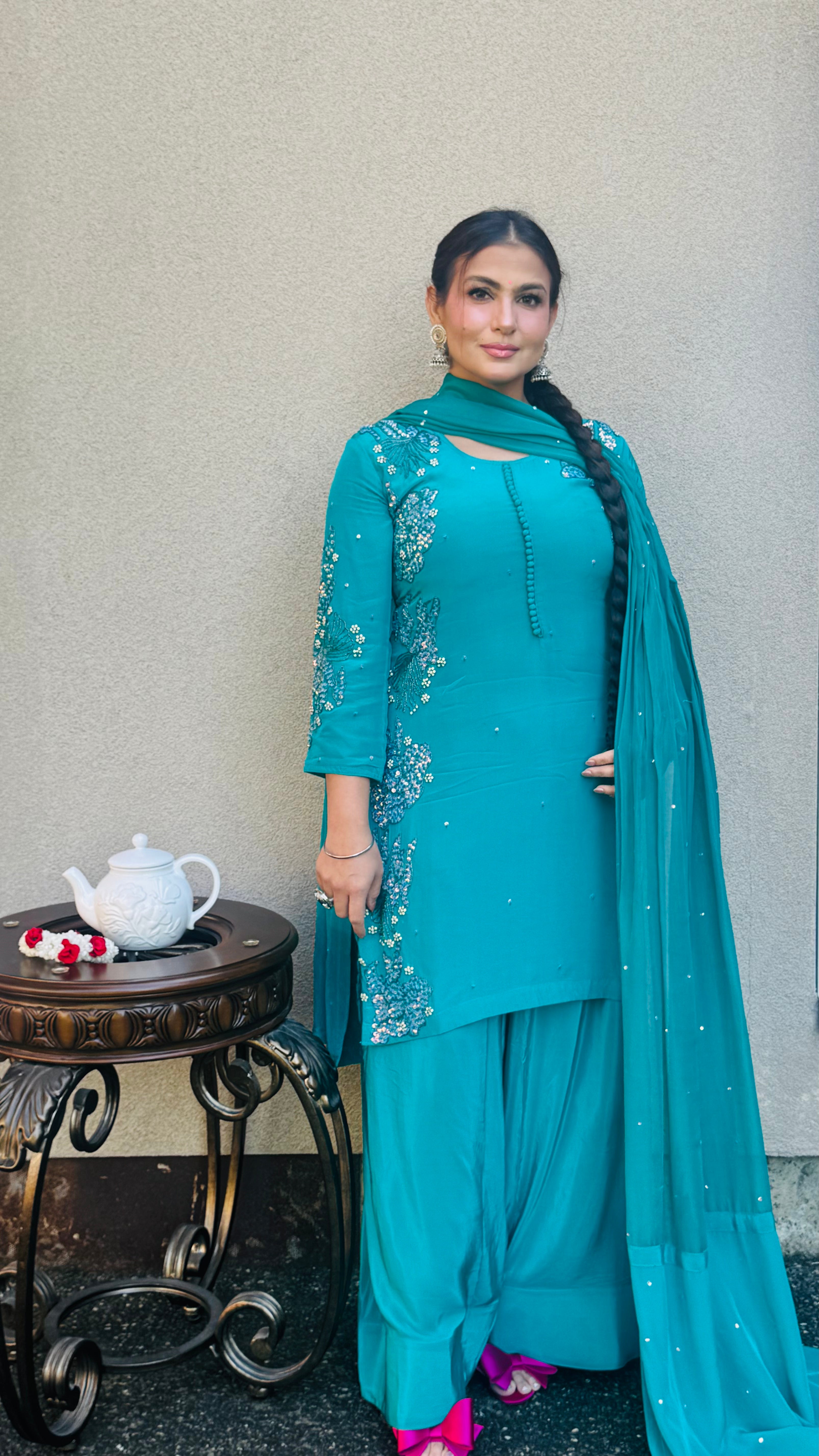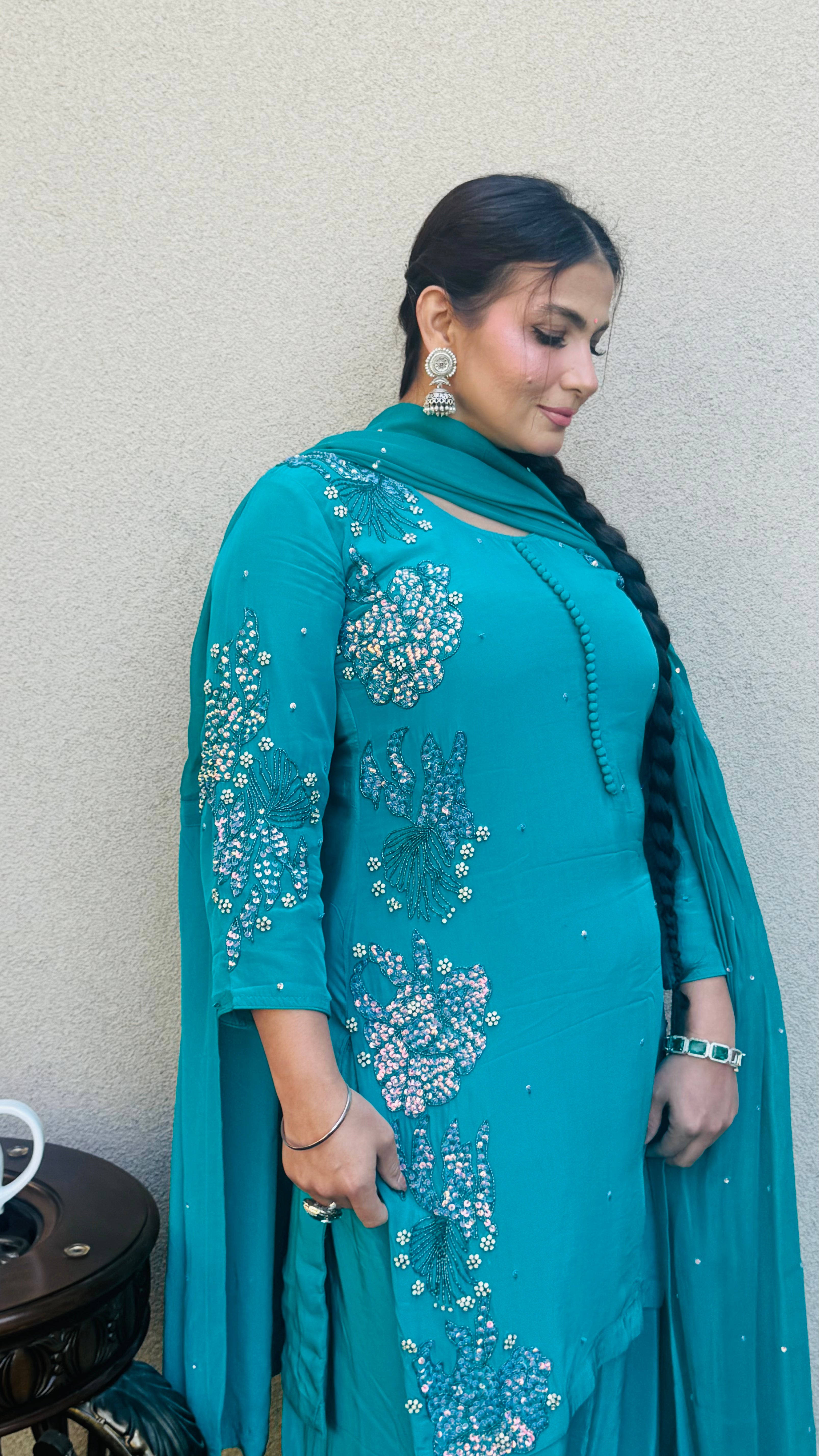Step into timeless grace with our ROOHANI Farshi Salwar Suit, crafted in a rich teal shade that radiates sophistication. The kurta is adorned with delicate embroidery on the neckline and sleeves, enhanced with tiny sequins for a subtle shimmer.