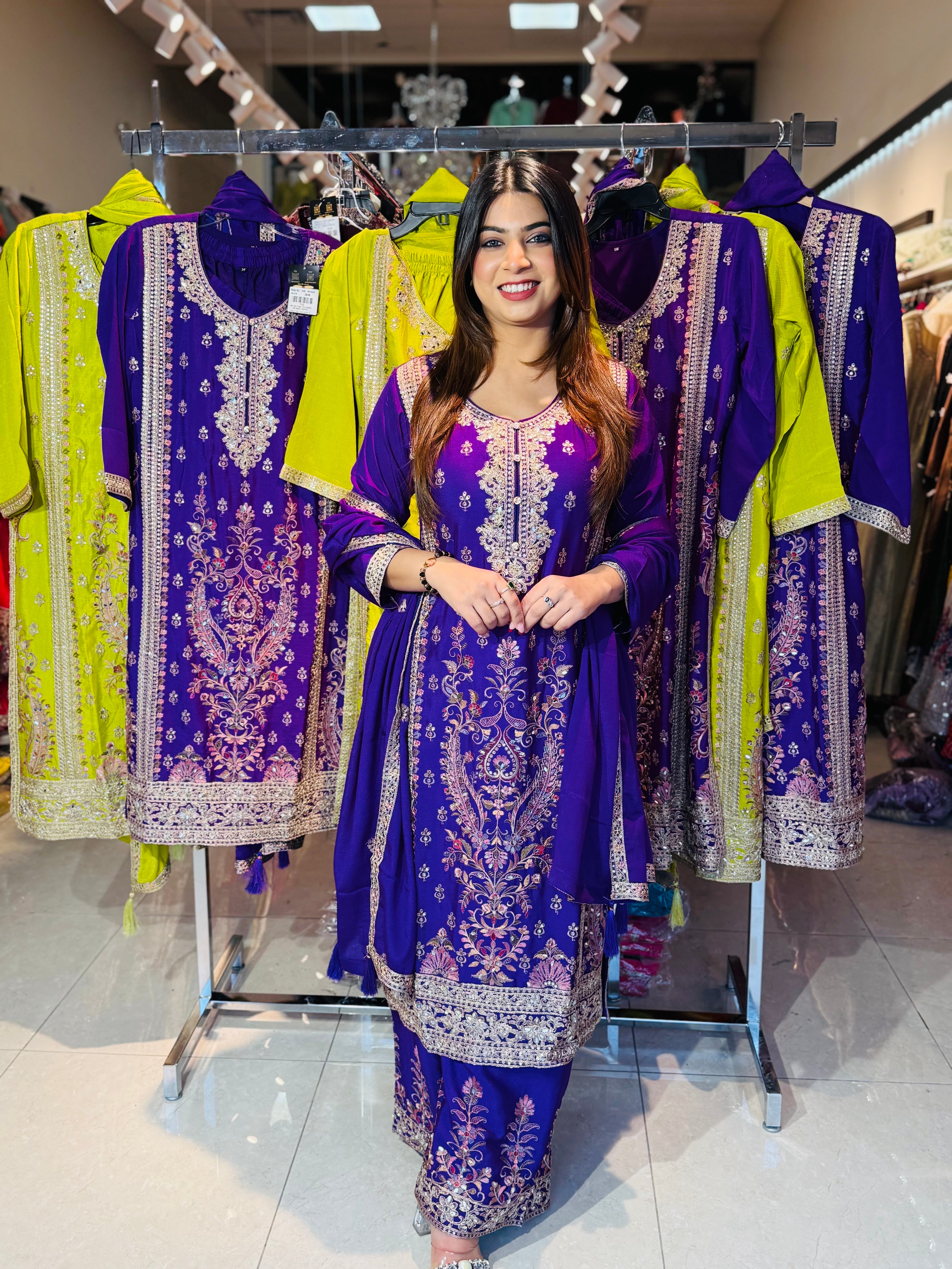 Step into regal elegance with our Royal Bloom Purple Suit Set – adorned with intricate embroidery and rich hues, perfect for festive moments and timeless celebrations.
