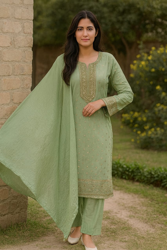 Add timeless elegance to your ethnic collection with this pastel green embroidered kurta set. Crafted from a soft, breathable fabric, the straight-cut kurta features delicate golden thread embroidery along the neckline, cuffs, and hemline.