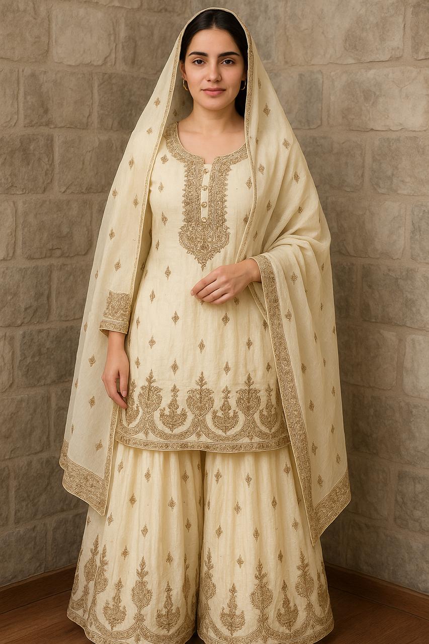 Exude regal charm with this elegant embroidered kurta sharara set, perfect for festive and wedding occasions.Paired with a flared sharara and a sheer dupatta adorned with delicate motifs, this ensemble brings together tradition and sophistication in every detail.