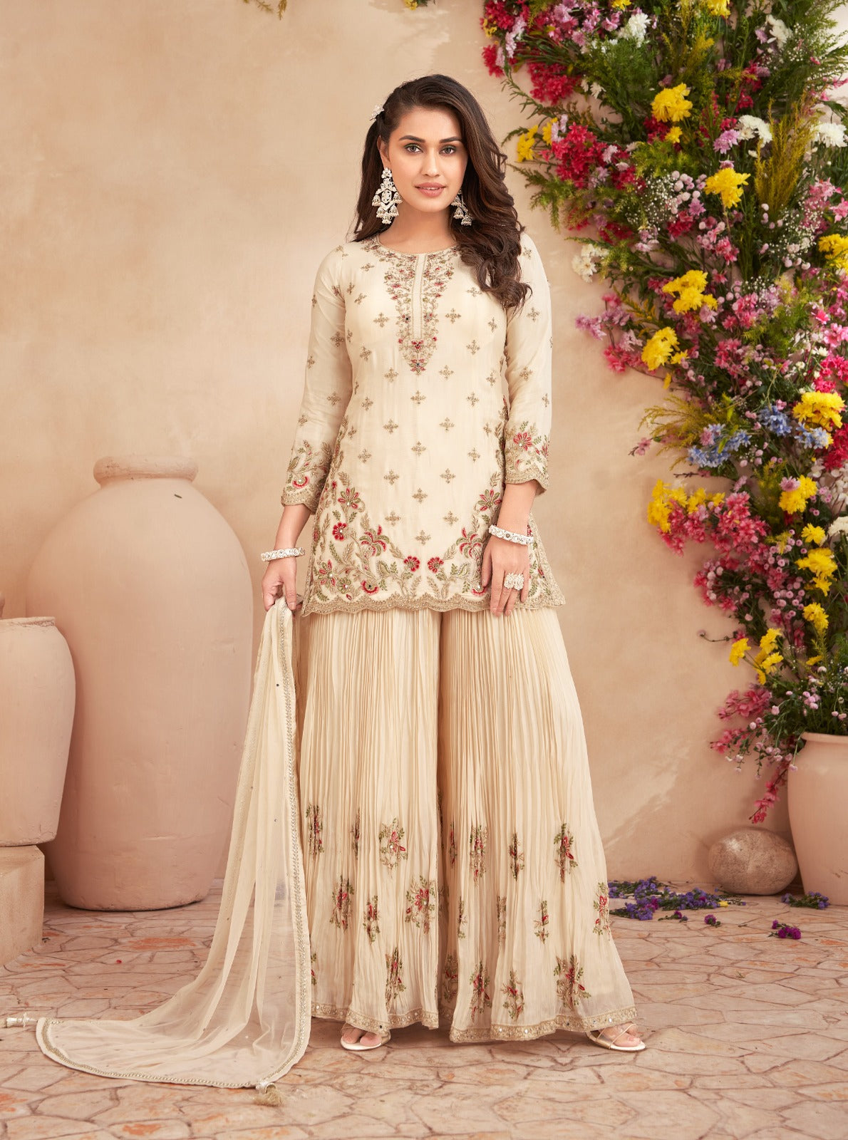 A graceful beige sharara suit designed for festive and wedding occasions. Featuring delicate thread embroidery with floral motifs, this outfit blends modern elegance with traditional charm.