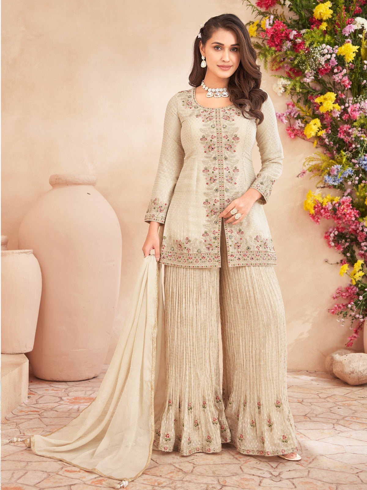 Exude subtle sophistication in this ivory floral embroidered kurta set, a timeless blend of grace and comfort. creafted from light weight fabric with a touch of shimmer , this outfit is perfect for festive occasionsn daytime celebrations or intimate gatherings.