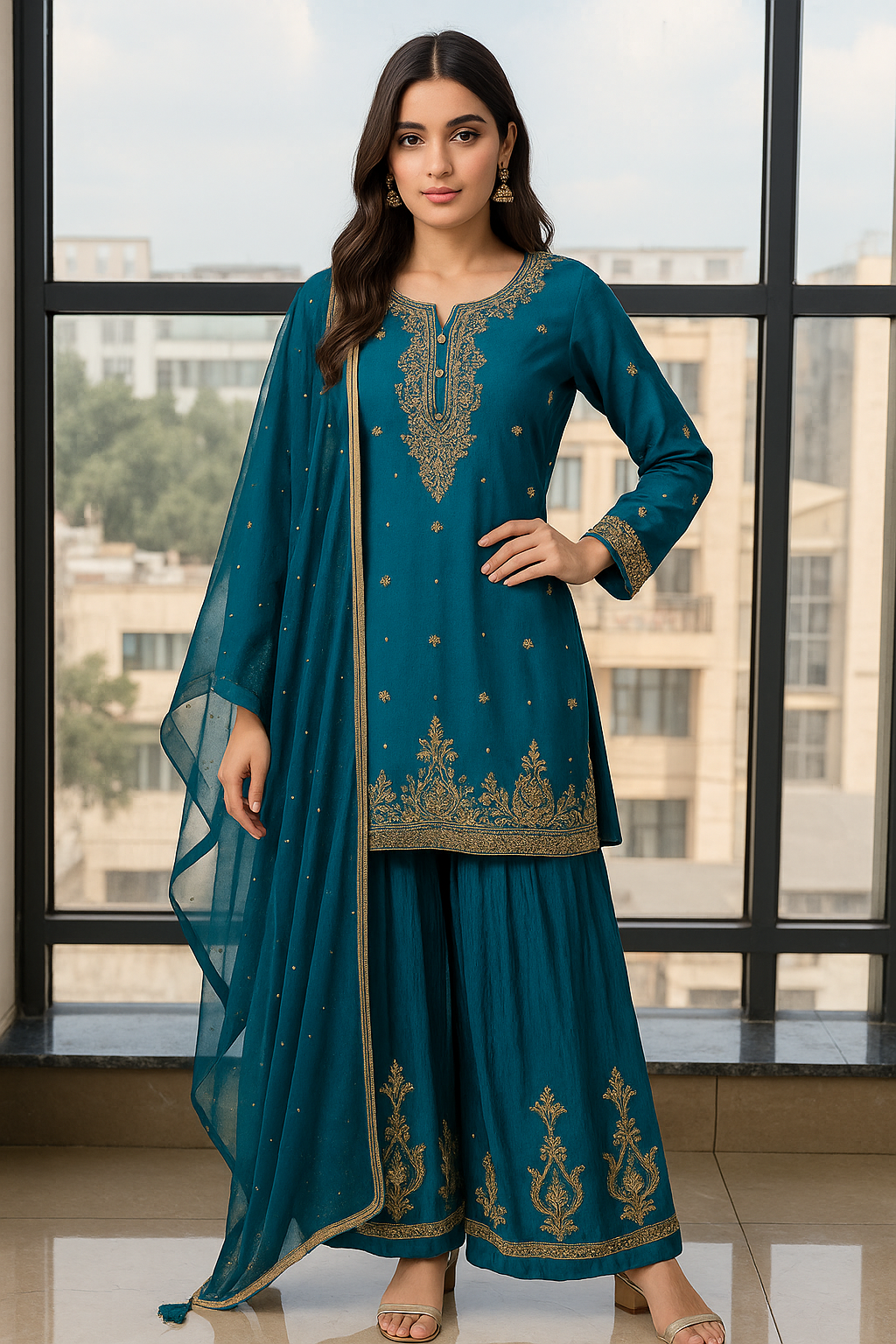 Elevate your festive and formal wardrobe with this stunning ethnic ensemble. The outfit exudes elegance with intricate embroidery and a timeless silhouette, making it perfect for weddings, parties, and traditional gatherings.