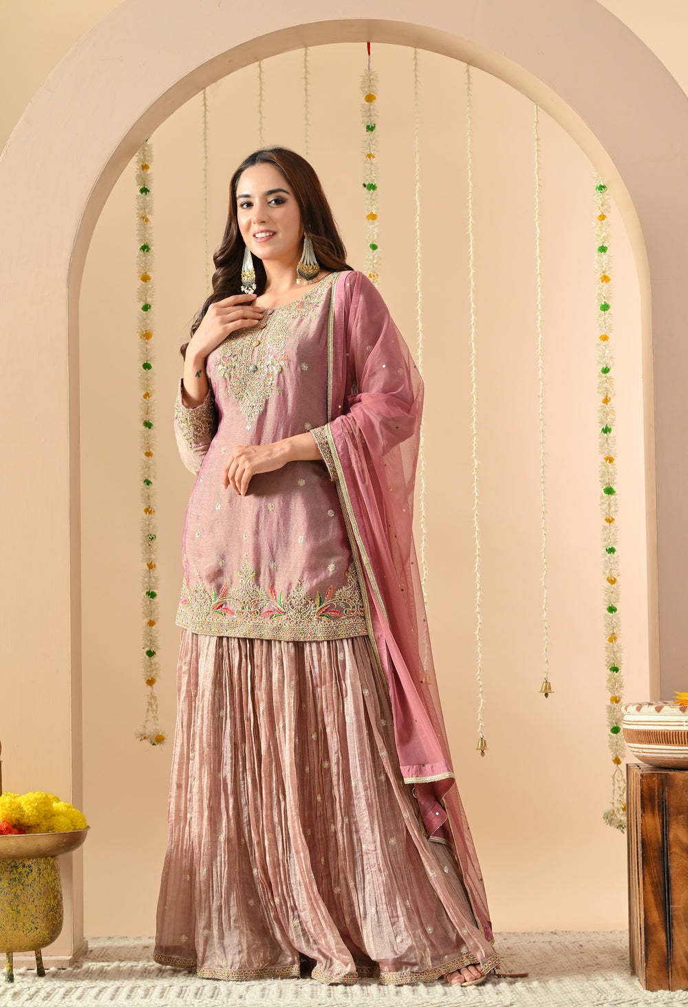This elegant ethnic ensemble Lehenga is designed with intricate embellishments, perfect for festive and wedding occasions. The outfit reflects a rich traditional appeal while maintaining modern sophistication.