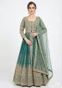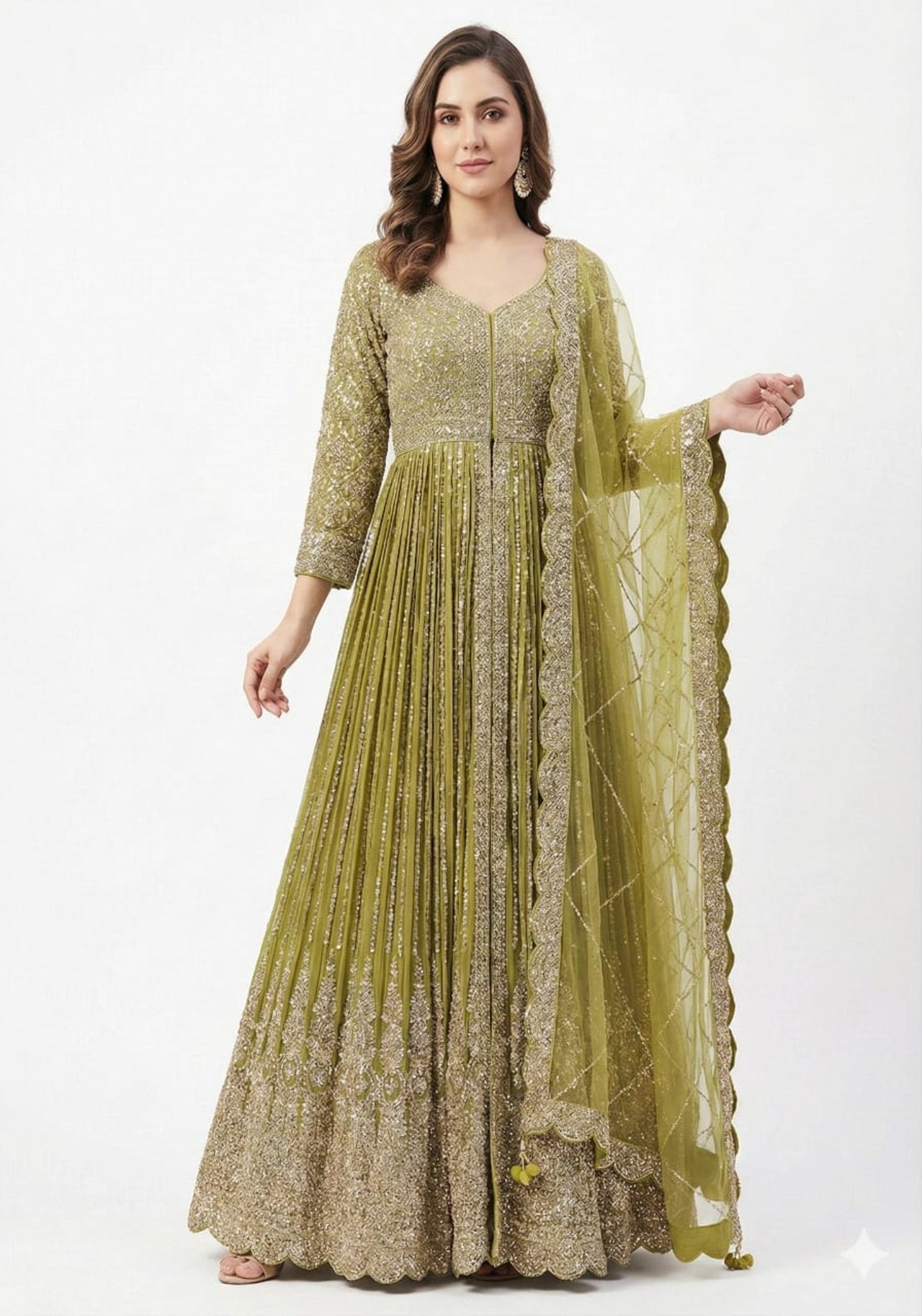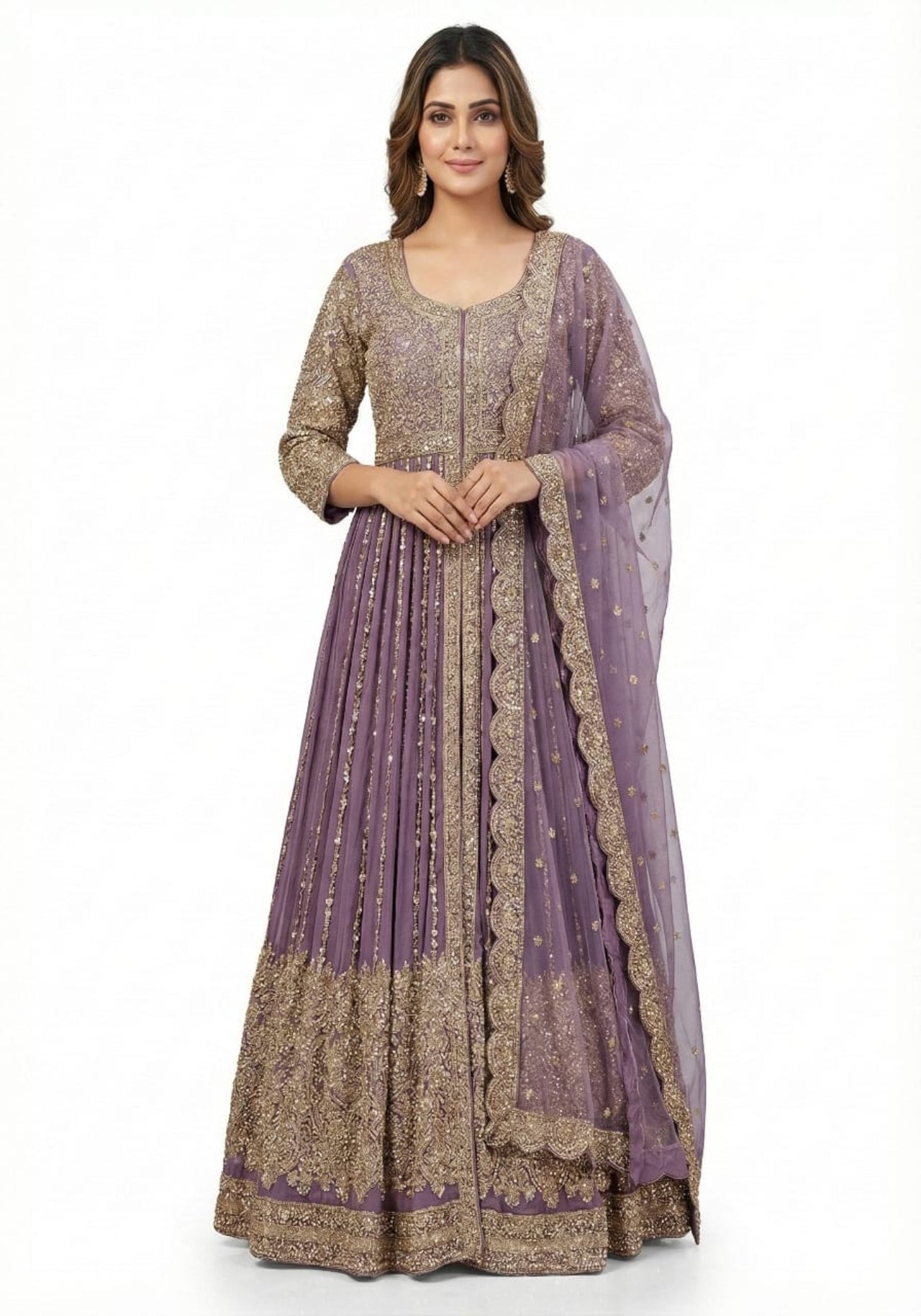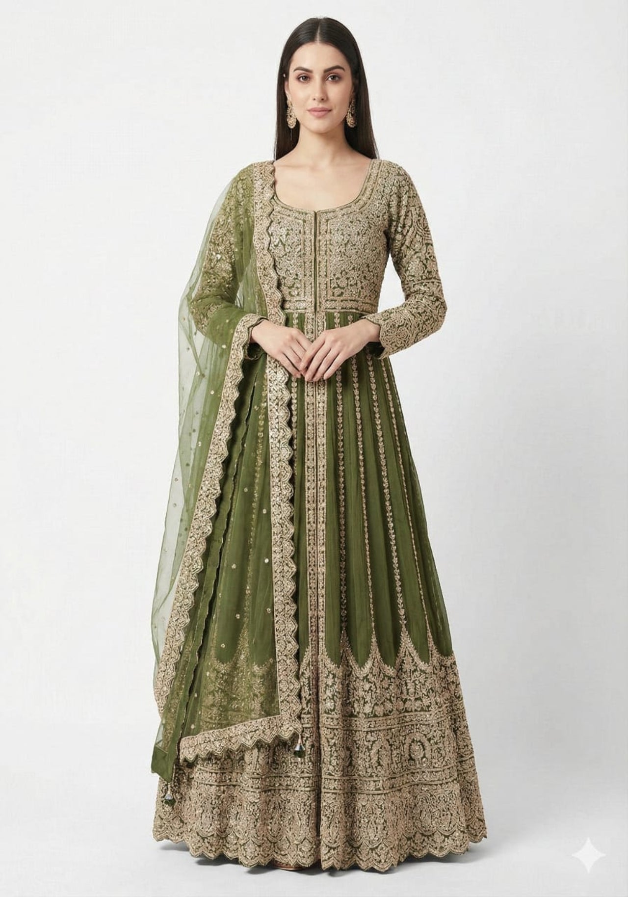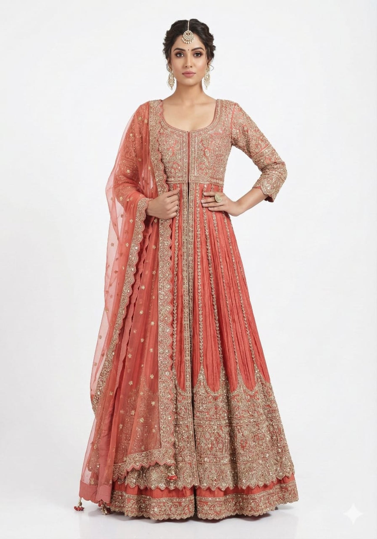 Graceful lehenga style Anarkali featuring intricate embroidery, a richly flared silhouette, and a sheer dupatta. Available in multiple colors, ideal for weddings, festive wear, and special occasions.