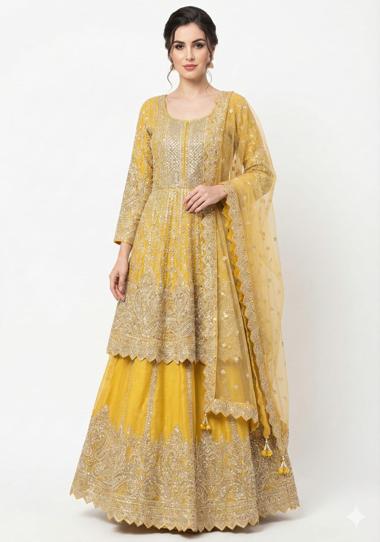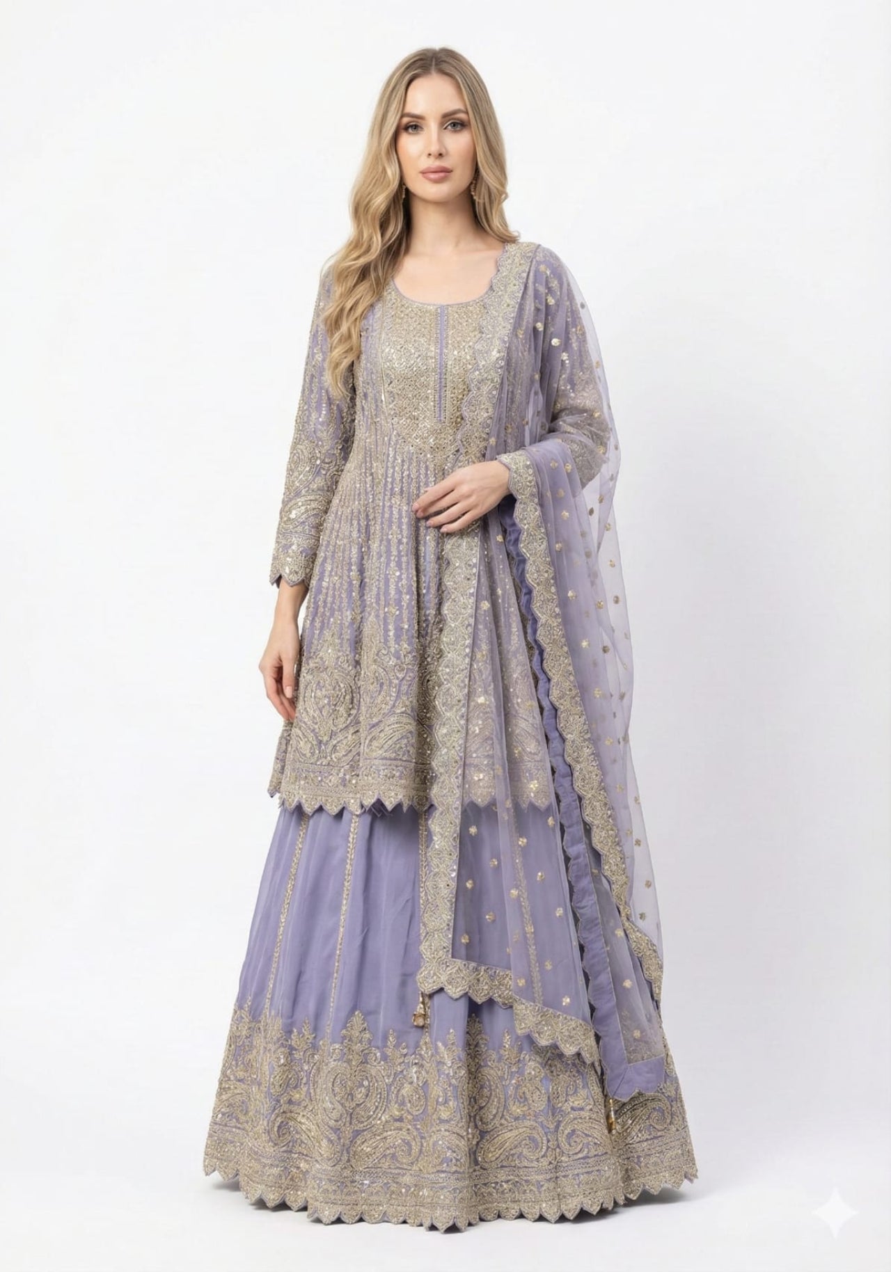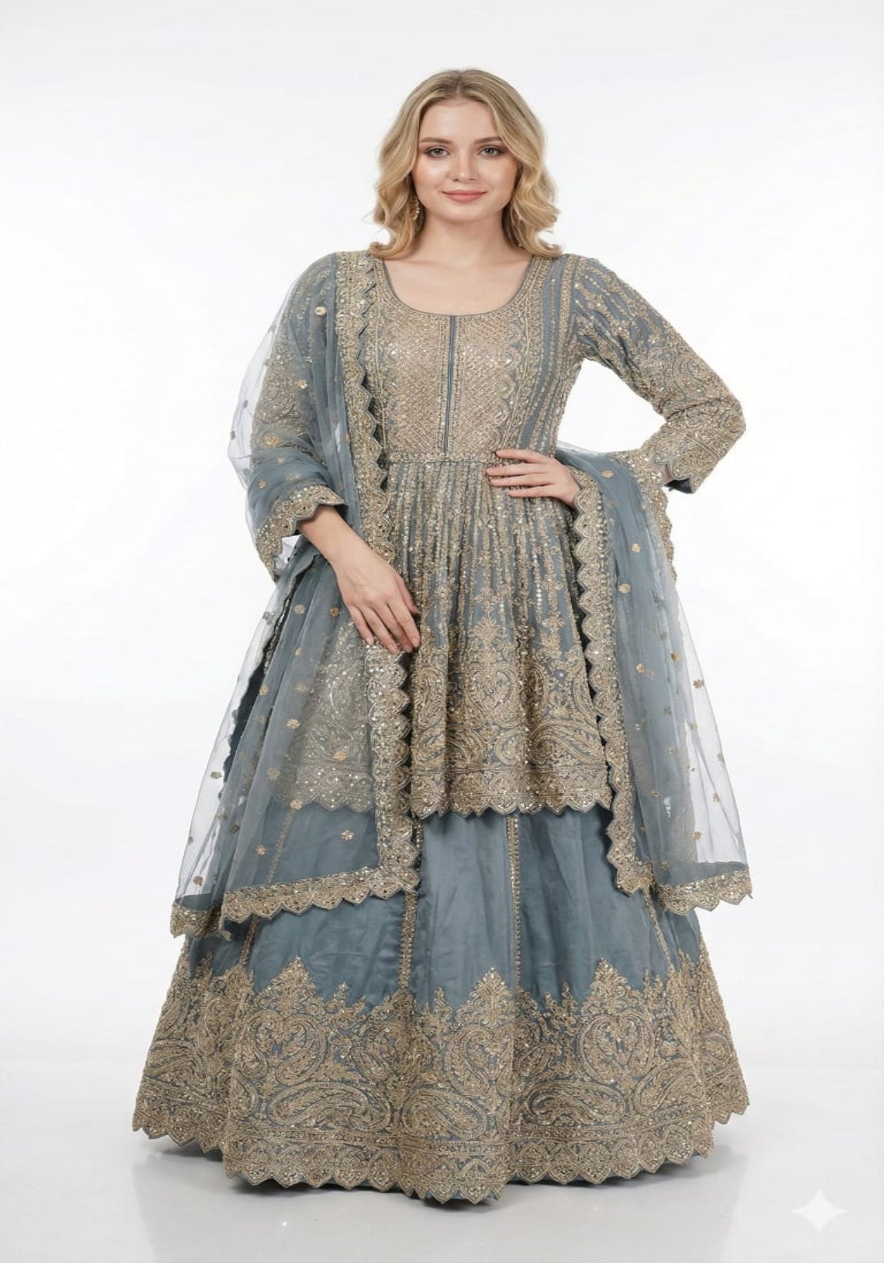 Graceful lehenga set featuring a richly embroidered kurta-style blouse, flowy lehenga skirt with detailed hem embroidery, and a matching net dupatta. Perfect for weddings, festive occasions, and celebrations. Available in multiple colors.