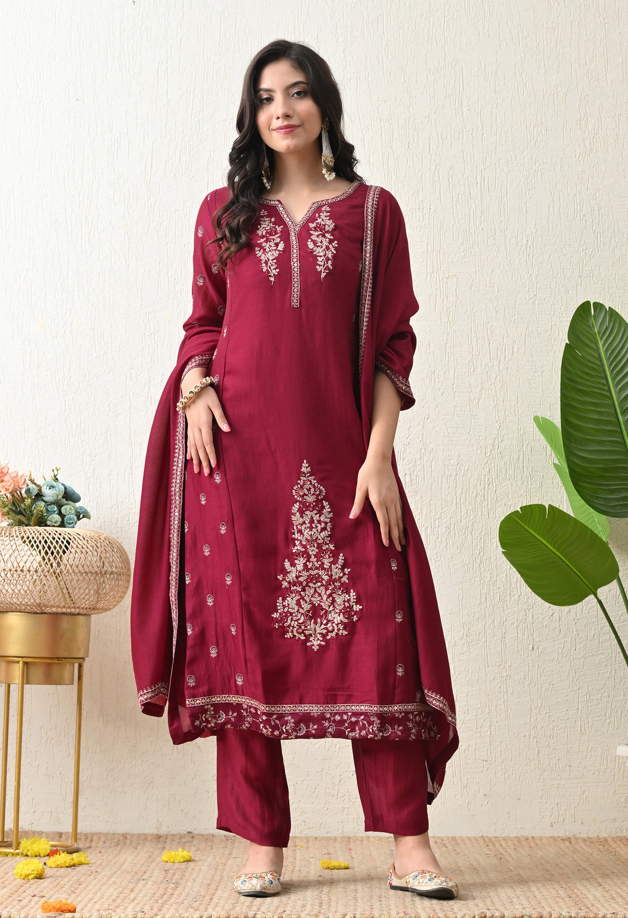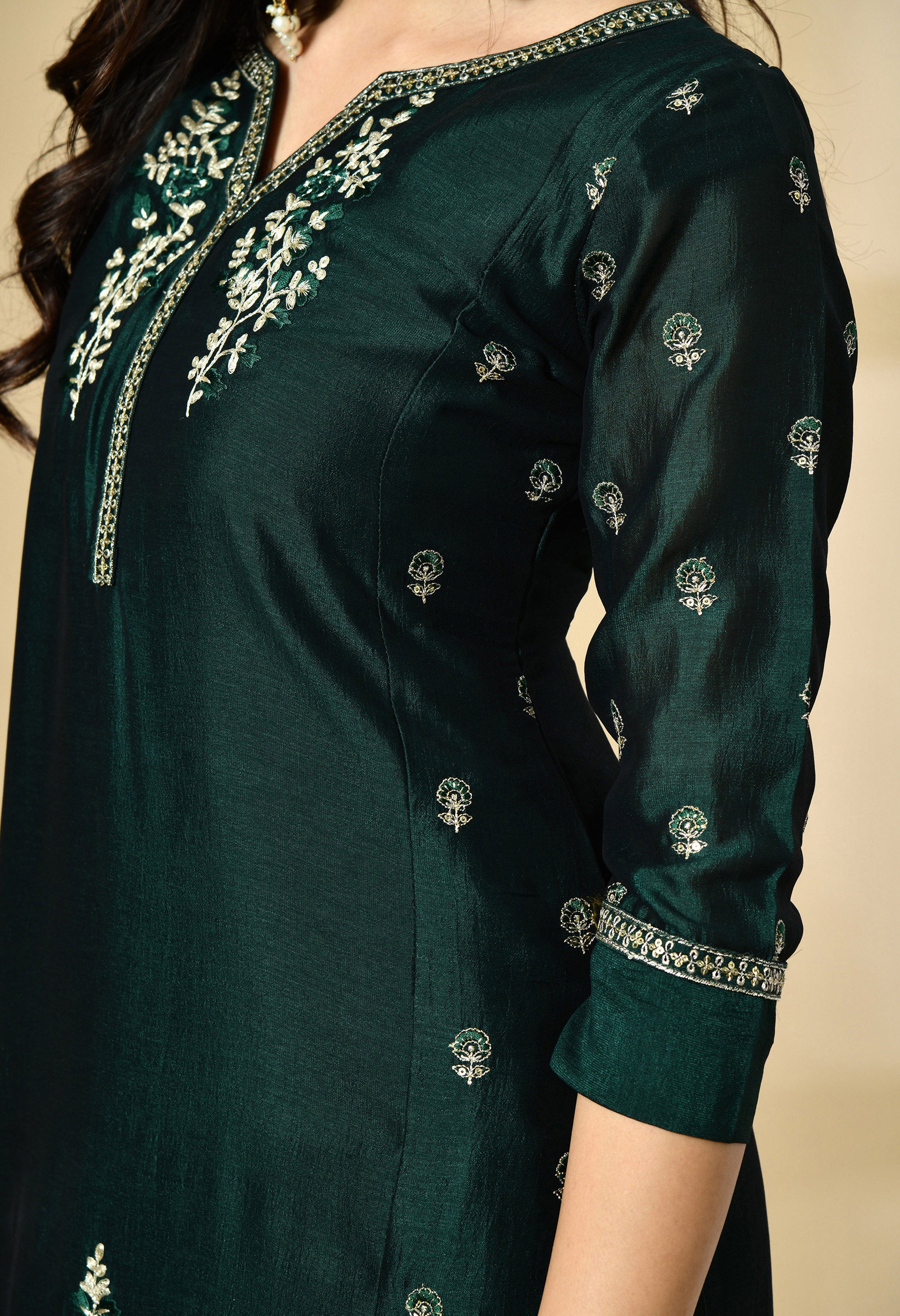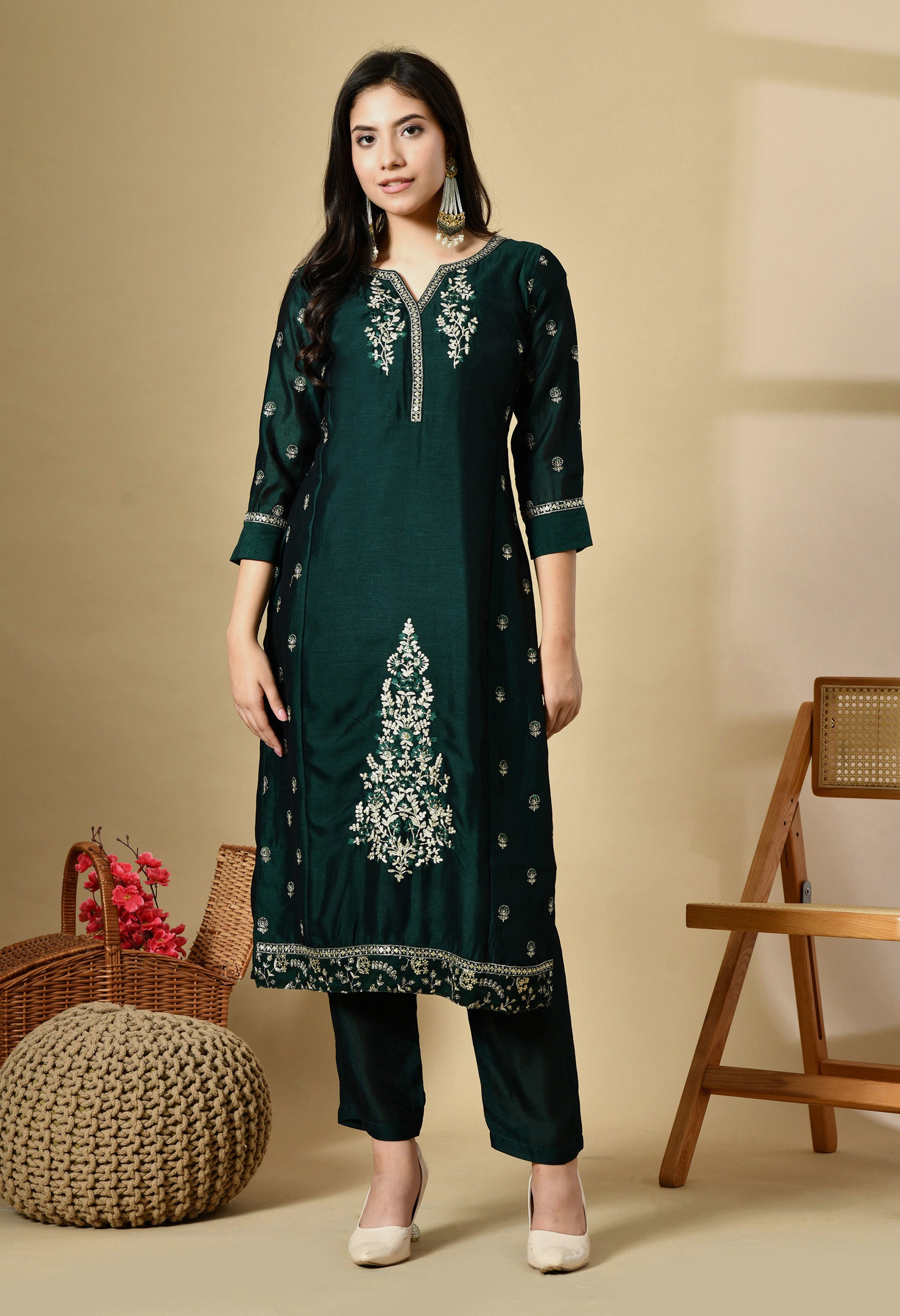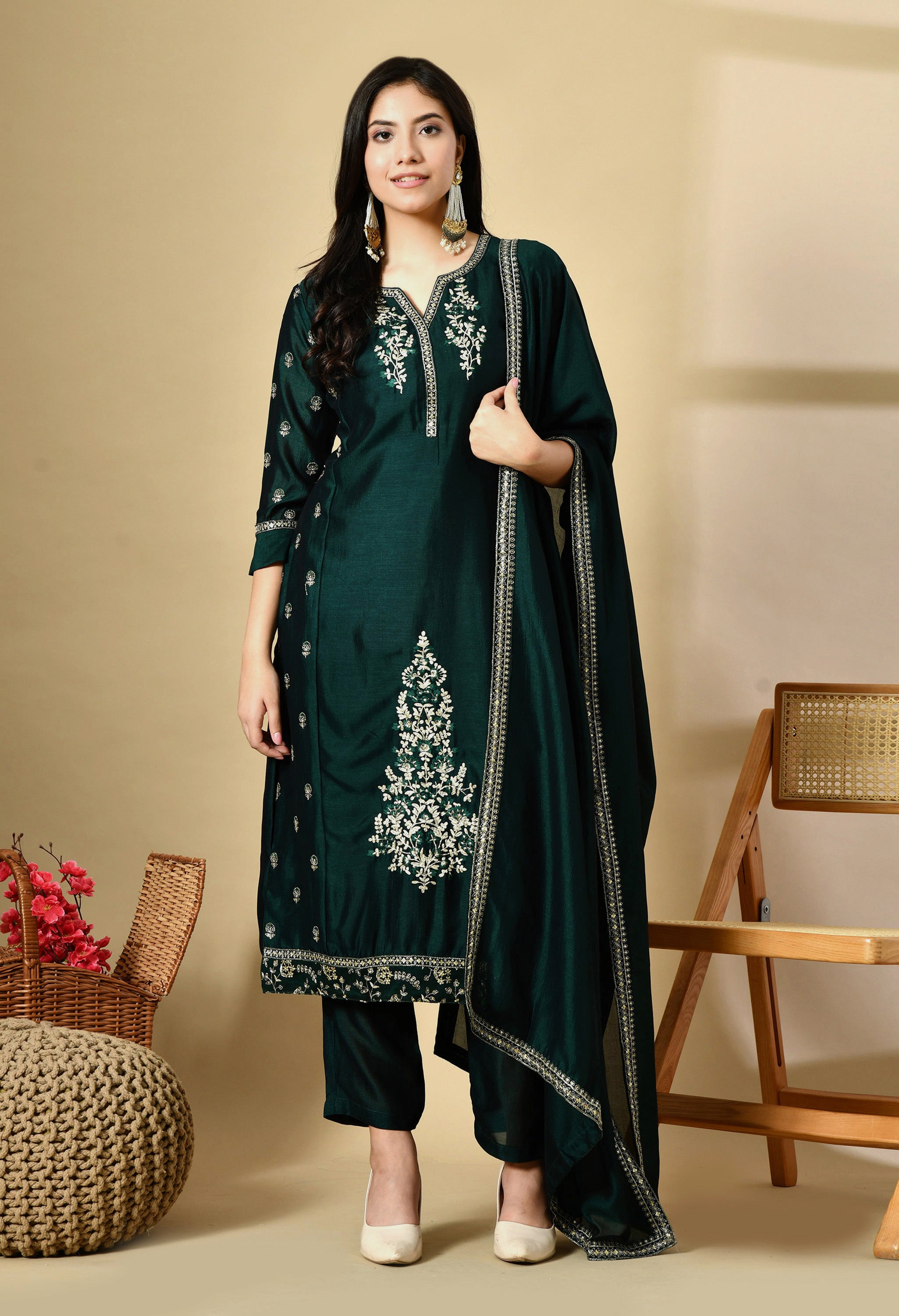 Step into royal charm with the Kanak suit , a deep emerald green ensemble adorned with intricate antique gold woven patterns. The rich brocade fabric exudes timeless sophistication, while the vibrant pink net dupatta, delicately embellished adds a festive pop of color. Paired with matching pants, this suit is perfect for weddings, Rakhi celebrations, or any special occasion where you want to stand out in regal elegance.