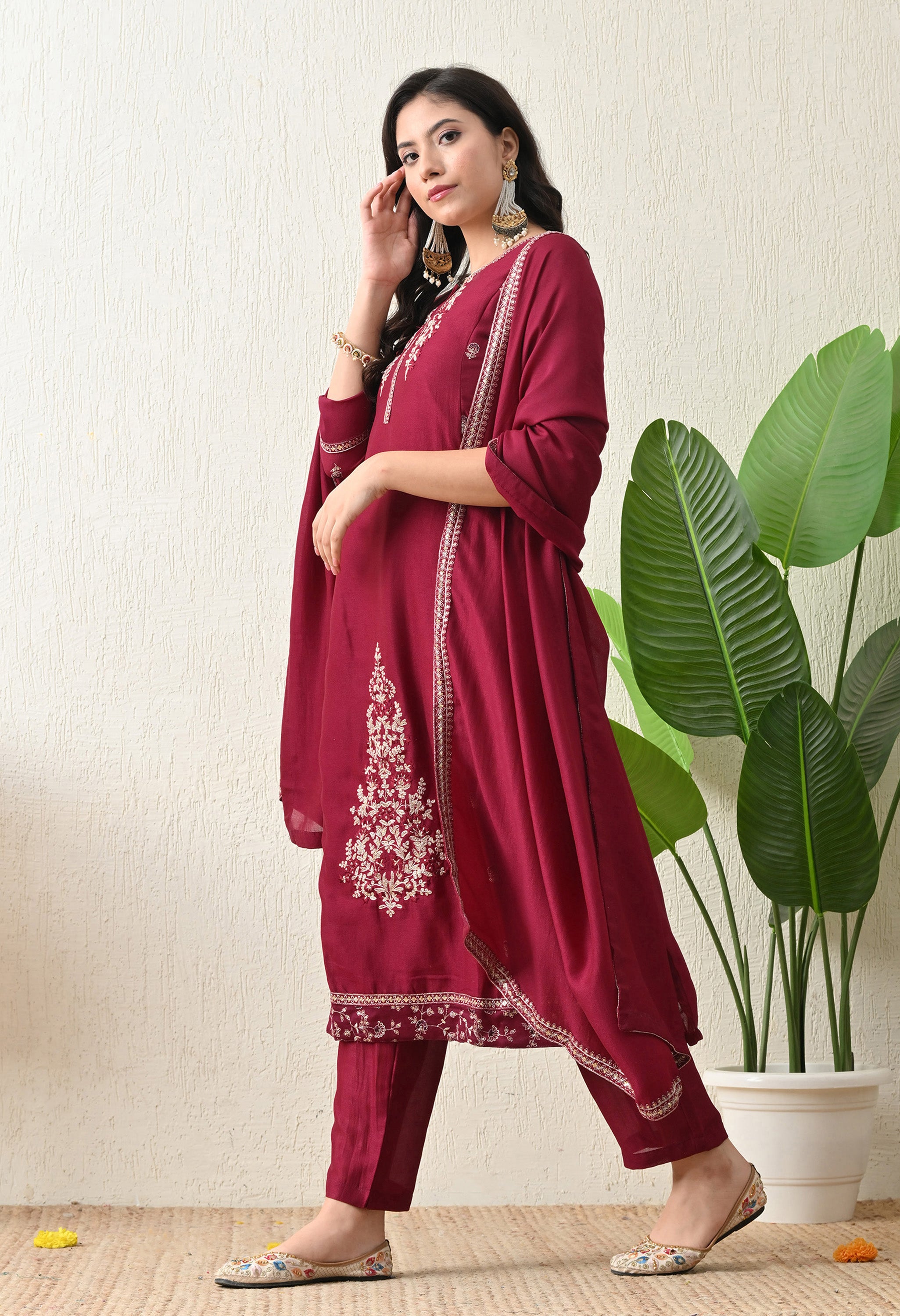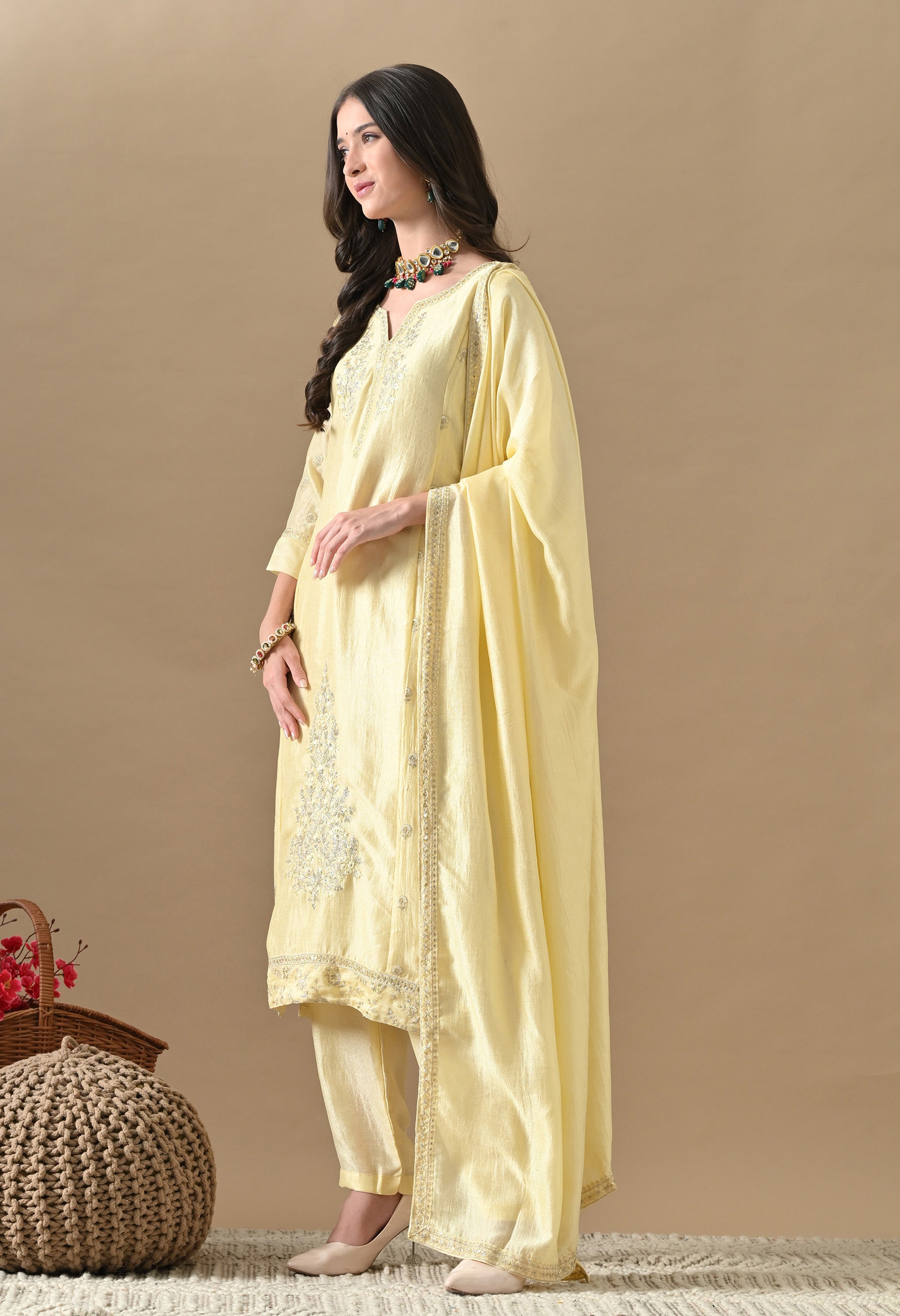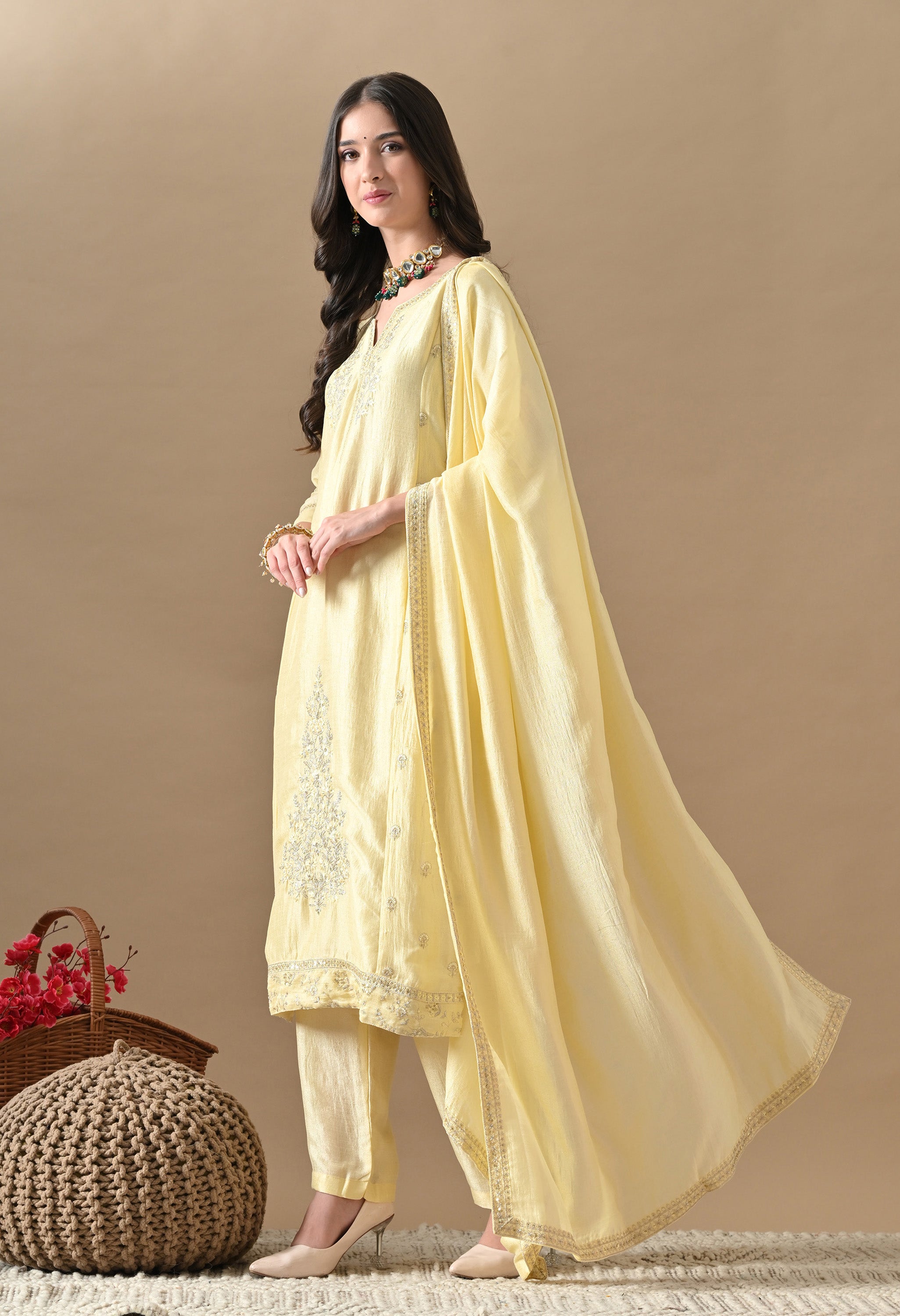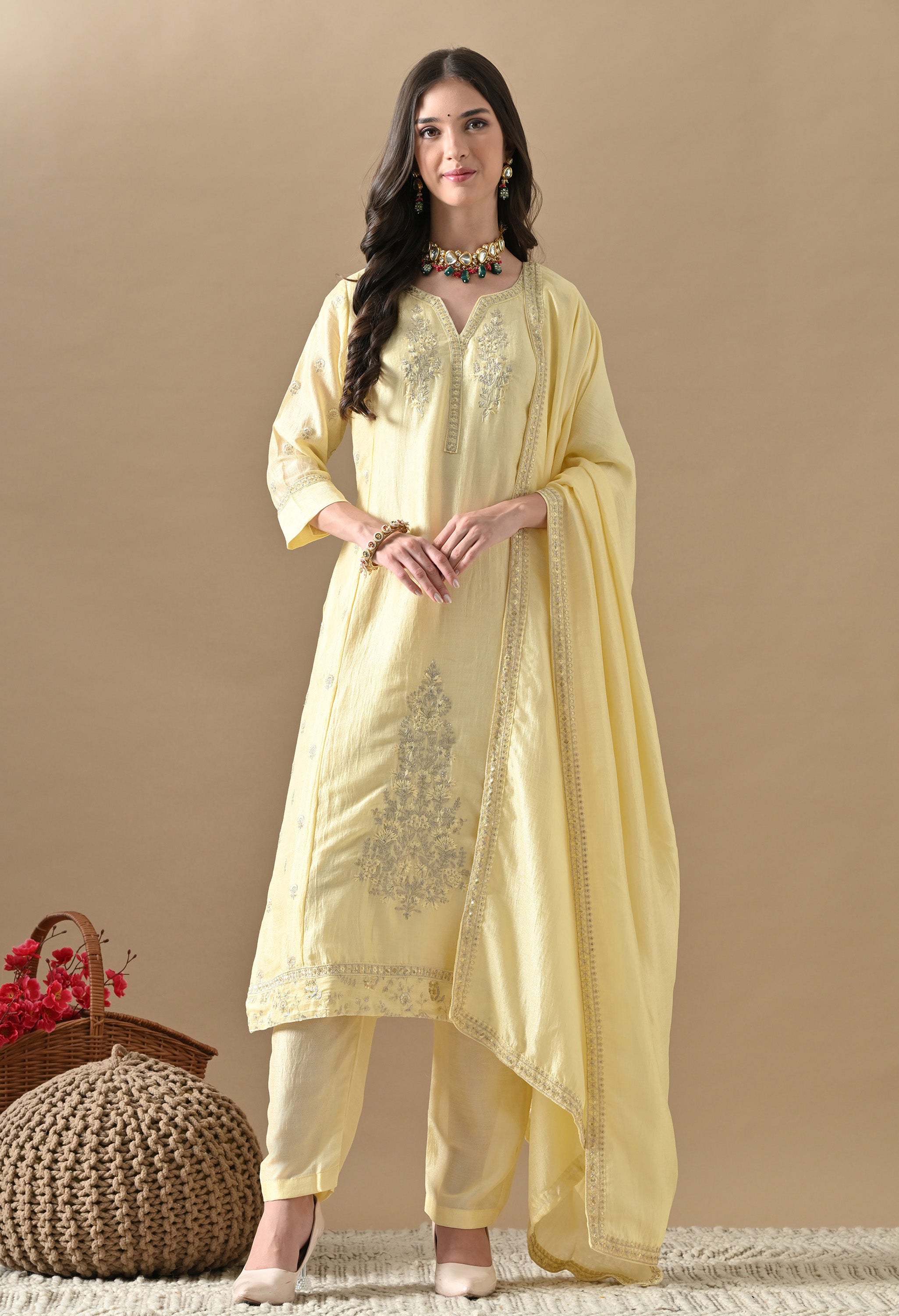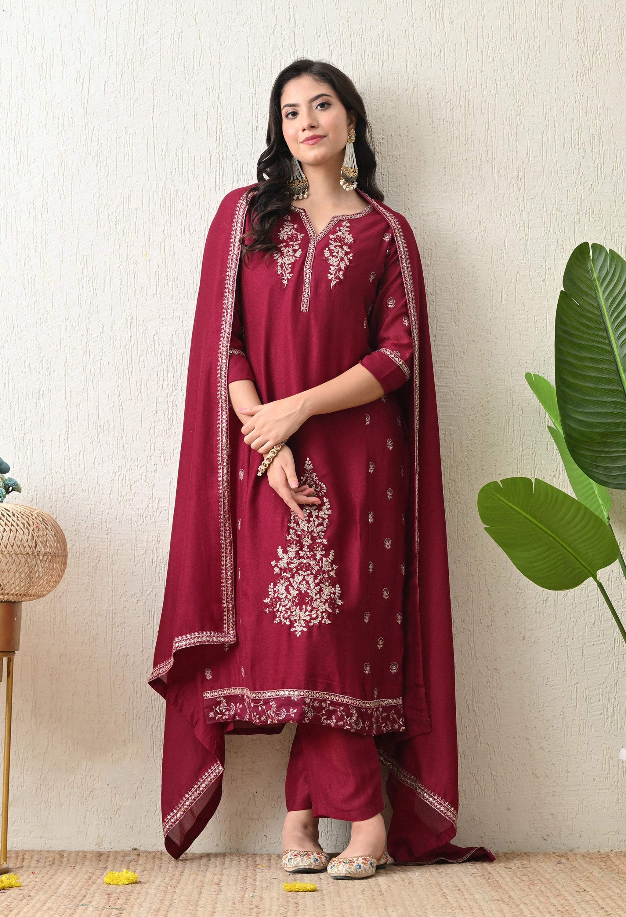 Step into royal charm with the Kanak suit , a deep emerald green ensemble adorned with intricate antique gold woven patterns. The rich brocade fabric exudes timeless sophistication, while the vibrant pink net dupatta, delicately embellished adds a festive pop of color. Paired with matching pants, this suit is perfect for weddings, Rakhi celebrations, or any special occasion where you want to stand out in regal elegance.