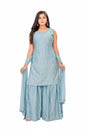 This elegant ethnic ensemble Sharara is designed with a contemporary yet traditional appeal. The set includes a sleeveless kurta, flared sharara bottom, and a matching dupatta, making it a complete outfit for festive and semi-formal occasions.