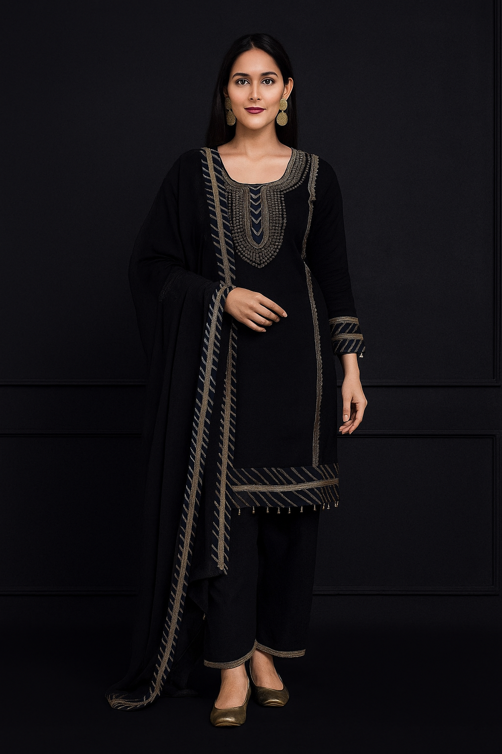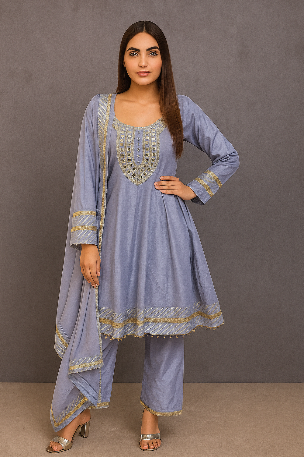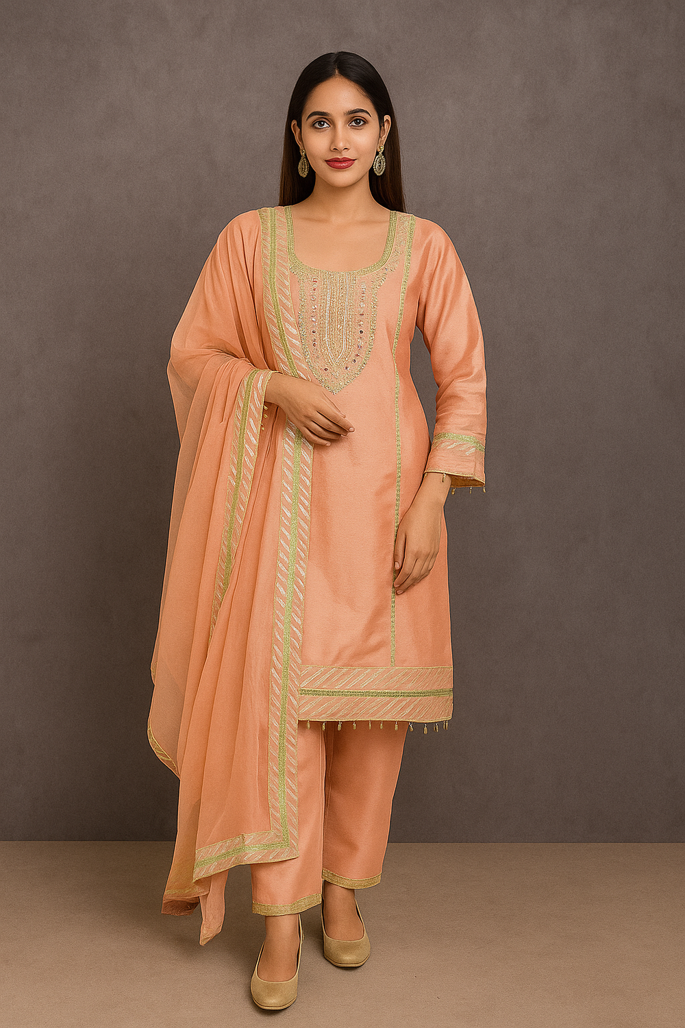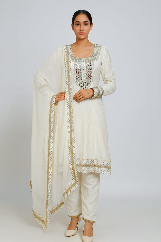 Radiate grace and sophistication with this stunning ivory kurta set, featuring intricate mirror embroidery on the neckline and sleeves. Crafted from a rich silk blend fabric, it’s paired with matching straight pants and a light chiffon dupatta bordered with zari and mirror accents. Perfect for festive celebrations or elegant gatherings.