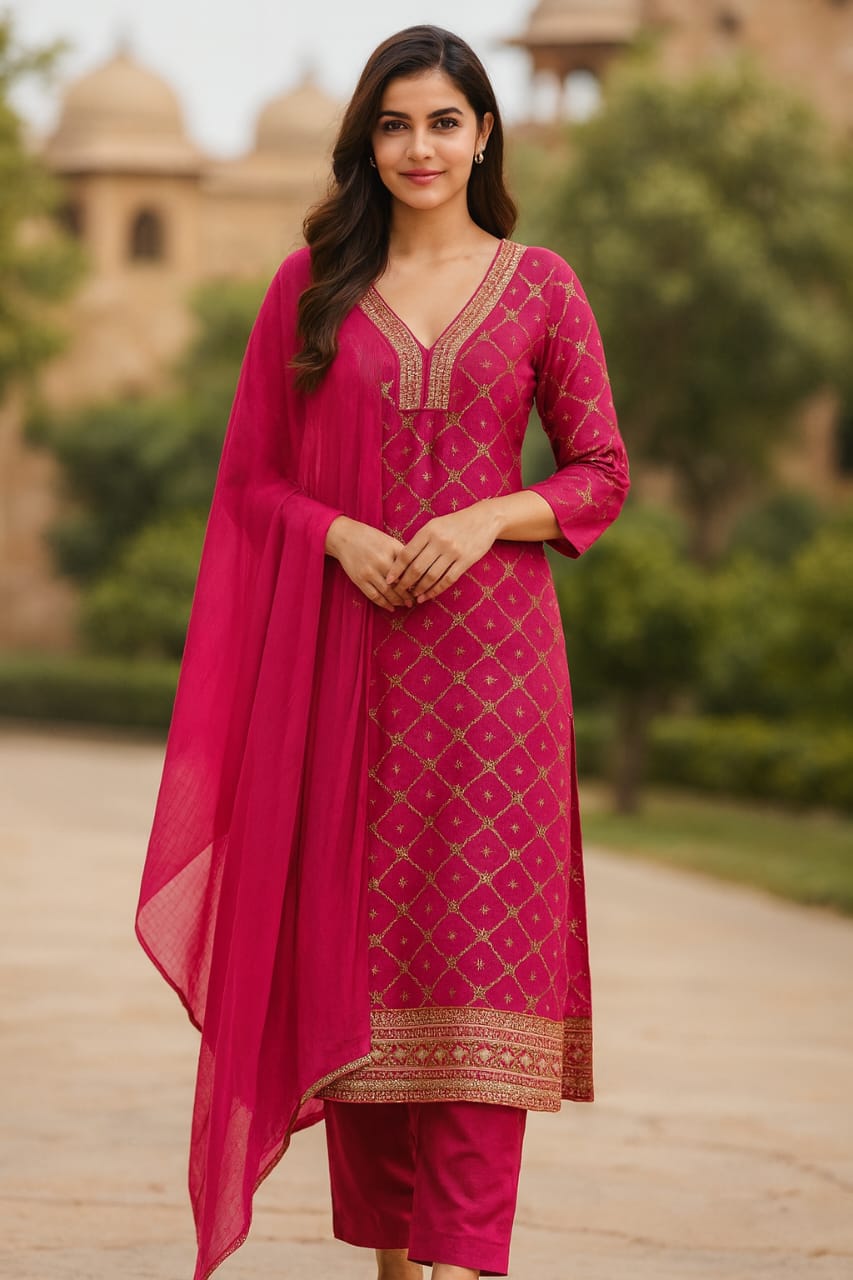 Make a graceful style statement with this stunning silk-blend embroidered straight suit set, designed to elevate your festive and special-occasion wardrobe.