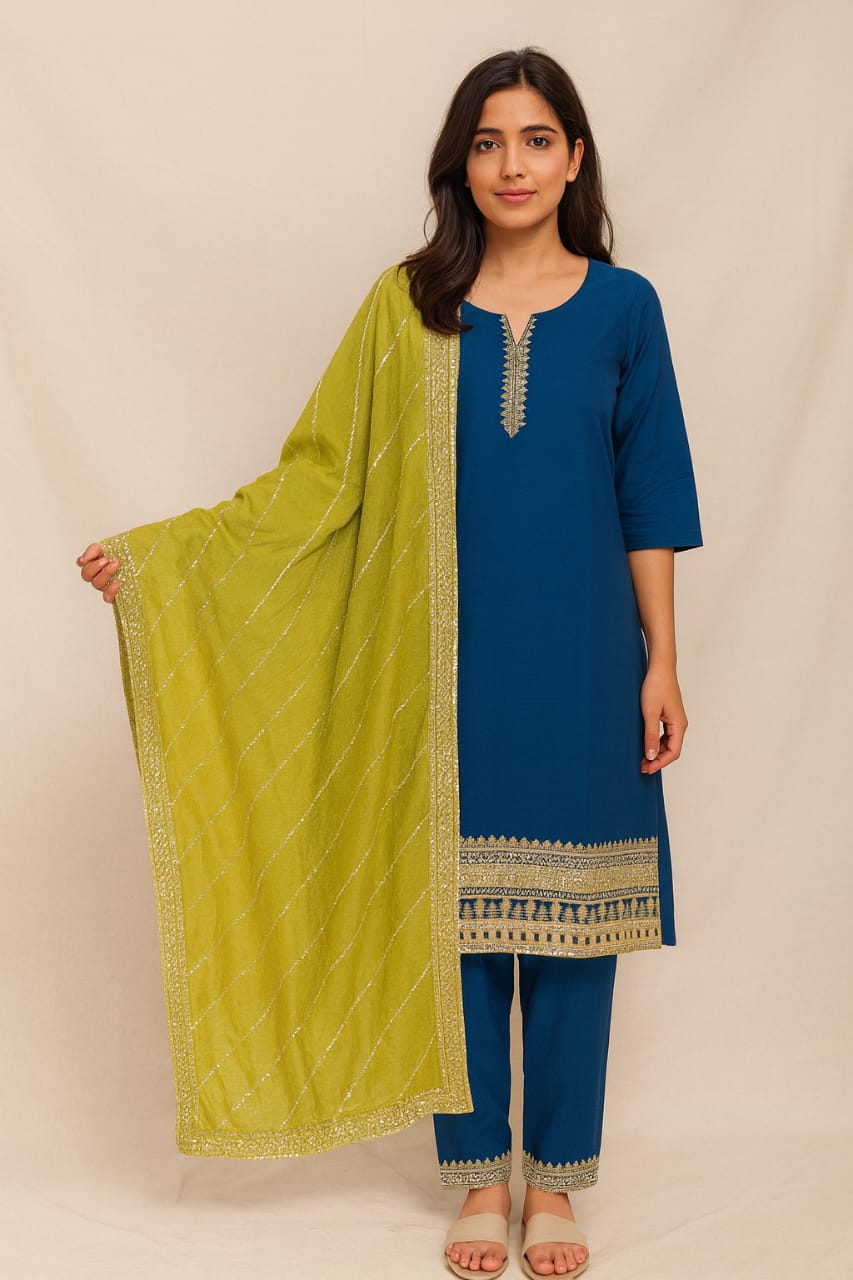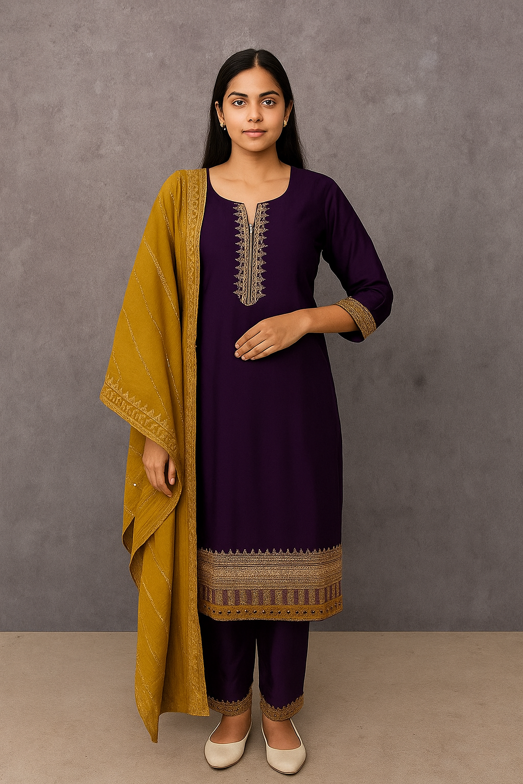 A royal combination of elegance and charm, this deep purple embroidered kurta set is crafted to elevate your ethnic wardrobe. Featuring delicate golden thread embroidery on the neckline, sleeves, and hemline, it is paired beautifully with a contrasting mustard dupatta adorned with shimmer stripes. Perfect for festive occasions and family gatherings.