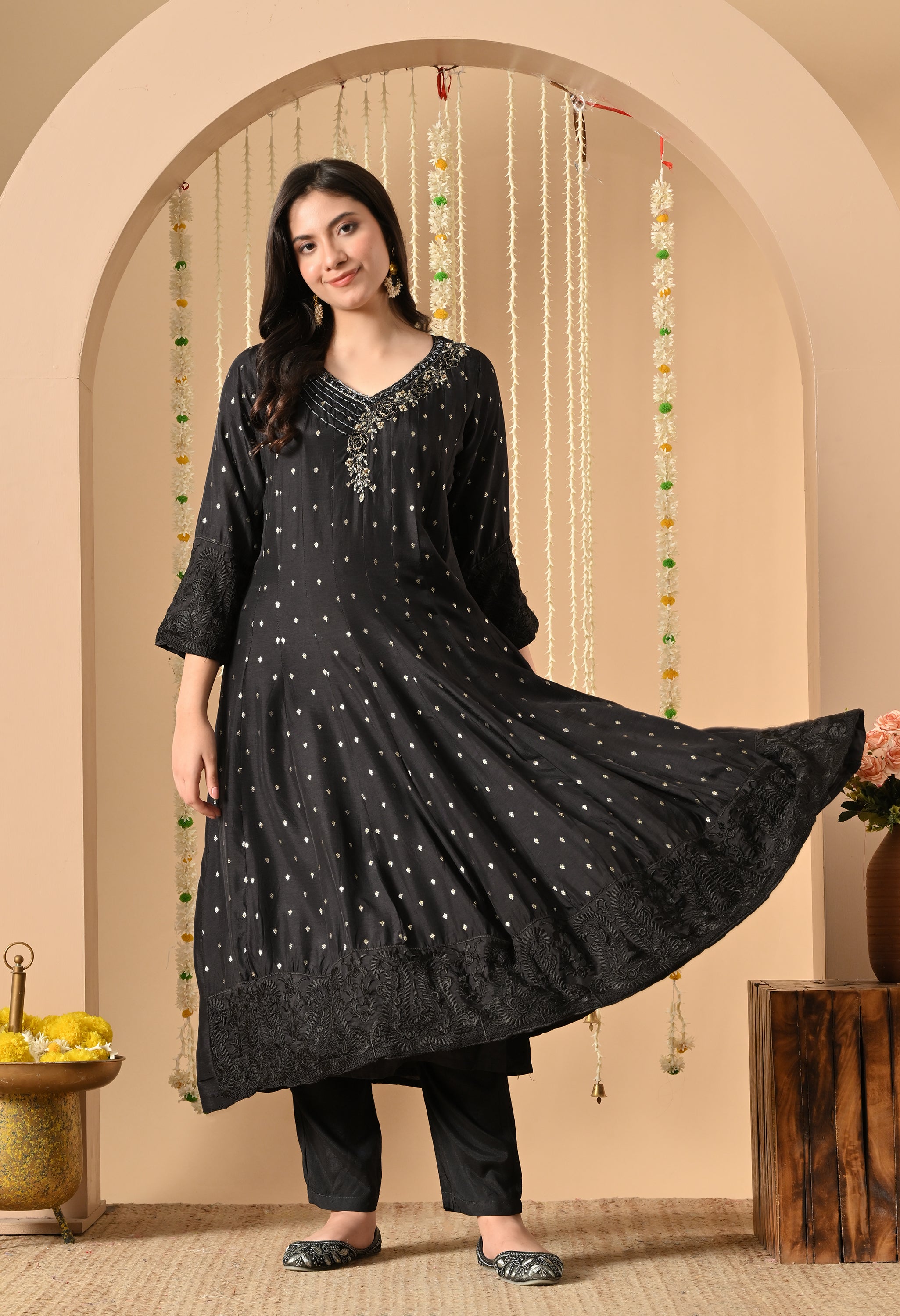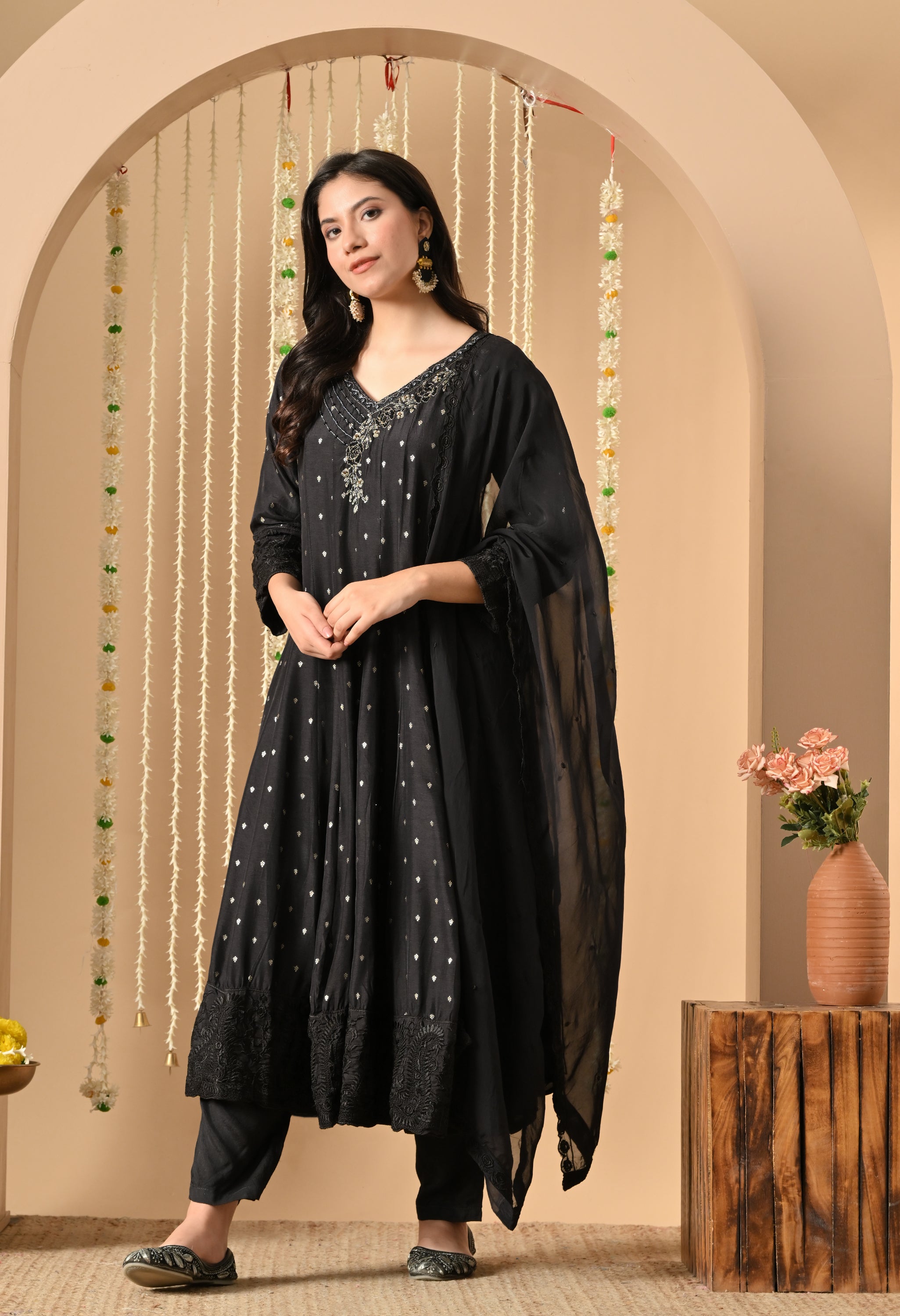 Channel timeless elegance with our starry veil set, a luxurious black ensemble designed to captivate. Crafted in soft rayon with delicate silver buti work throughout, the flared kurta is adorned with intricate thread embroidery on the neckline and border, creating a regal statement. Paired with matching pants and a lightweight dupatta with lace detailing, this suit is a perfect blend of tradition and contemporary charm—ideal for evening gatherings, festive nights, or intimate functions.