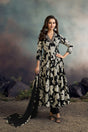 Turn heads with this striking black Anarkali suit featuring bold white floral prints. The flowy flare of the kurta adds elegance, while the embroidered V-neckline with delicate beadwork enhances its regal appeal.