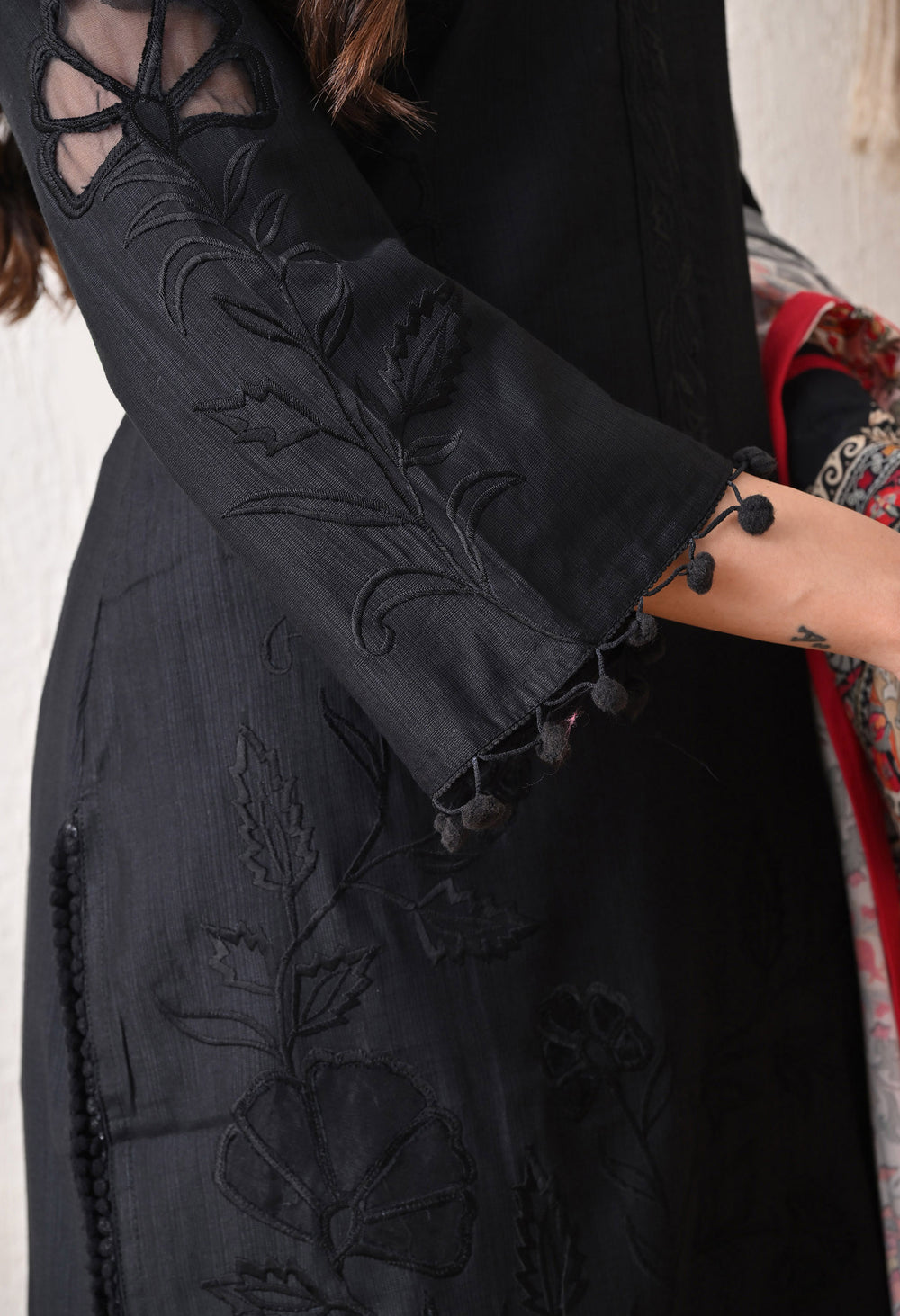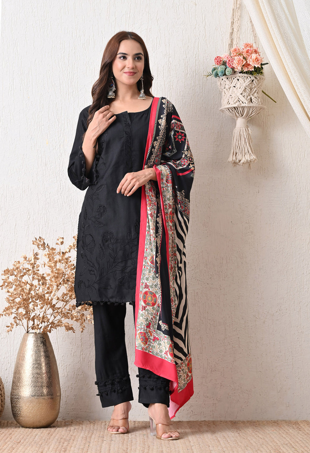 Add effortless elegance to your wardrobe with our sundar safedi suit set, a beautiful blend of grace and comfort. The soft ivory kurta is adorned with delicate tone-on-tone thread embroidery and pom-pom lace details at the sleeves and hem, giving it a subtle charm. Paired with matching straight pants featuring coordinated lacework, the look is elevated by a statement dupatta with bold zebra print, vibrant floral accents, and a striking red border.
