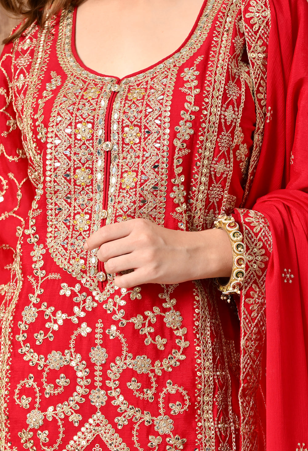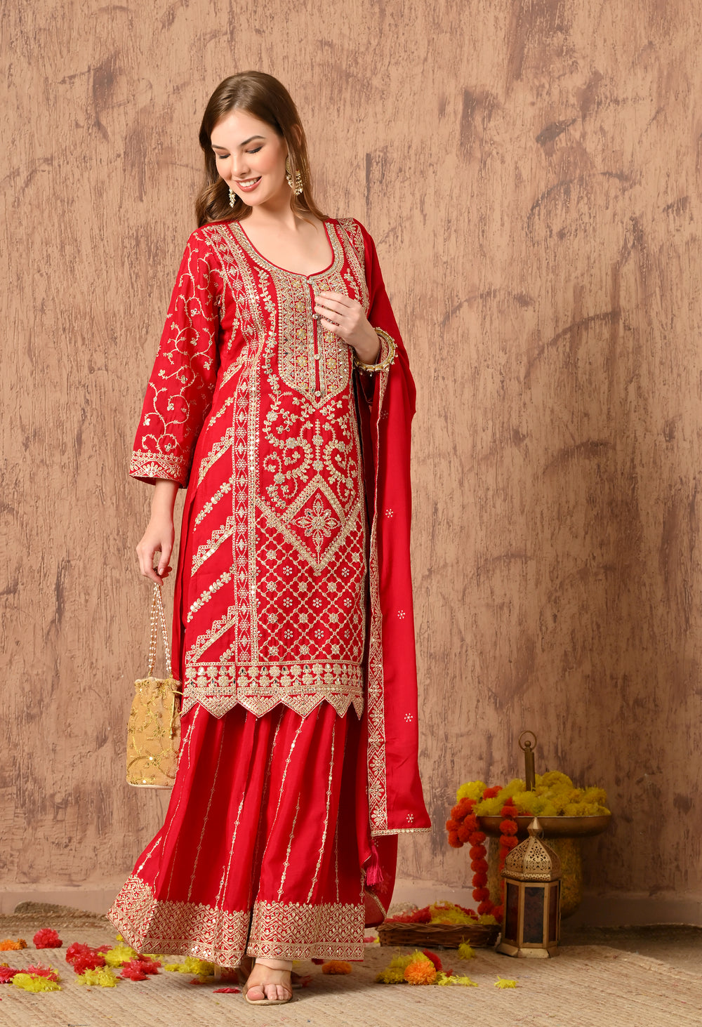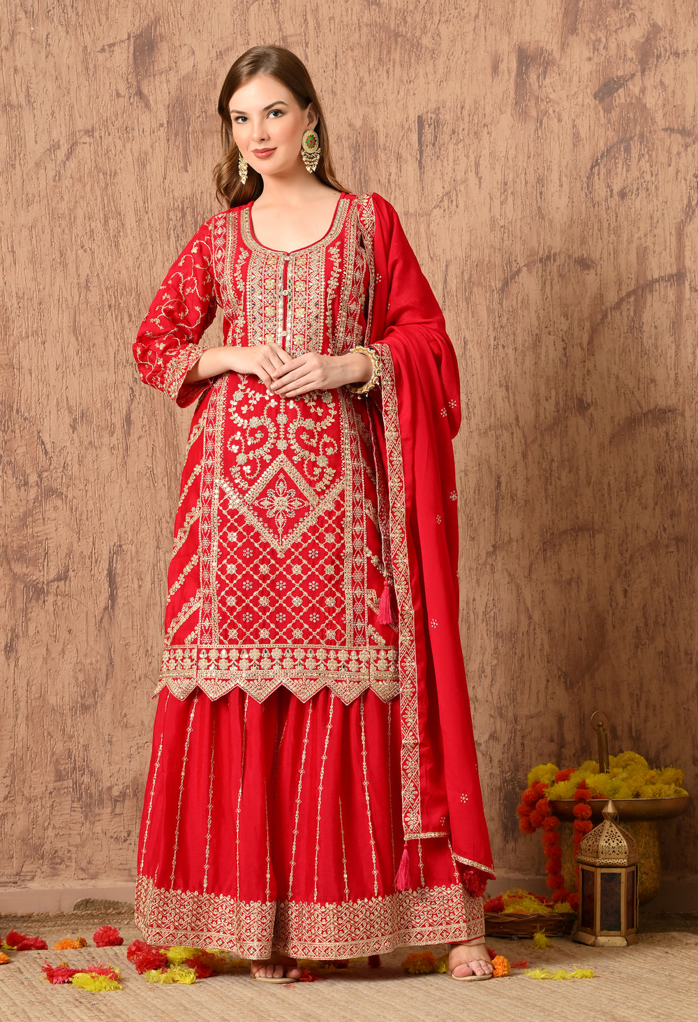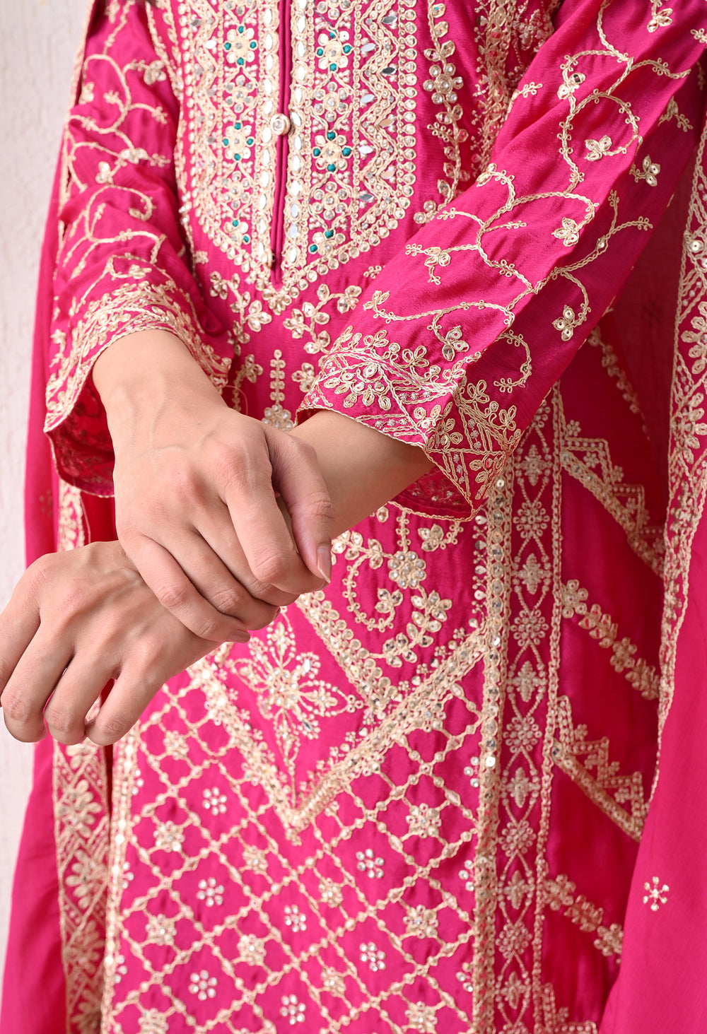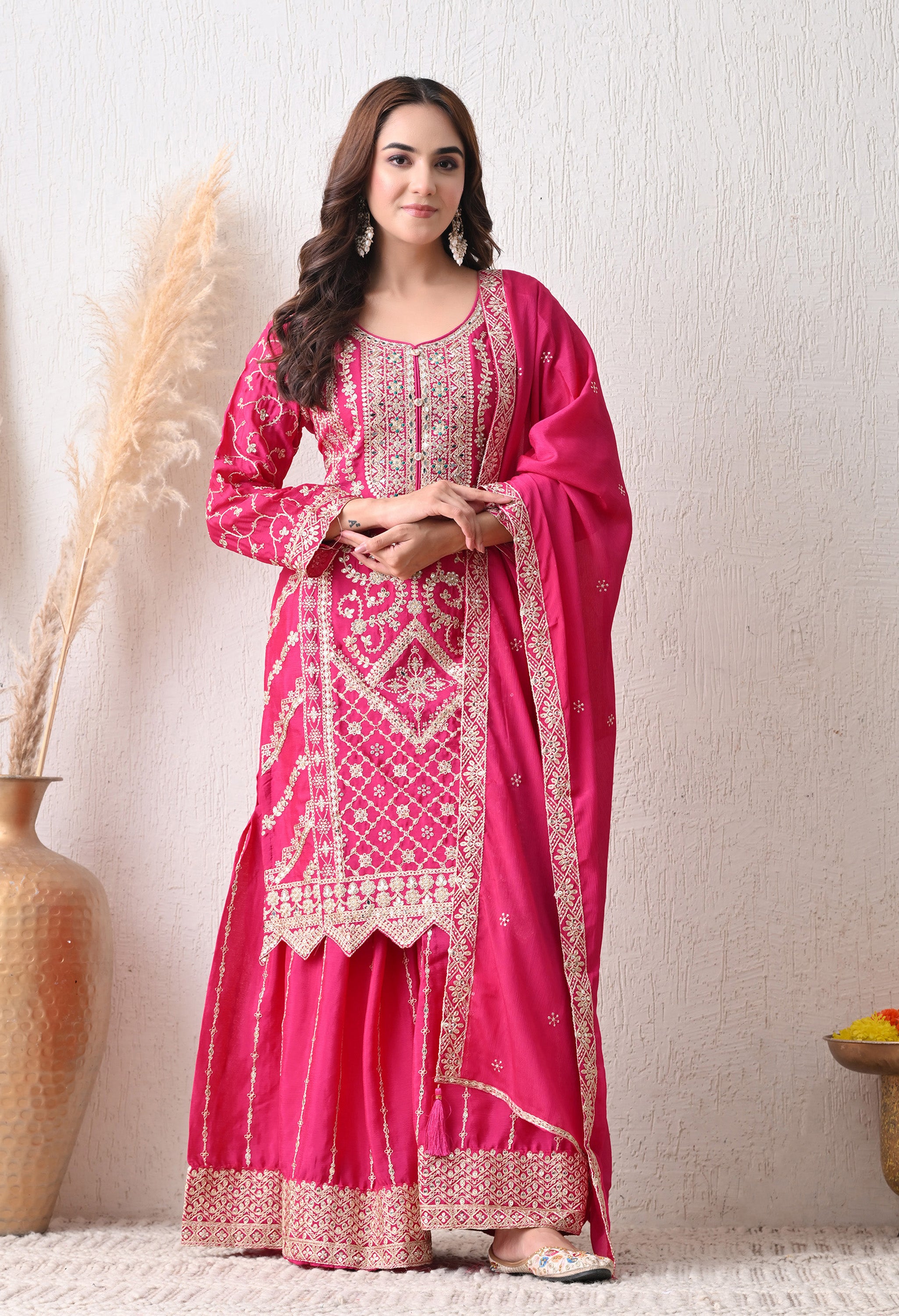 Step into regal elegance with the Sunehri Chandni Embroidered Suit Set. Featuring a rich rani pink hue adorned with intricate white thread embroidery, this outfit blends traditional craftsmanship with a contemporary silhouette. The embellished borders and ornate patterns on the kameez and sharara-style bottom exude festive charm, while the matching dupatta completes the graceful ensemble. Perfect for weddings, celebrations, and festive occasions where you want to shine
