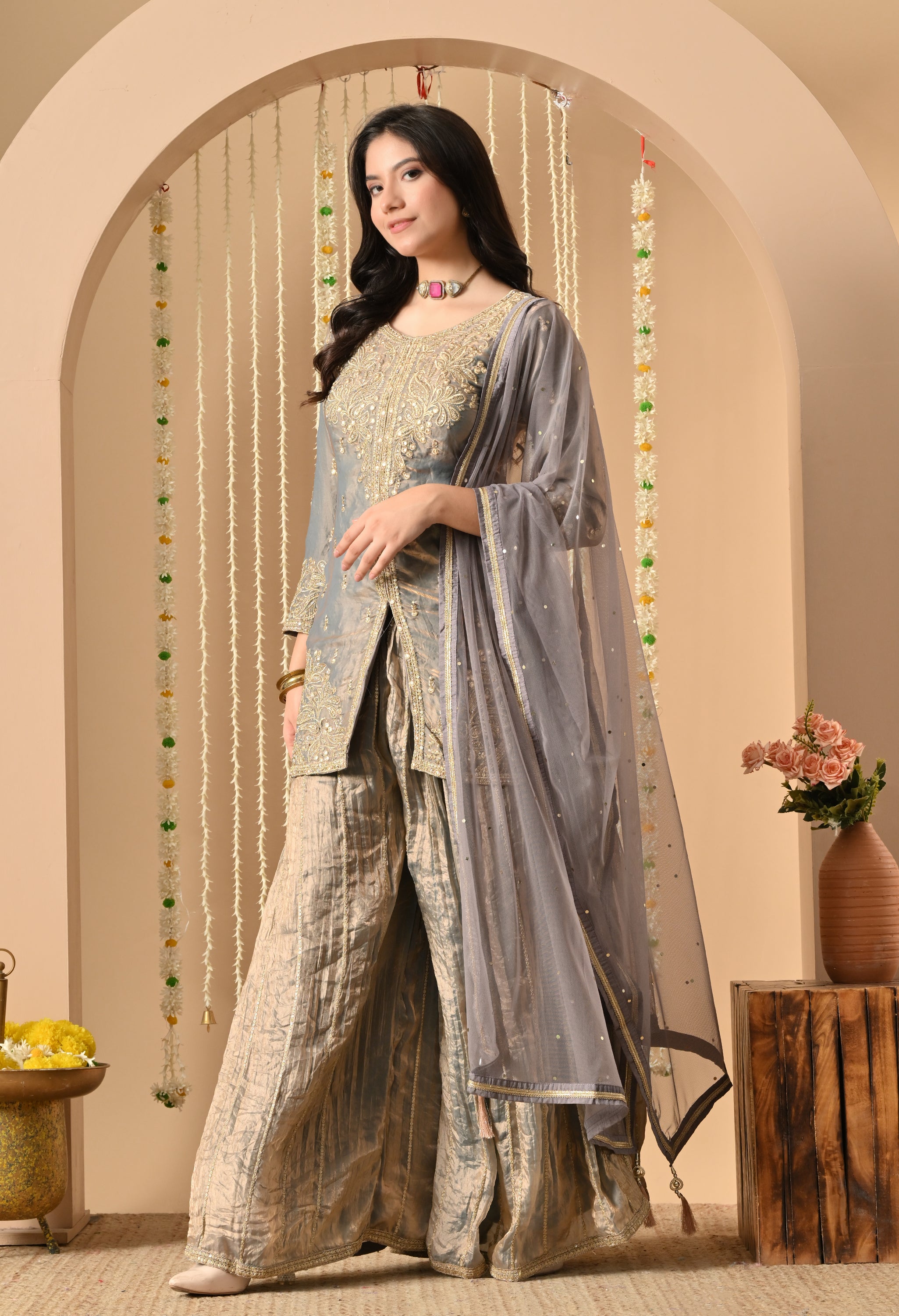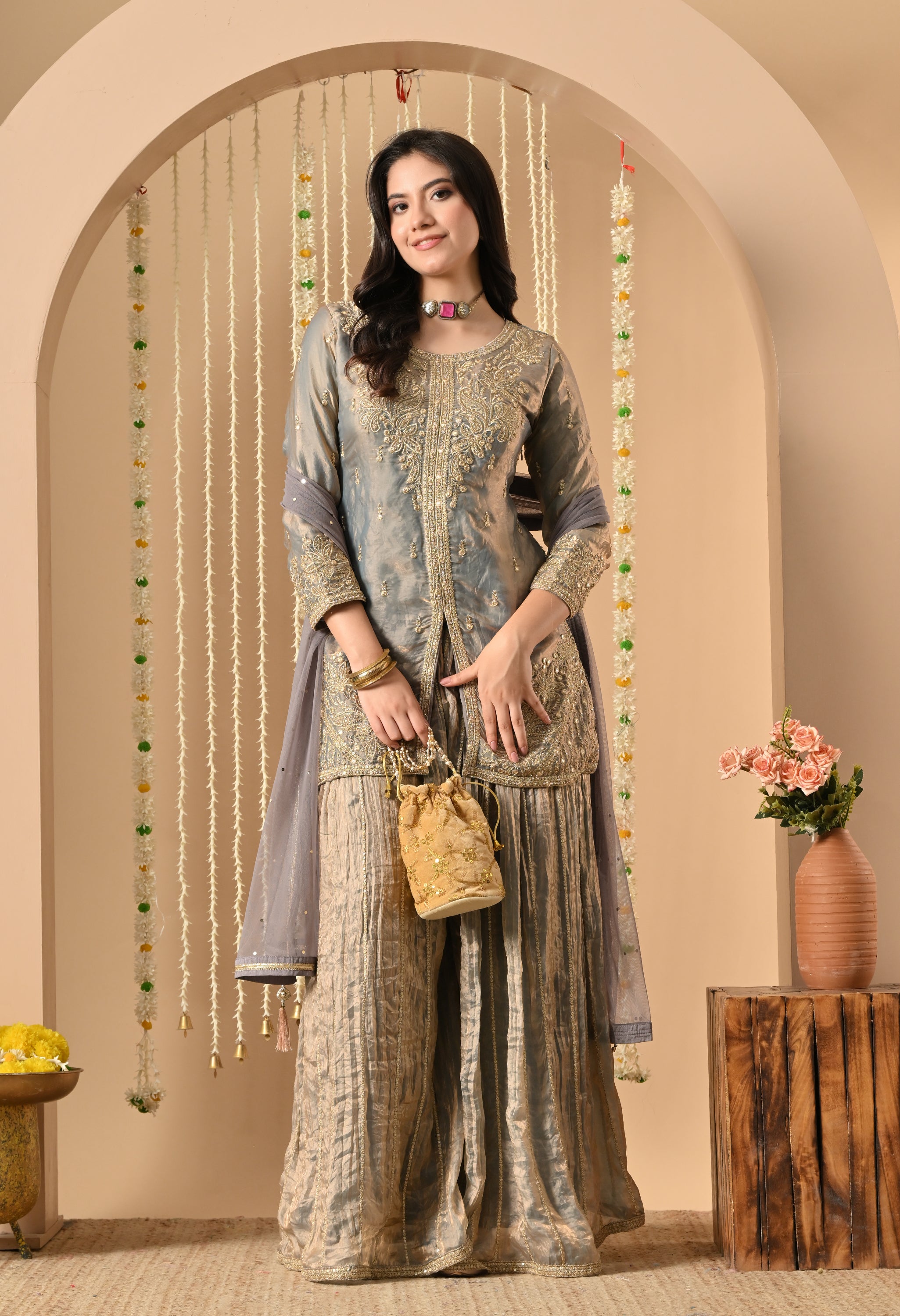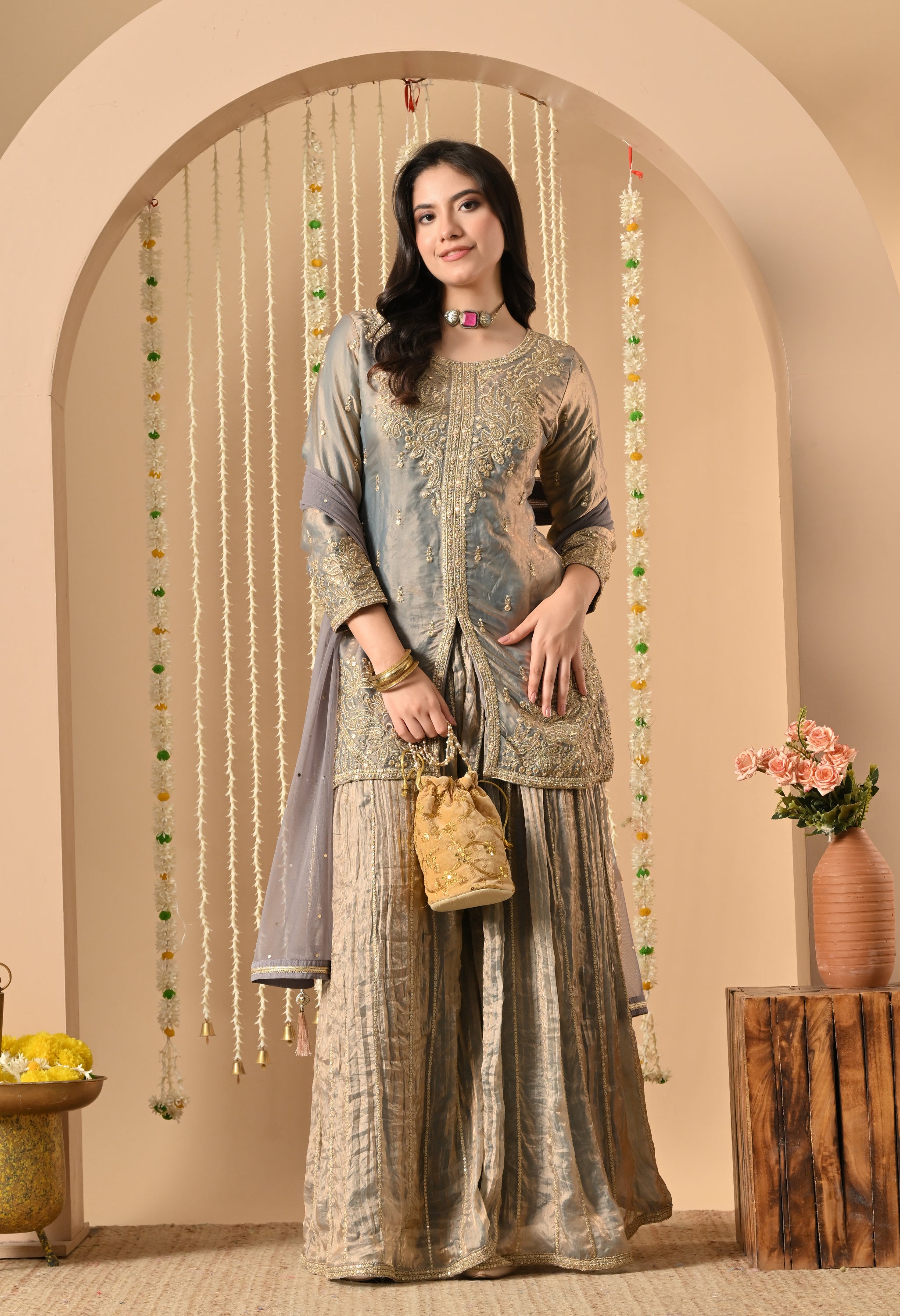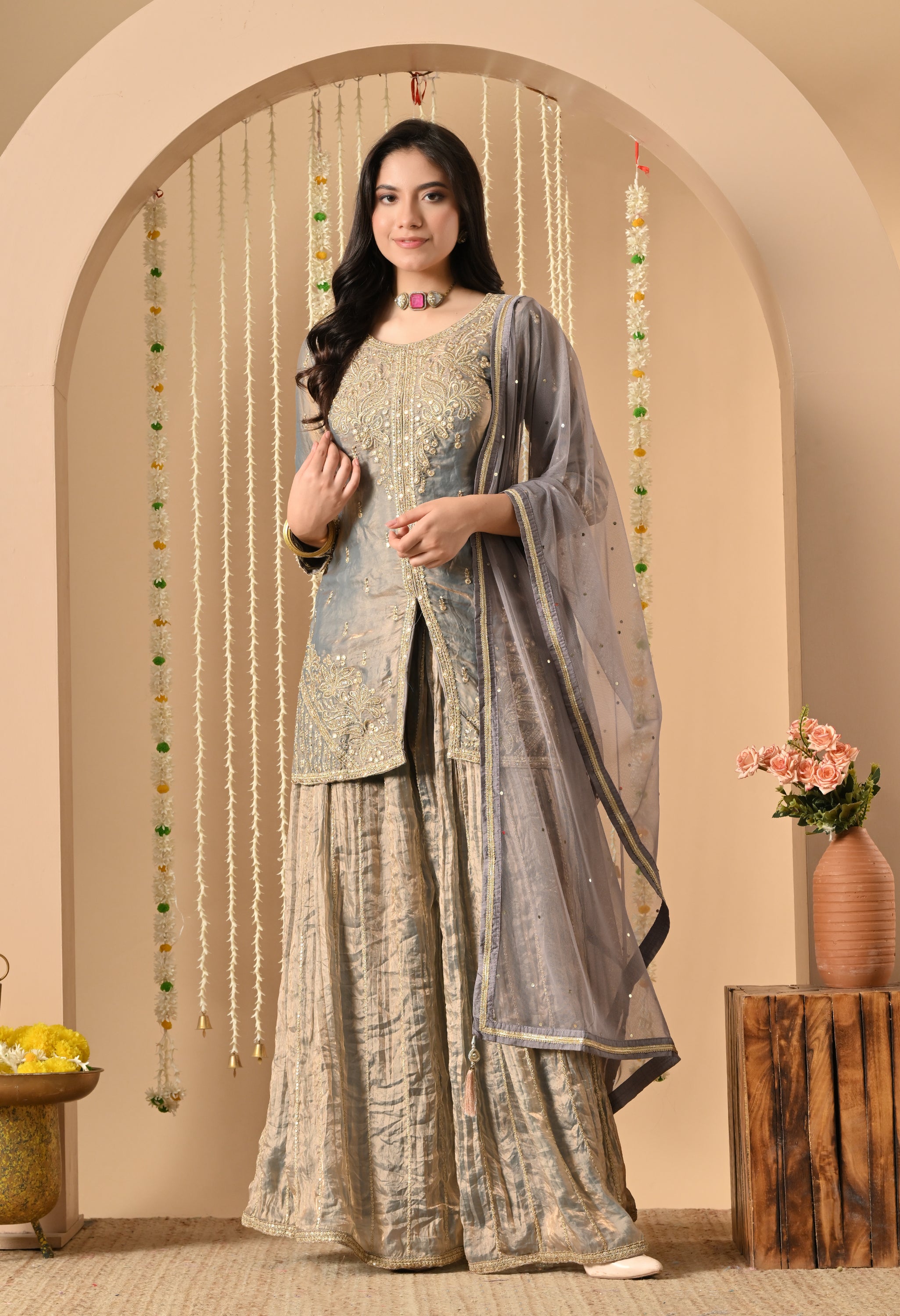 Grace your festive occasions with this ethereal sage green embroidered sharara suit set that exudes timeless elegance and sophistication.Crafted from lightweight organza fabric, the outfit features intricate golden zari and sequin embroidery on the kurta and hemline, paired with a matching flared sharara and sheer dupatta. Perfect for weddings, festive celebrations, or special evening gatherings, this ensemble radiates understated luxury.