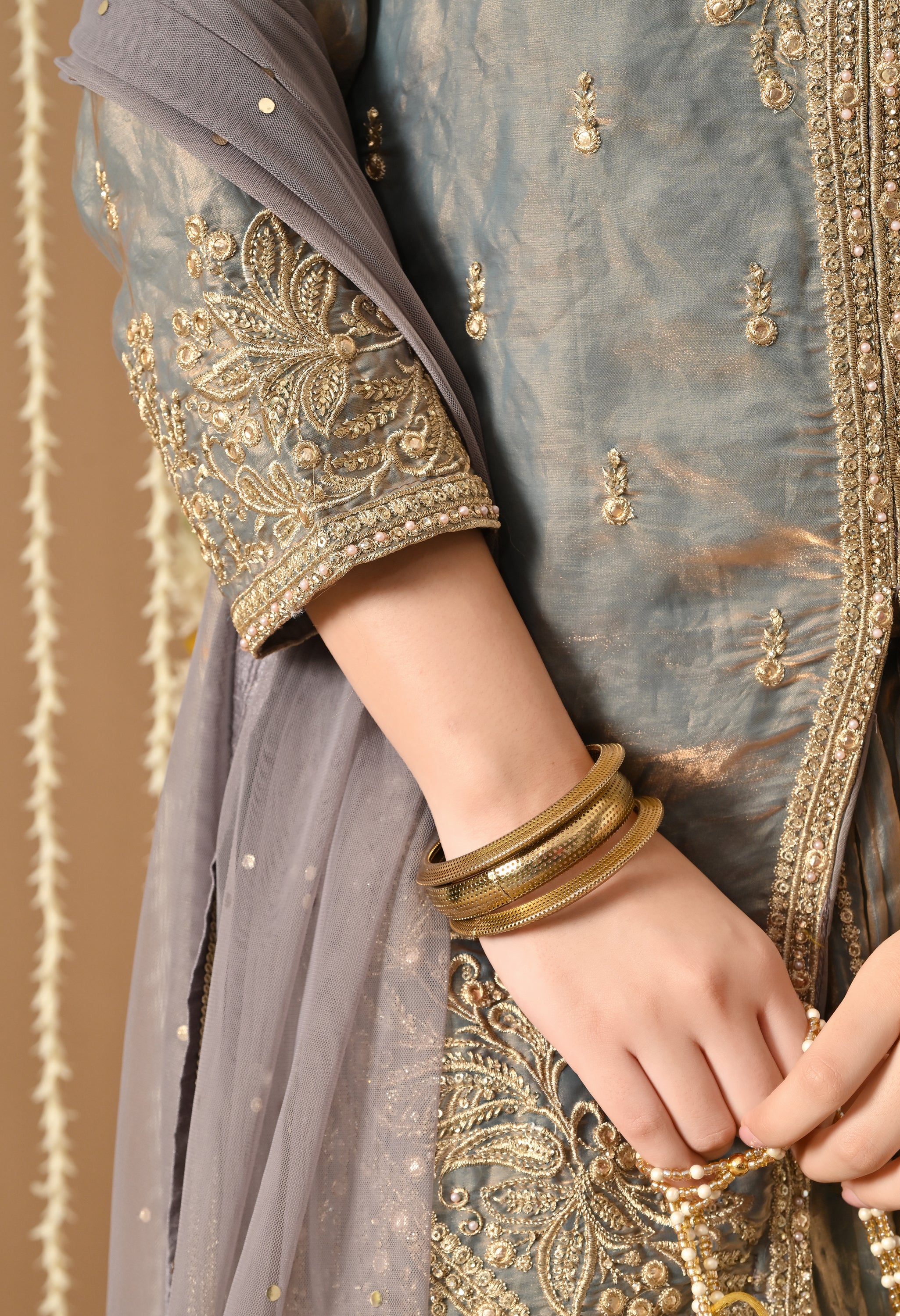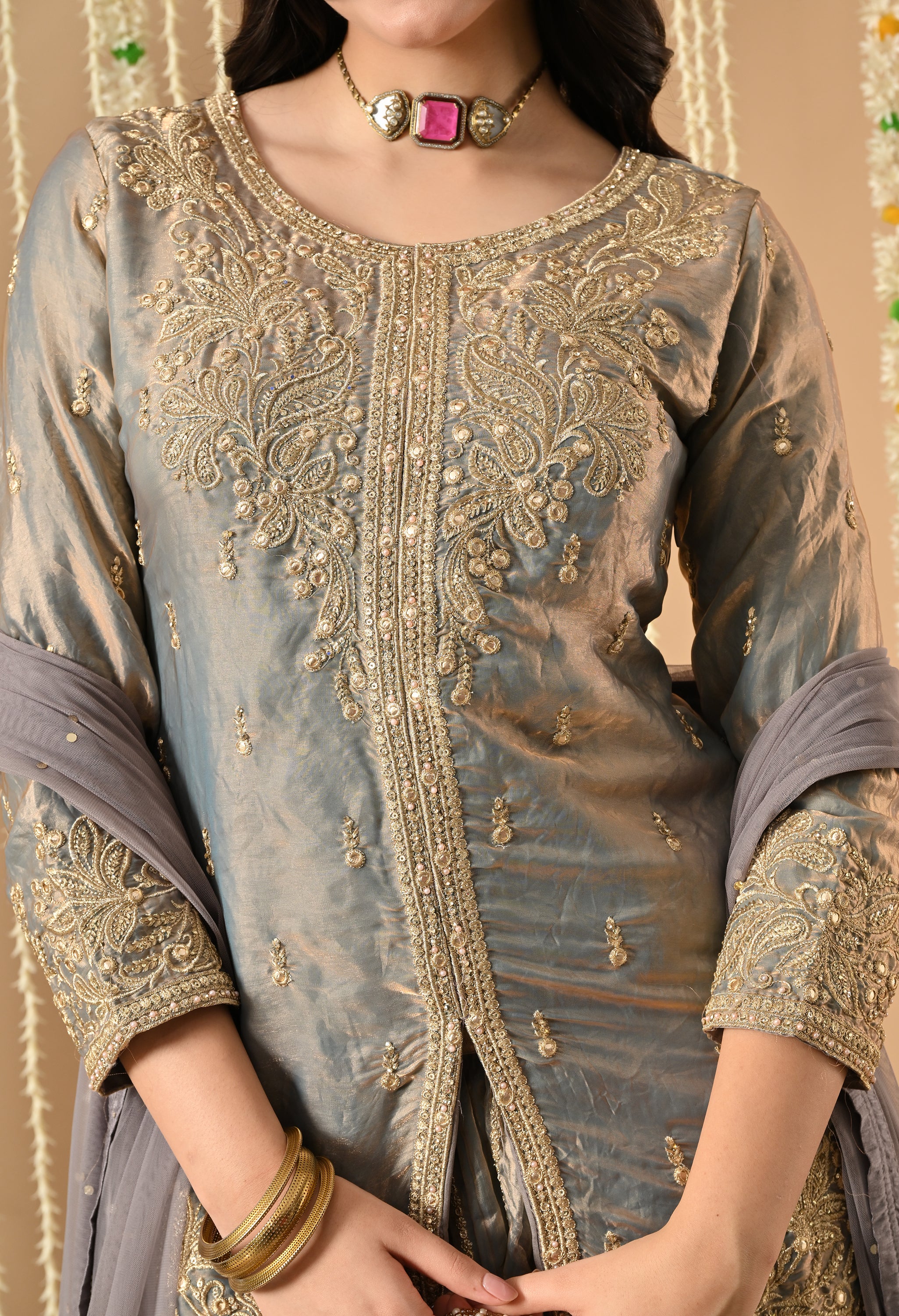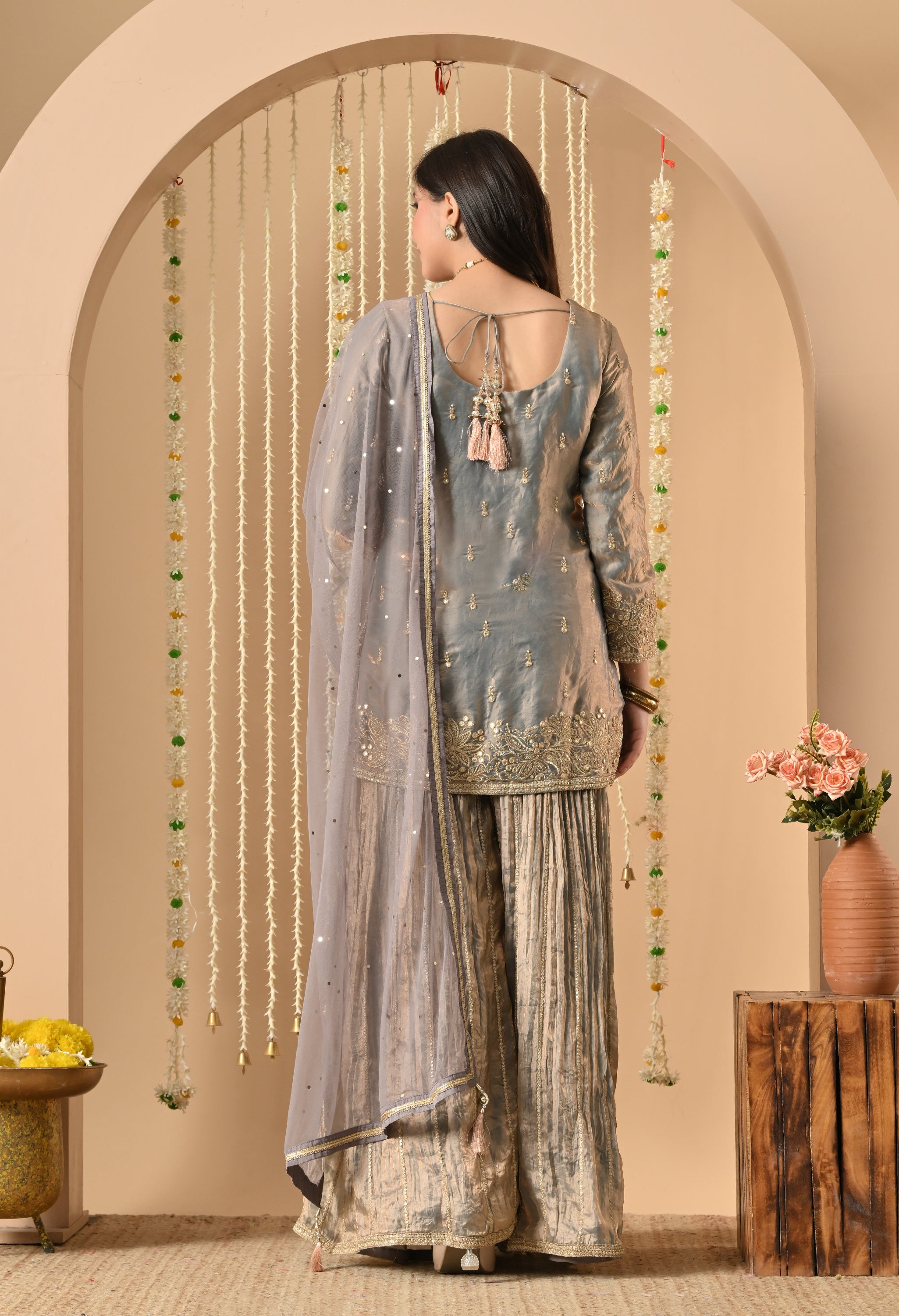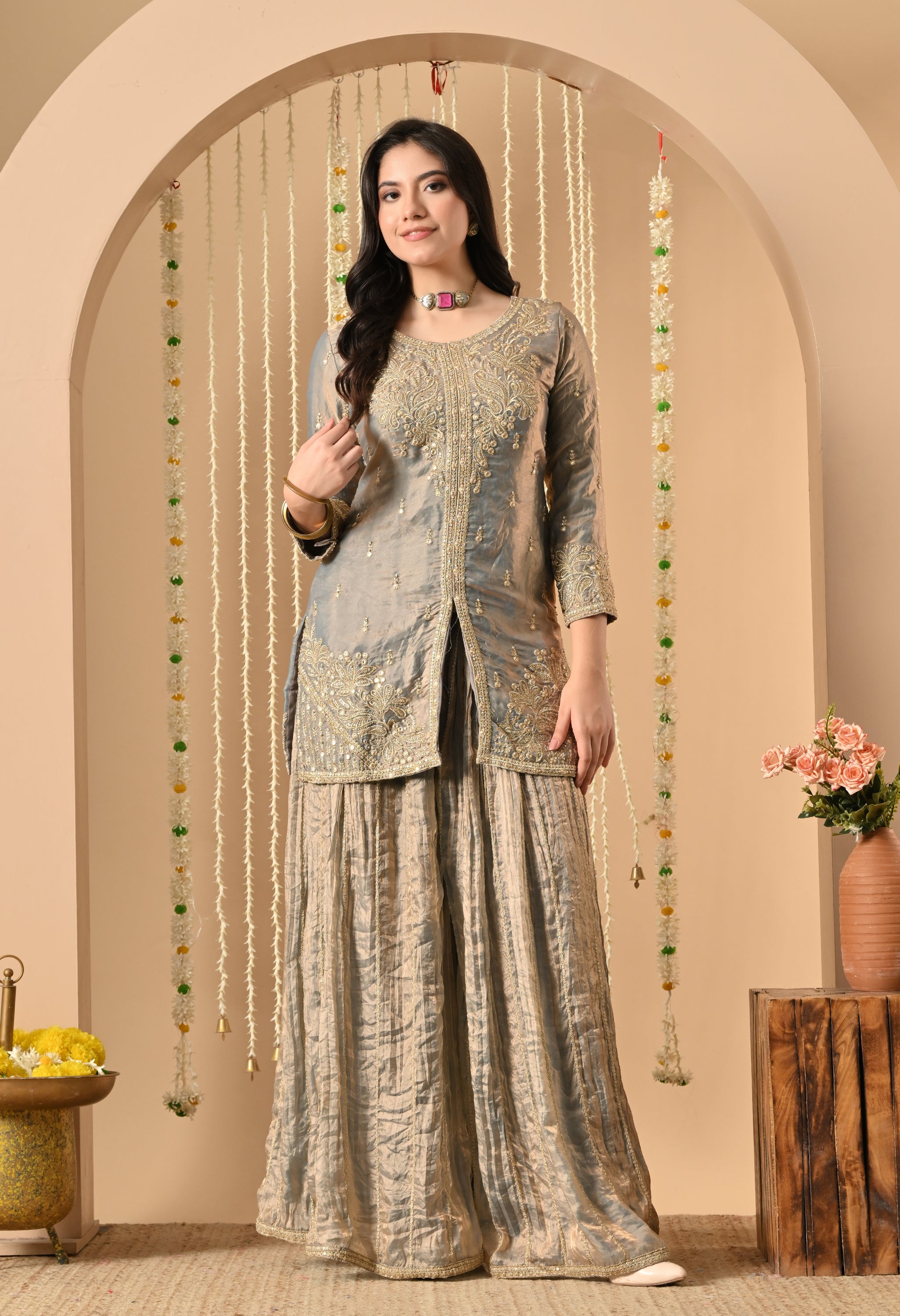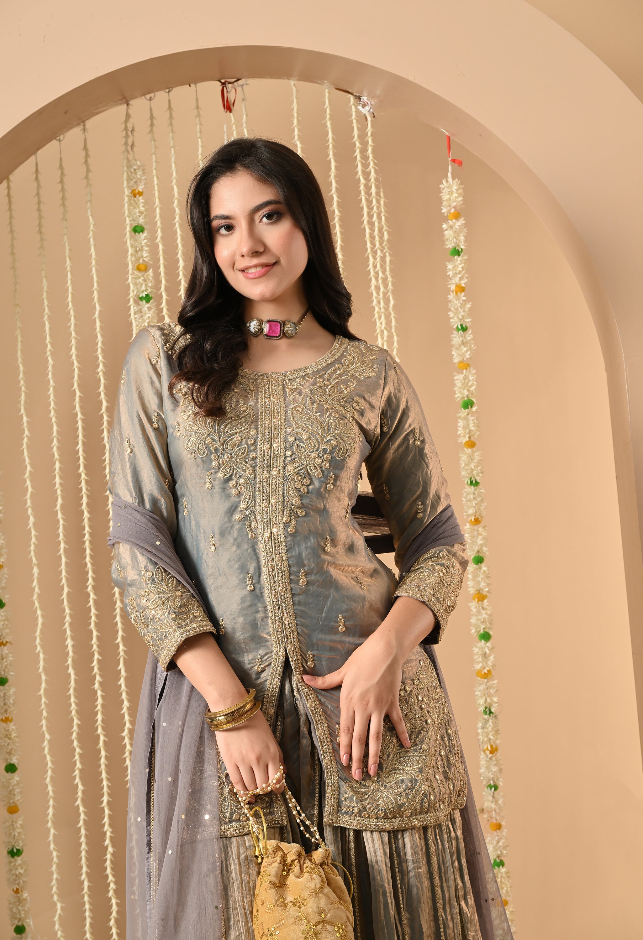 Grace your festive occasions with this ethereal sage green embroidered sharara suit set that exudes timeless elegance and sophistication.Crafted from lightweight organza fabric, the outfit features intricate golden zari and sequin embroidery on the kurta and hemline, paired with a matching flared sharara and sheer dupatta. Perfect for weddings, festive celebrations, or special evening gatherings, this ensemble radiates understated luxury.